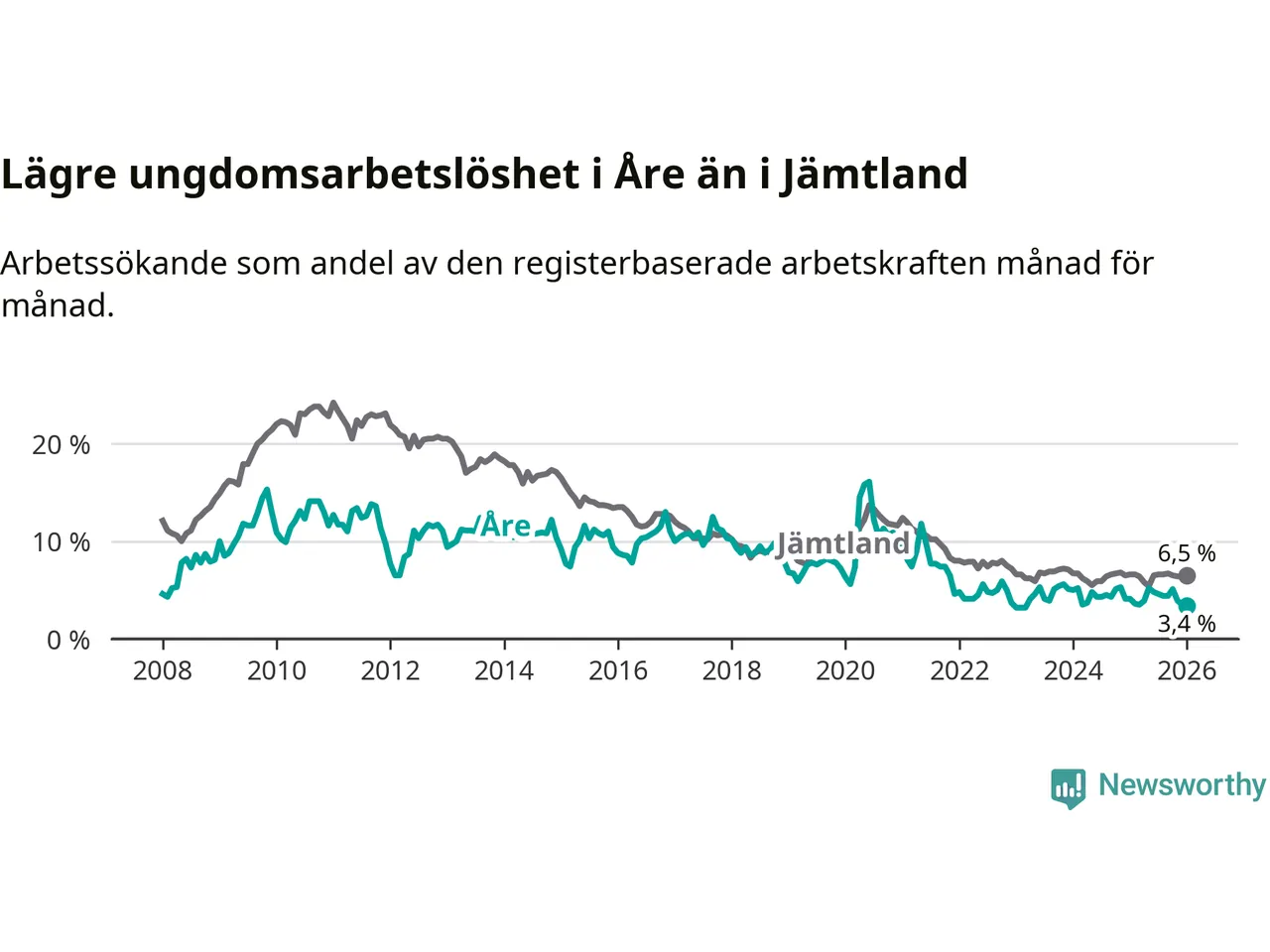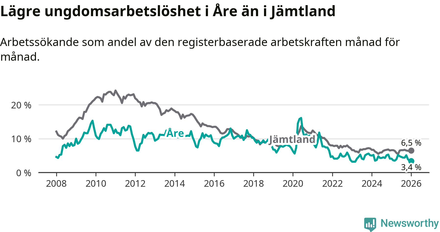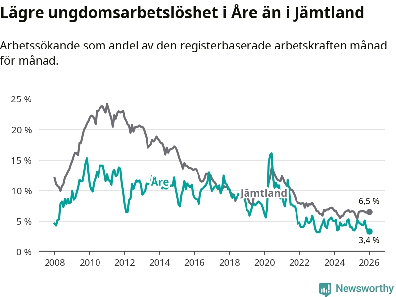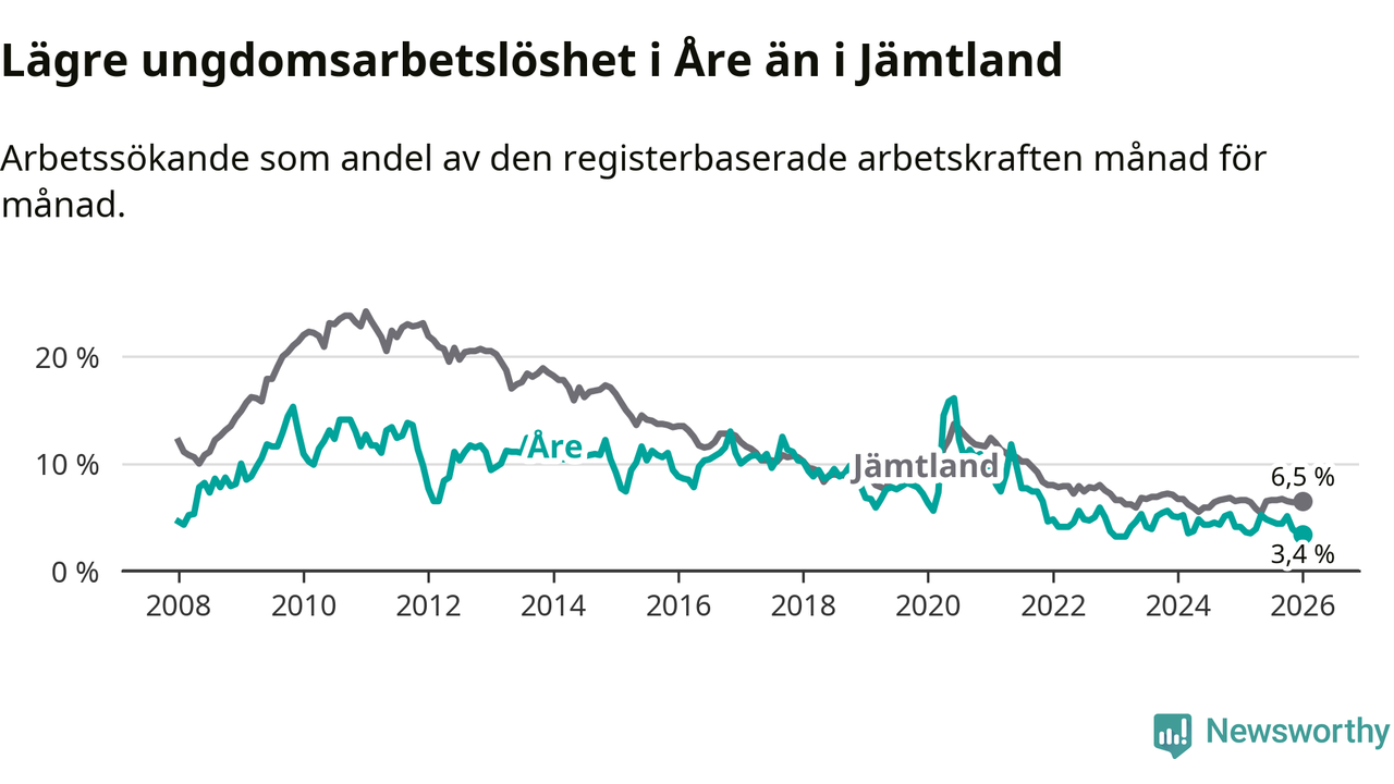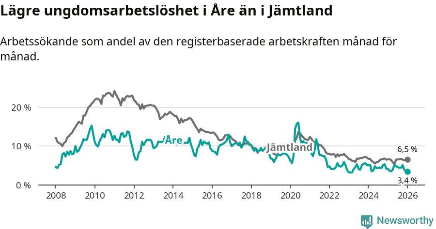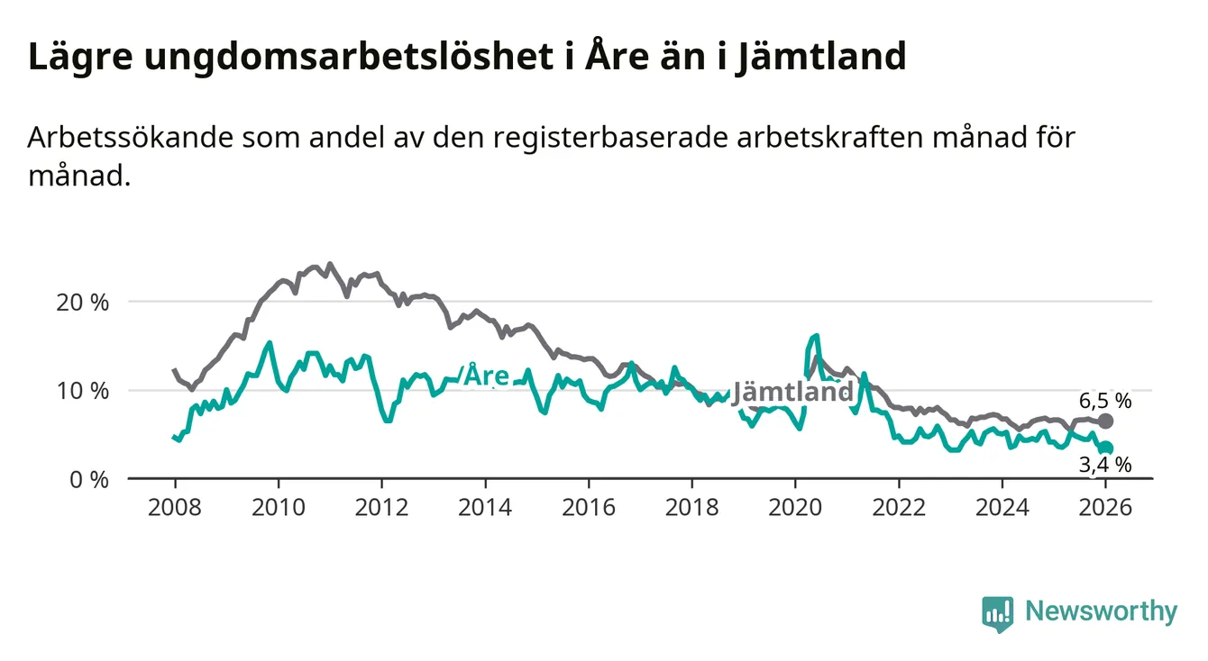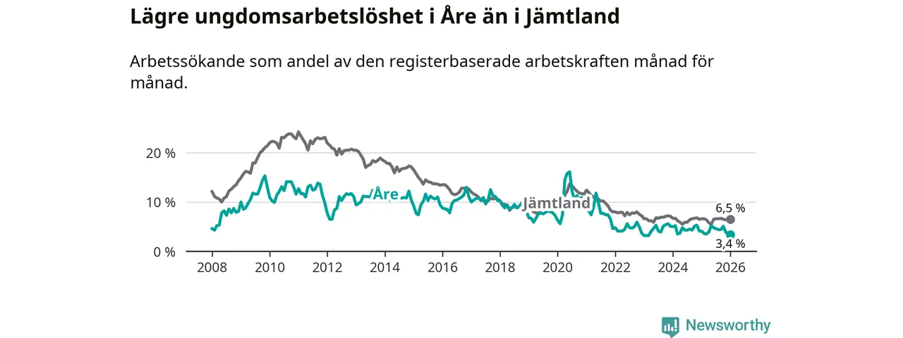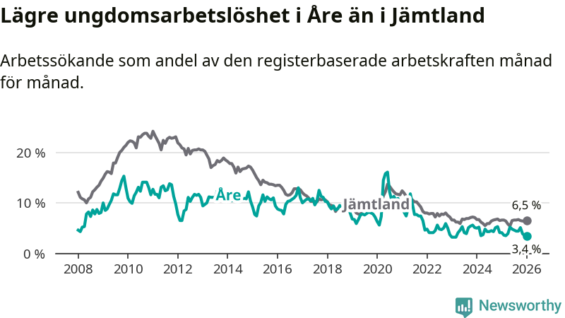 Precis som den totala arbetslösheten ligger ungdomsarbetslösheten i Åre lägre än i Jämtland som helhet. Skillnaden mellan kommunen och länet är 3,1 procentenheter.