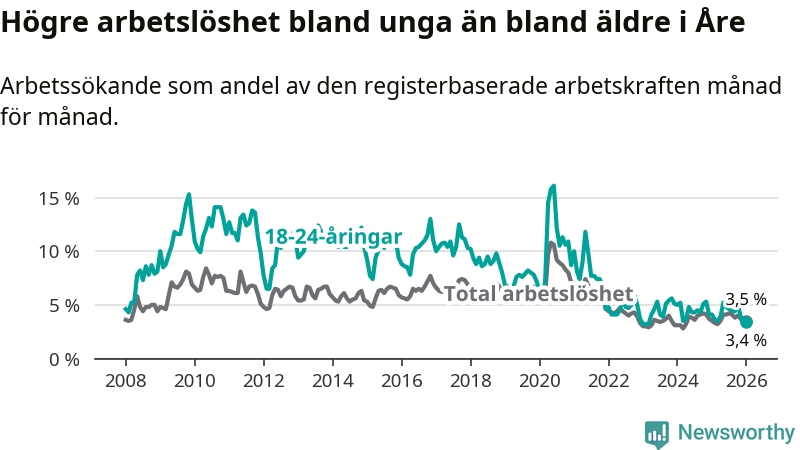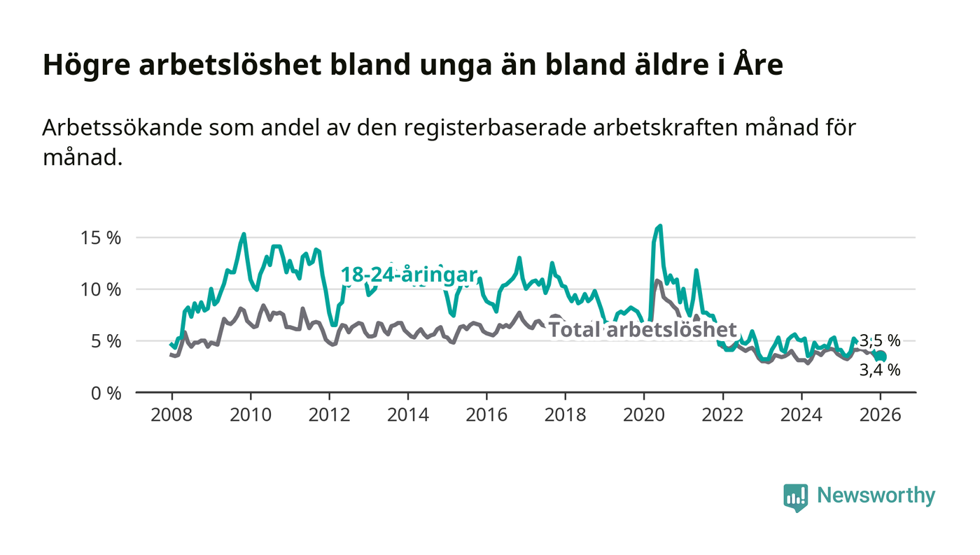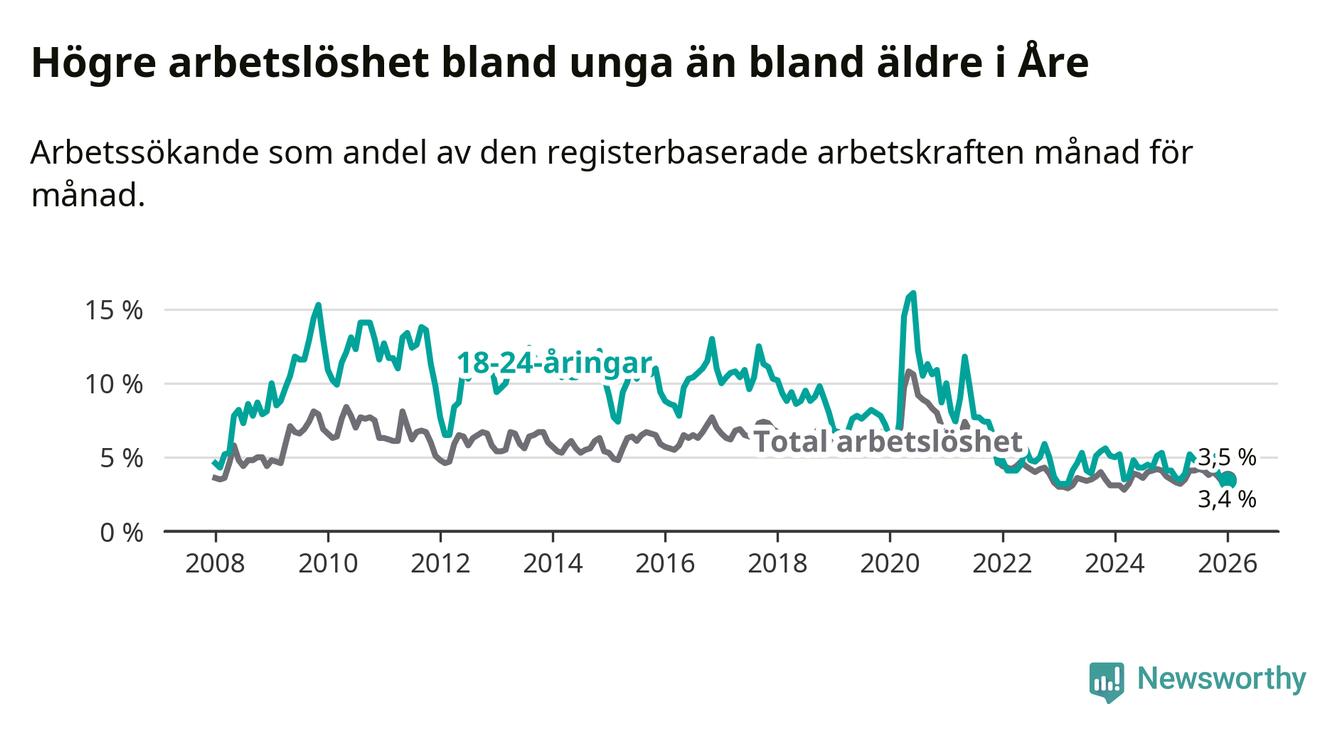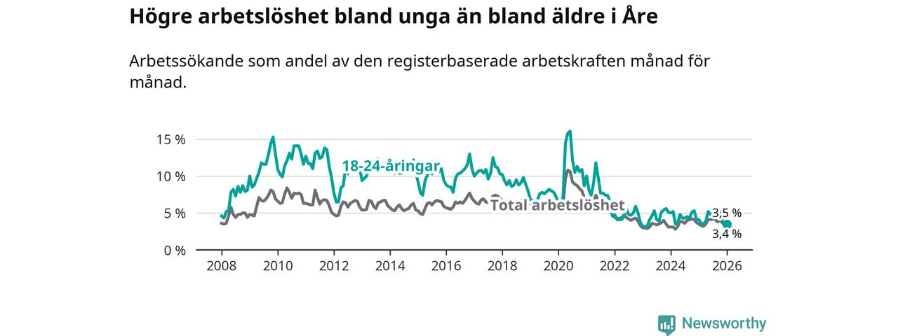 I januari var 3,4 procent av 18–24-åringarna inskrivna som arbetssökande (motsvarande 21 personer). Mäter vi antalet inskrivna ser vi en minskning med fyra personer på ett års sikt.