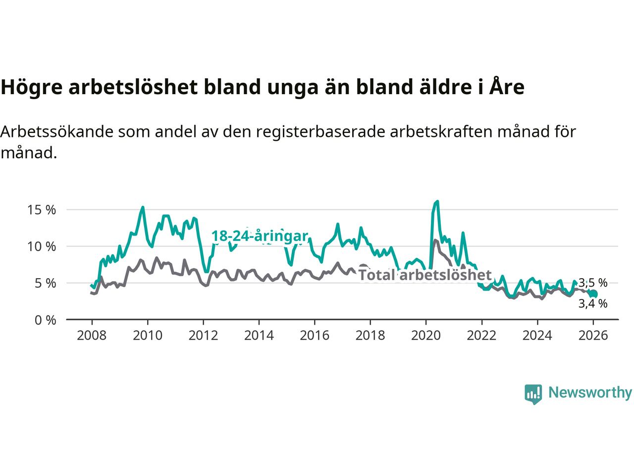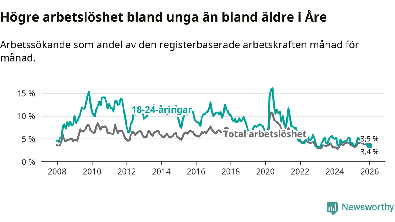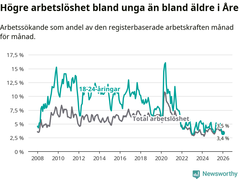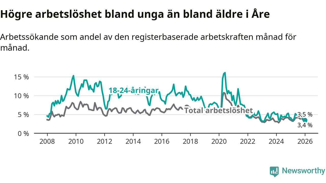 I januari var 3,4 procent av 18–24-åringarna inskrivna som arbetssökande (motsvarande 21 personer). Mäter vi antalet inskrivna ser vi en minskning med fyra personer på ett års sikt.
