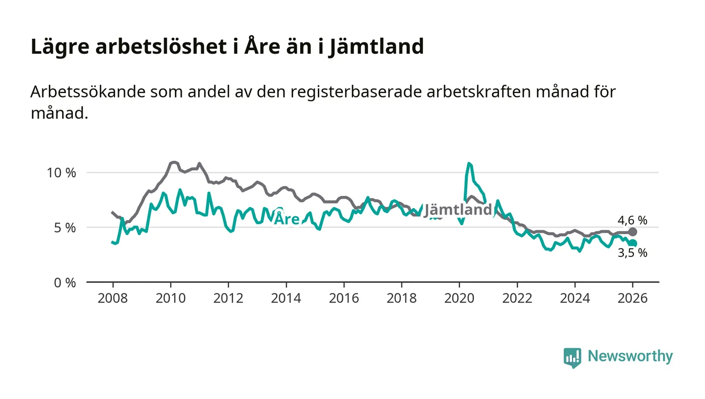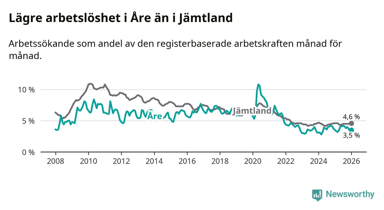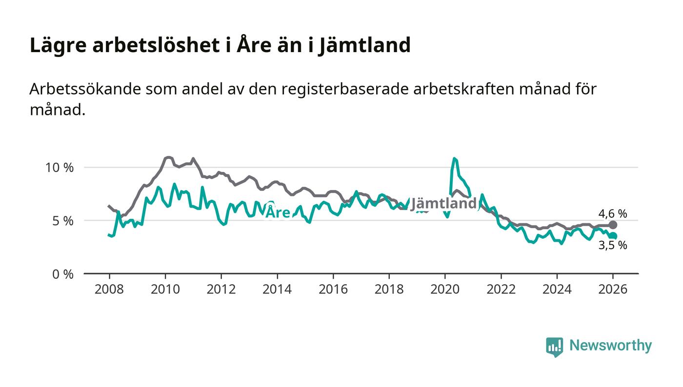 Arbetslösheten i Åre ligger under nivån i hela Jämtlands län (3,5 procent i kommunen, jämfört med 4,6 procent i hela länet). Krokom har den lägsta arbetslösheten i länet (3,2 procent), medan Strömsund har den högsta (6,4 procent). För att Åre skulle komma ner i samma arbetslöshetsnivå som Krokom skulle 21 personer behöva sysselsättas.