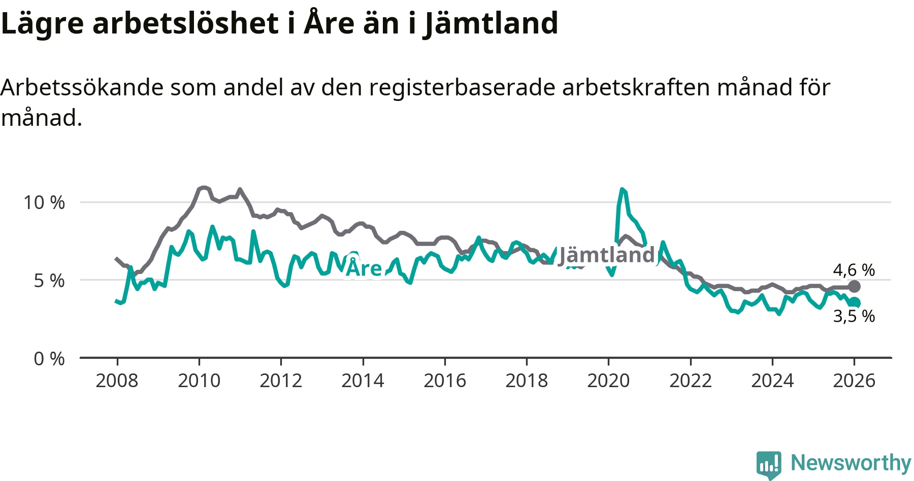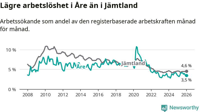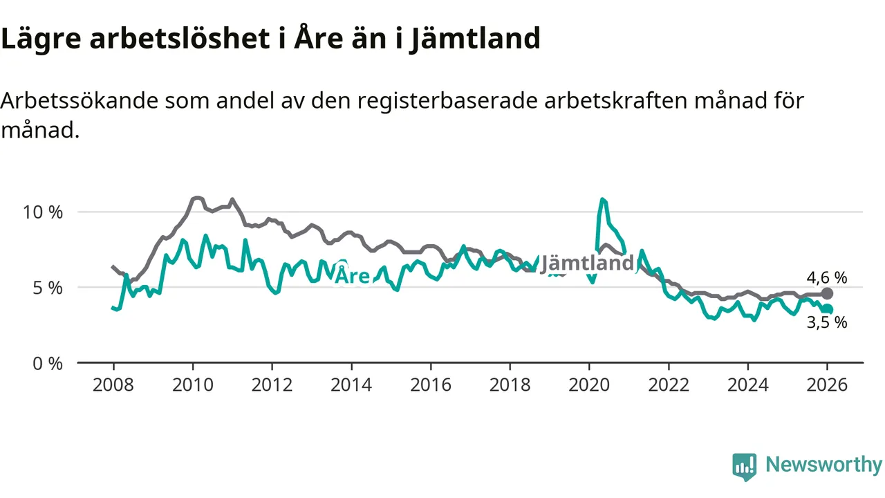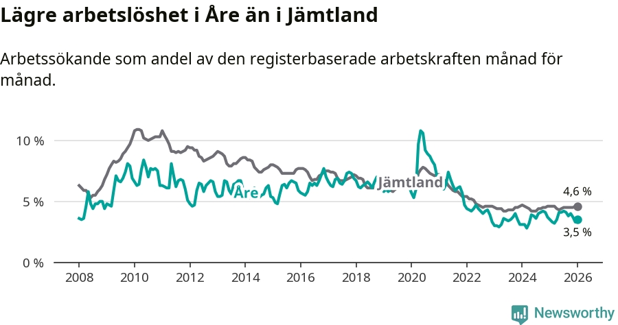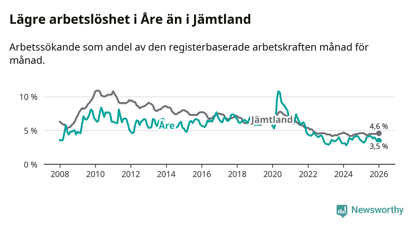 Arbetslösheten i Åre ligger under nivån i hela Jämtlands län (3,5 procent i kommunen, jämfört med 4,6 procent i hela länet). Krokom har den lägsta arbetslösheten i länet (3,2 procent), medan Strömsund har den högsta (6,4 procent). För att Åre skulle komma ner i samma arbetslöshetsnivå som Krokom skulle 21 personer behöva sysselsättas.