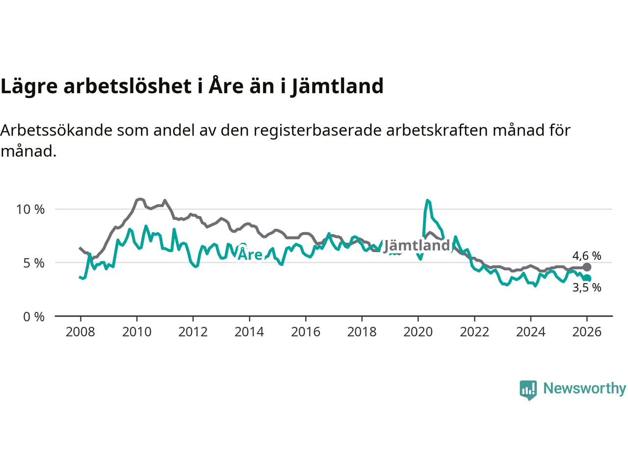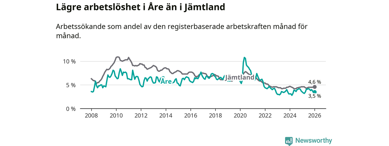 I de flesta andra kommuner i länet går arbetslösheten nedåt. Störst är minskningen i Bräcke, där arbetslösheten sjunker med 0,8 procentenheter. I tabellen längre ner ser du utvecklingen i samtliga kommuner i länet.