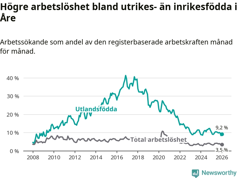 Arbetslösheten bland utlandsfödda var 9,2 procent i Åre under januari månad, motsvarande 81 av 880 personer. Det är 1,1 procentenheter färre än vid samma tidpunkt i fjol (−9 om man räknar personer). Därmed är de utlandsföddas arbetslöshet lägre än vid samma tidpunkt i fjol för tionde månaden i följd.