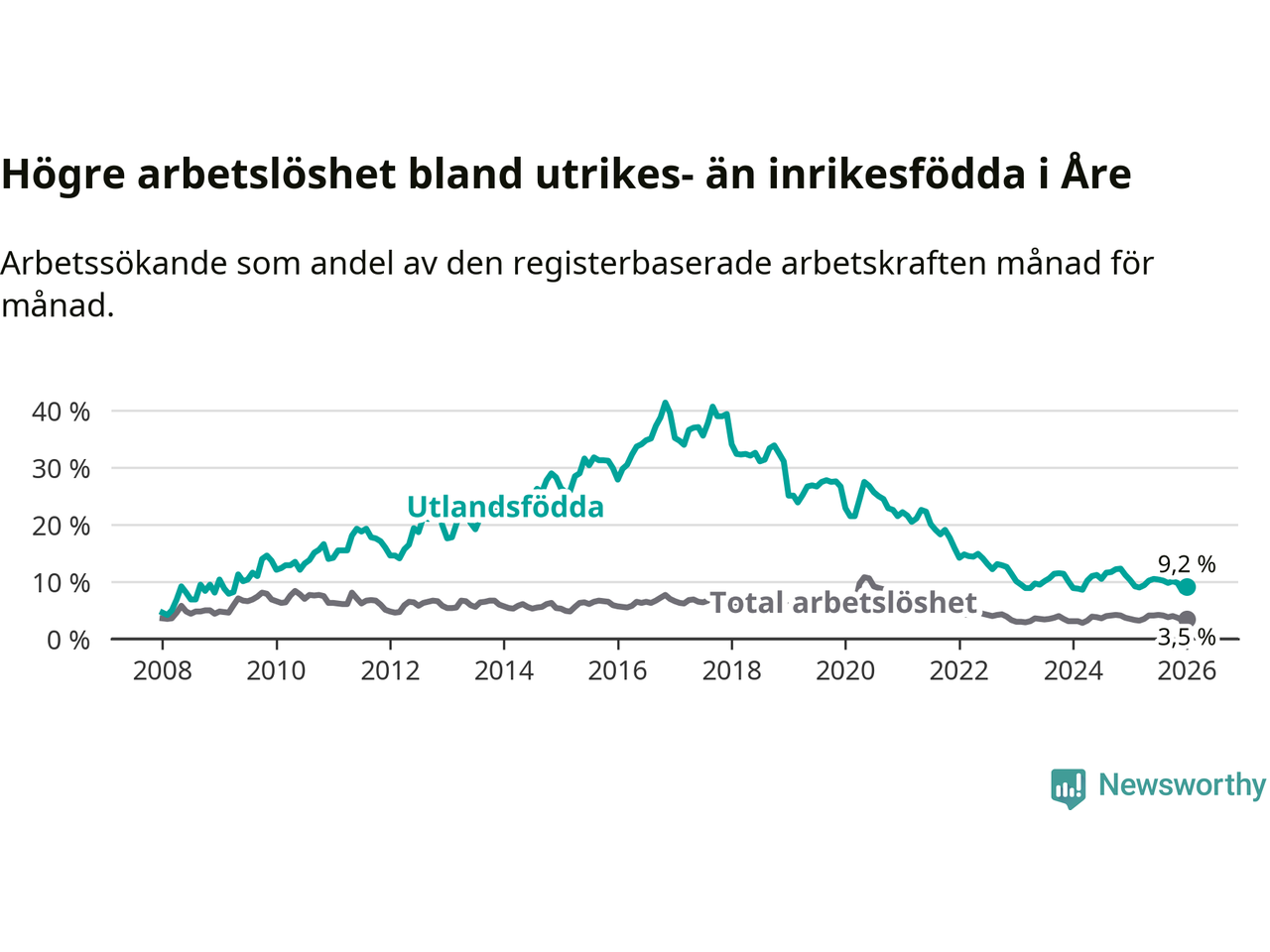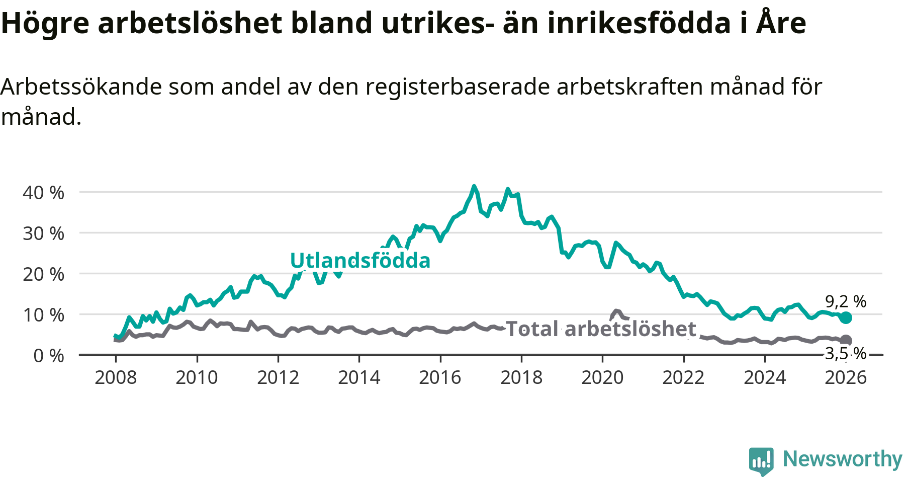 Skillnaden i arbetslöshet mellan utrikesfödda och hela befolkningen är 5,7 procentenheter i Åre. Det är en mindre skillnad än för ett år sedan (−1,1 procentenheter).