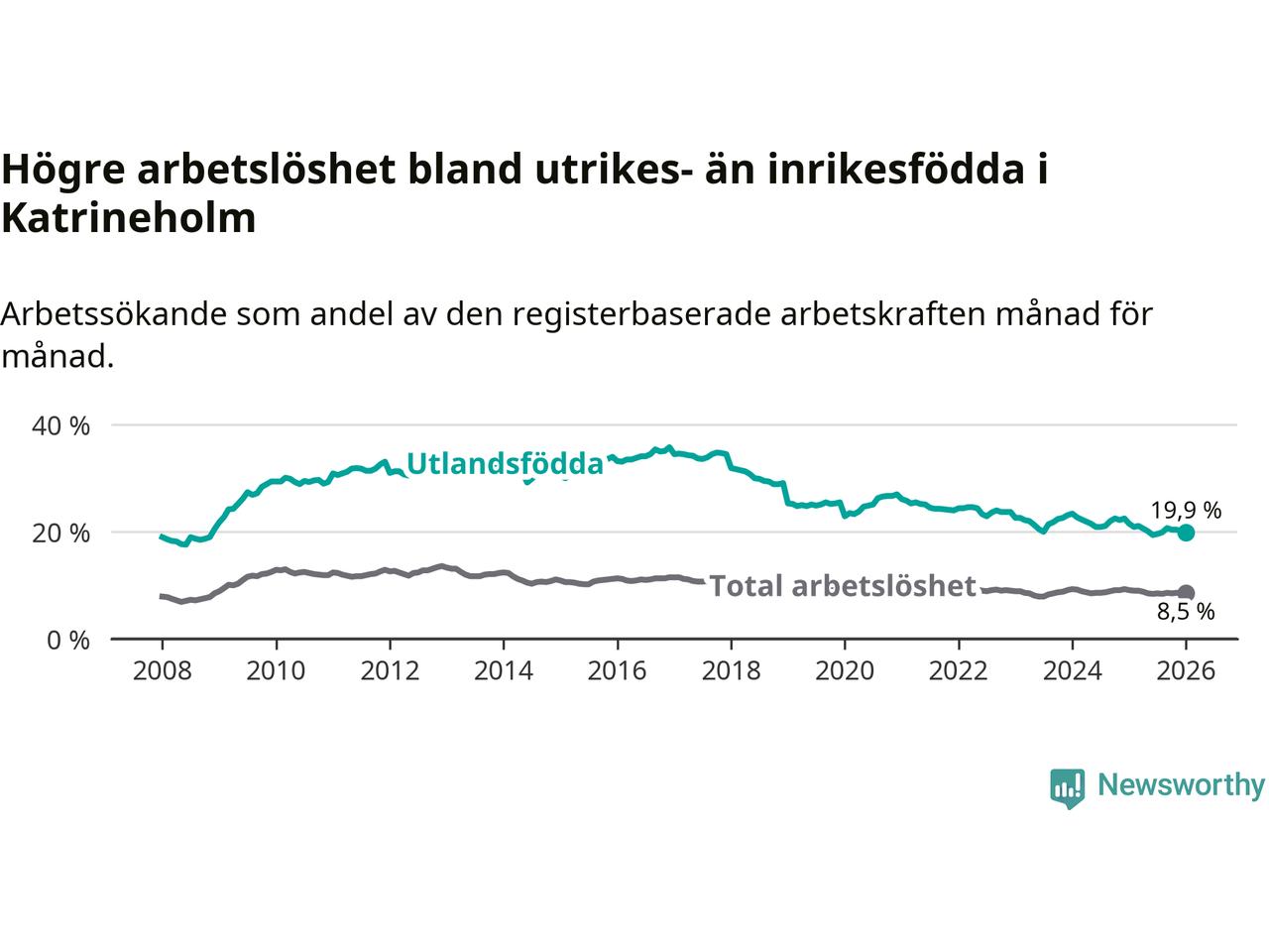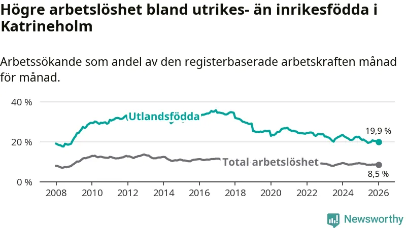 Arbetslösheten bland utlandsfödda var 19,9 procent i Katrineholm under januari månad, motsvarande 770 av 3 869 personer. Det är 1,6 procentenheter färre än vid samma tidpunkt i fjol (−56 om man räknar personer). Därmed är de utlandsföddas arbetslöshet lägre än vid samma tidpunkt i fjol för 15:e månaden i följd. Sedan oktober 2024 har arbetslösheten bland utlandsfödda minskat från 22,5 till 19,9 procent.