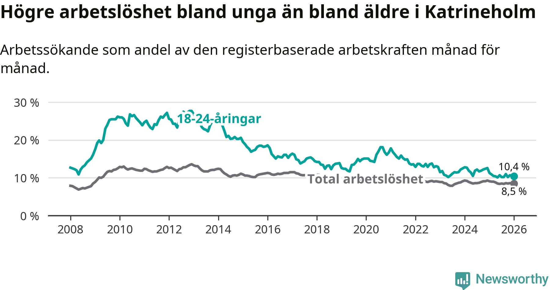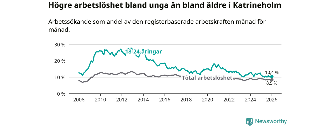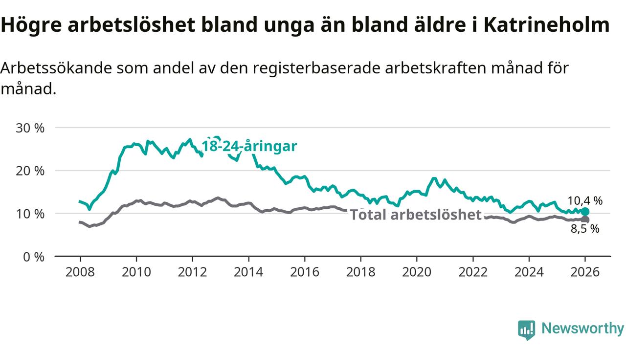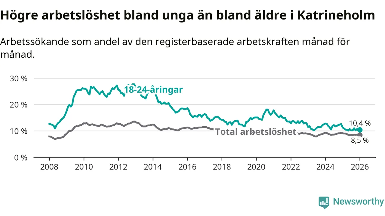 I och med den senaste månadens nedgång har de ungas arbetslöshet i Katrineholm sjunkit 13 månader i följd (ner från 12,6 procent i december 2024 till 10,4 procent nu).