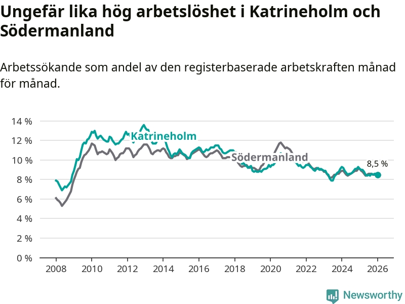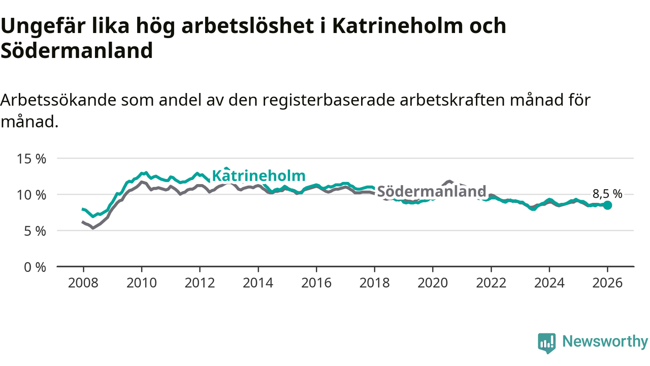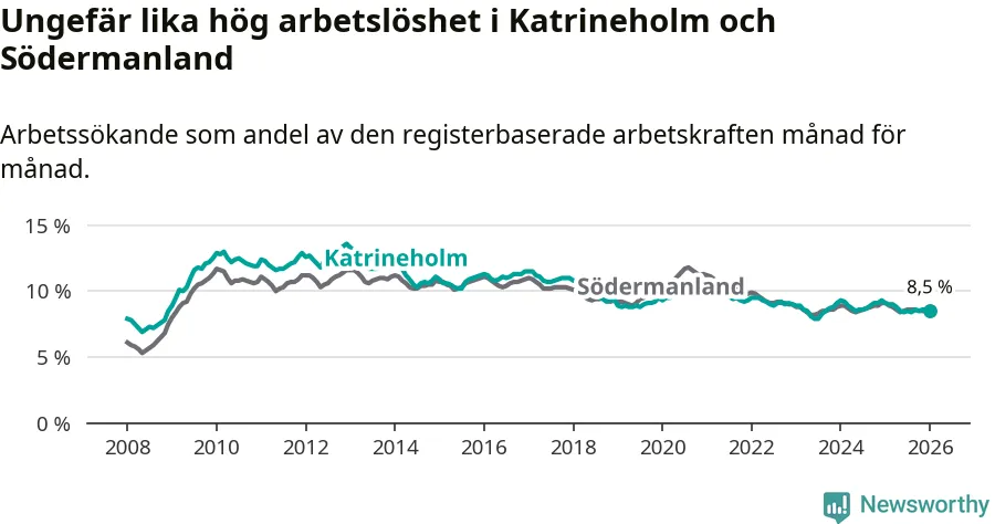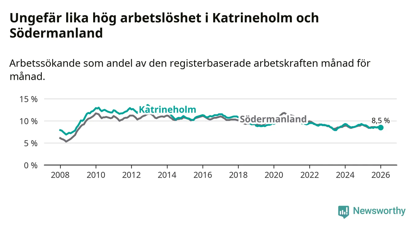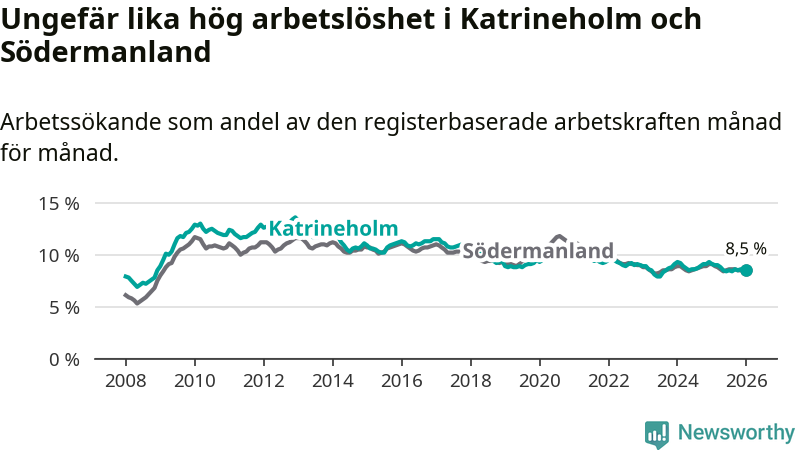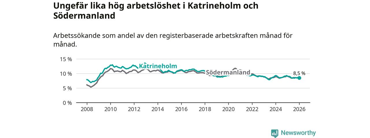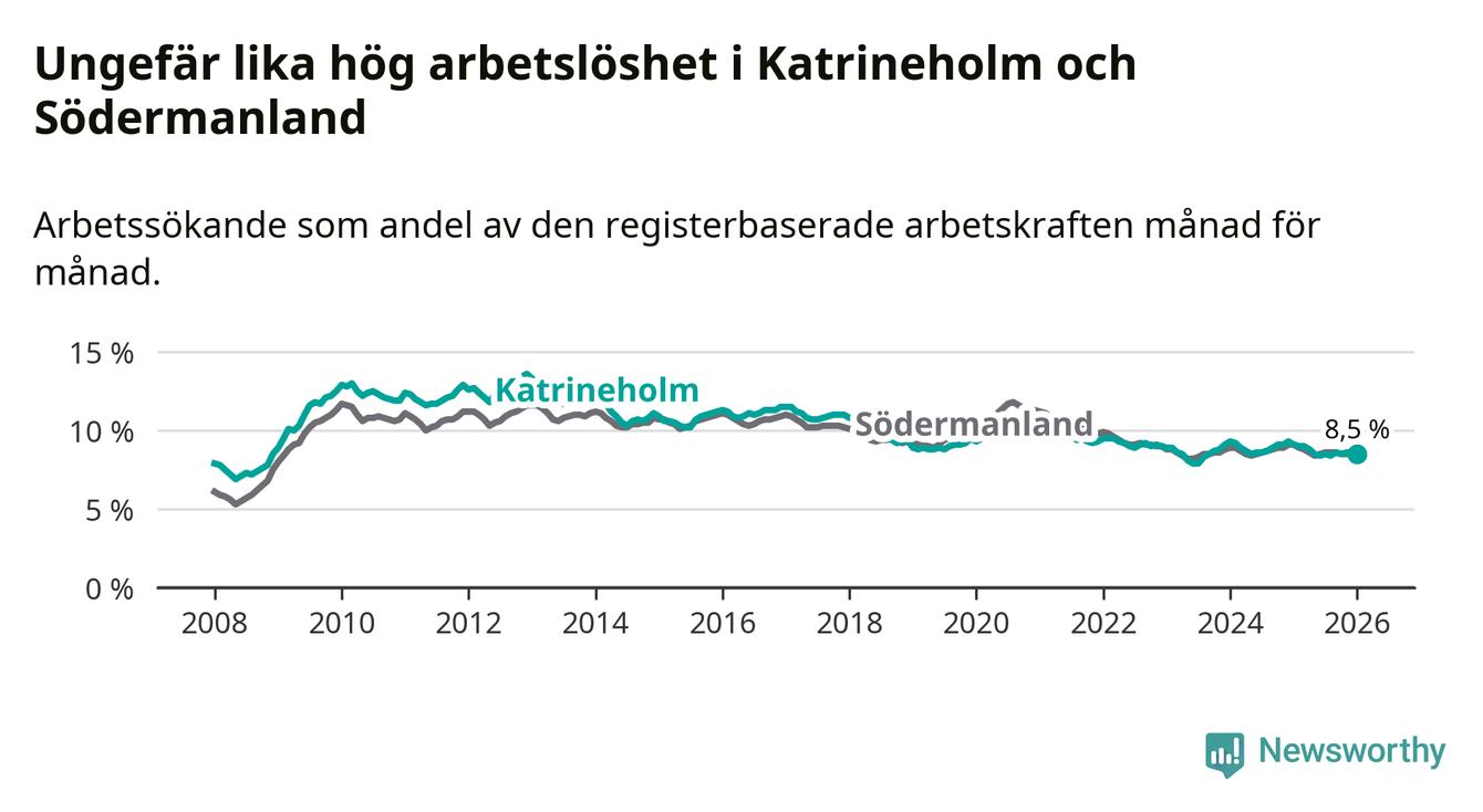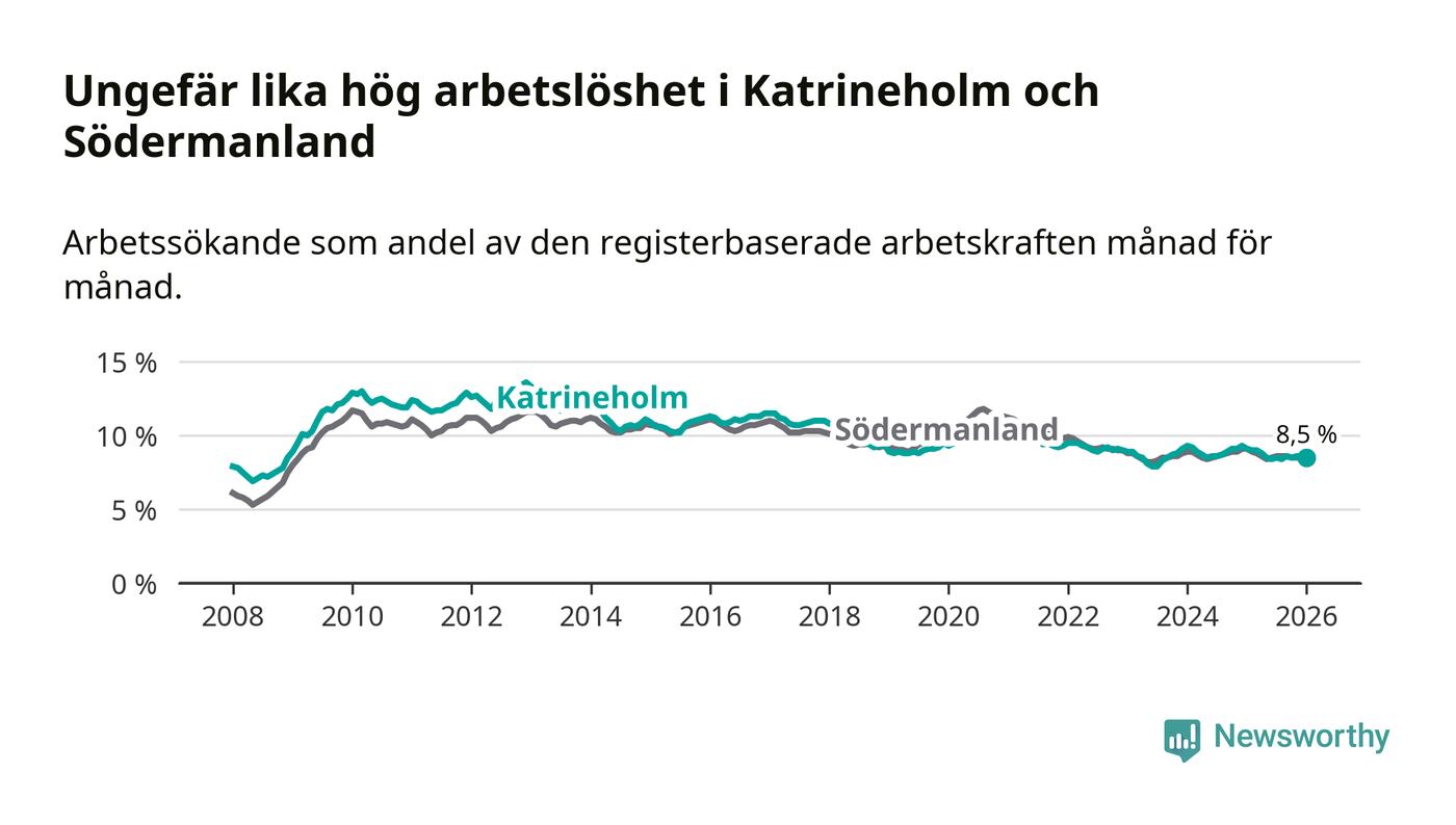 Under januari månad rapporterade Katrineholms kommun en total arbetslöshet på 8,5 procent. Det är en minskning jämfört med samma tidpunkt i fjol (−0,6 procentenheter). Även i Södermanlands län sjunker arbetslösheten .