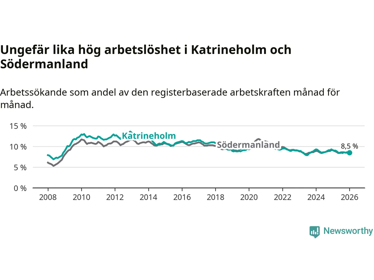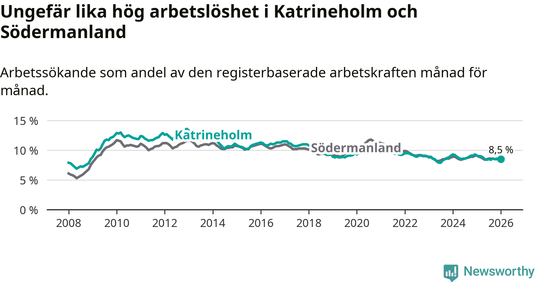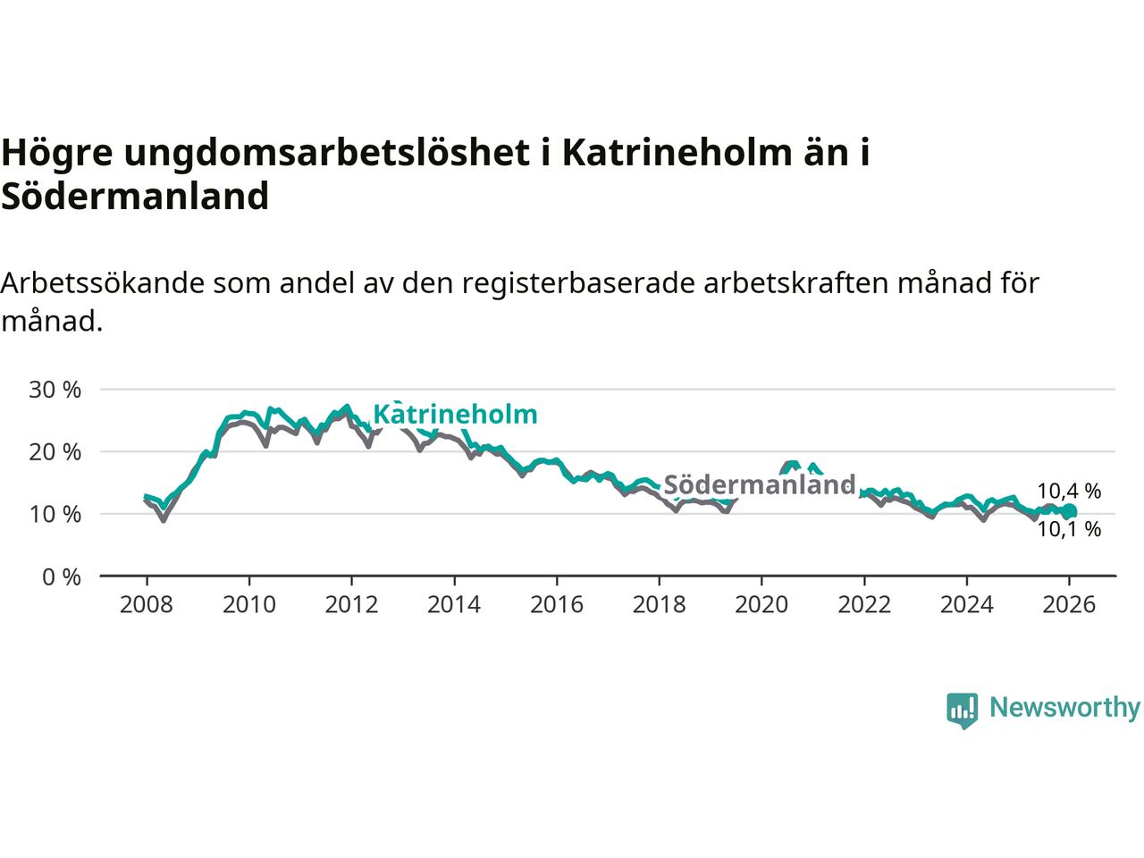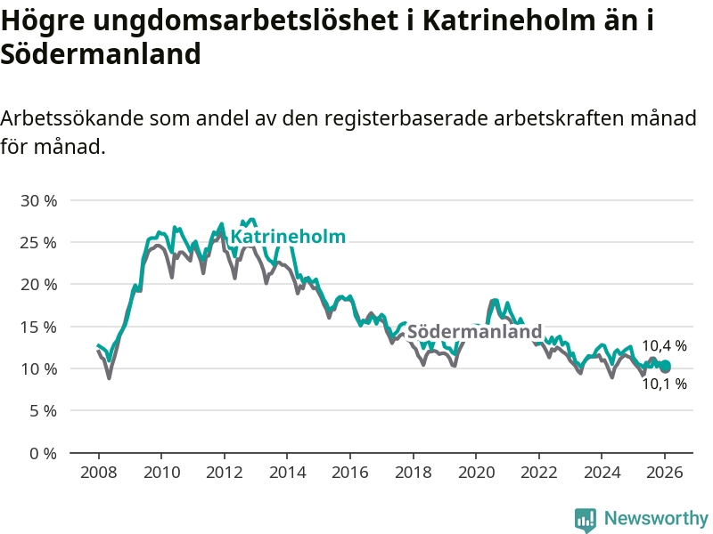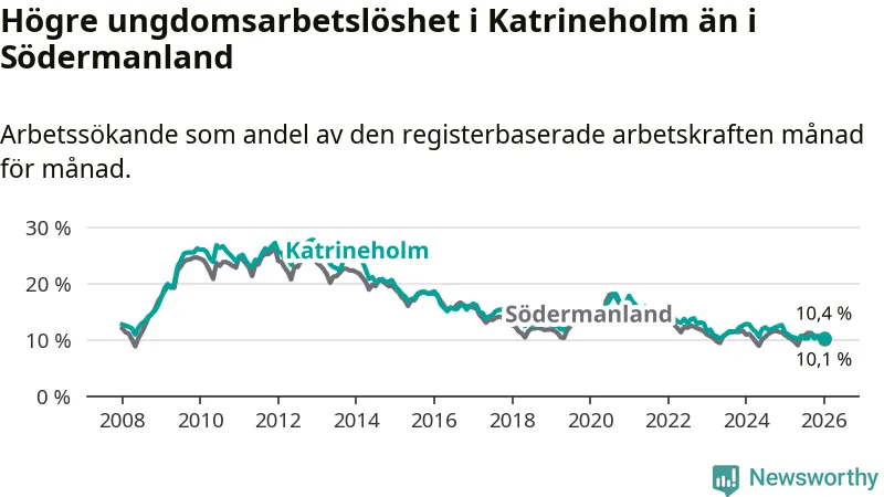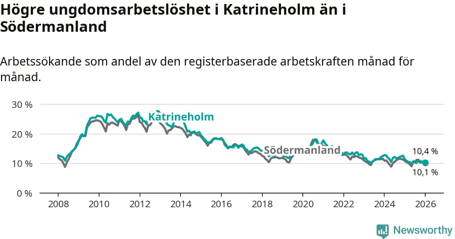 Medan Katrineholm har ungefär samma total arbetslöshet som Södermanland, ligger ungdomsarbetslösheten 0,3 procentenheter högre i Katrineholm.