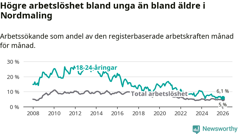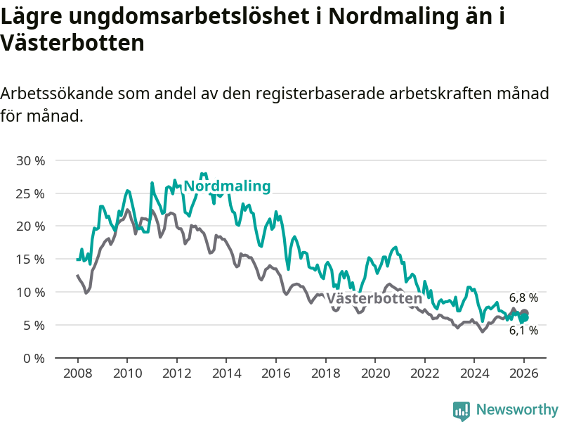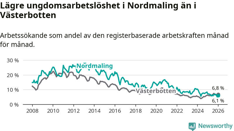 I och med den senaste månadens nedgång har de ungas arbetslöshet i Nordmaling sjunkit åtta månader i följd (ner från 5,7 procent i maj 2025 till 6,1 procent nu).