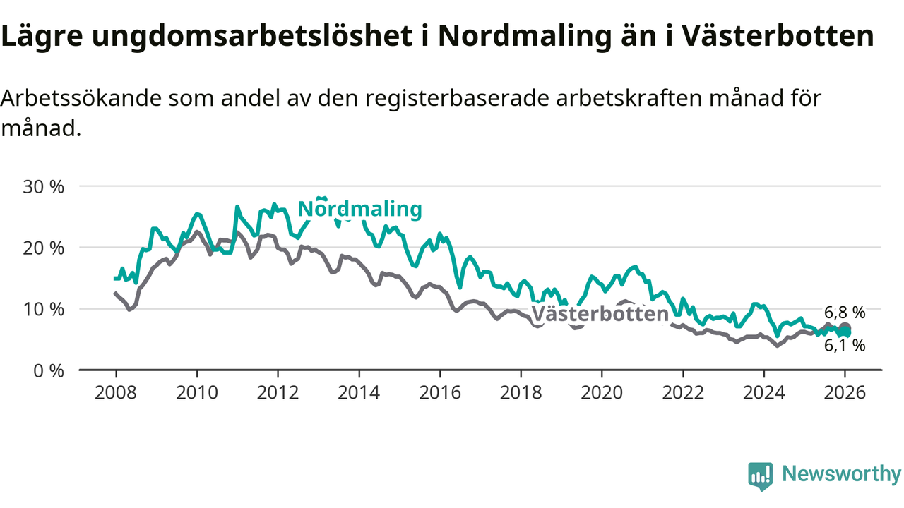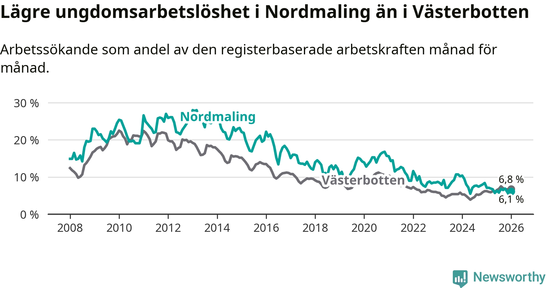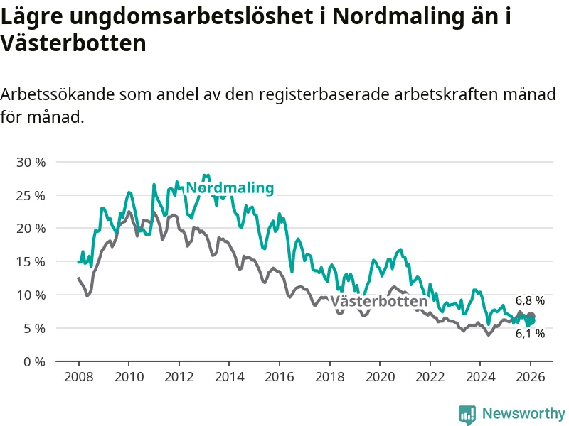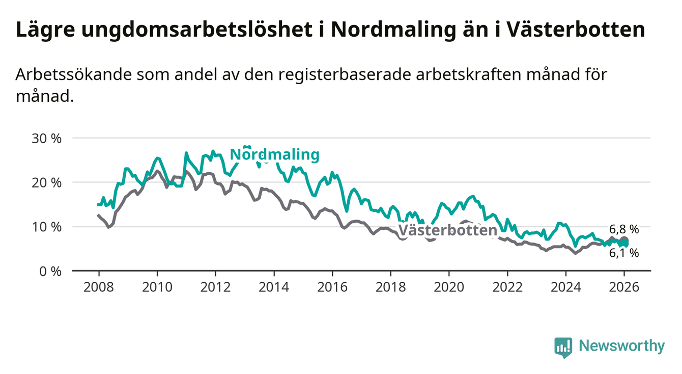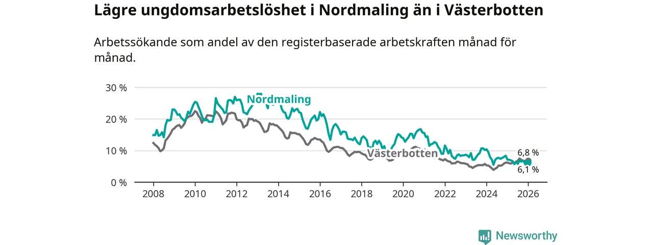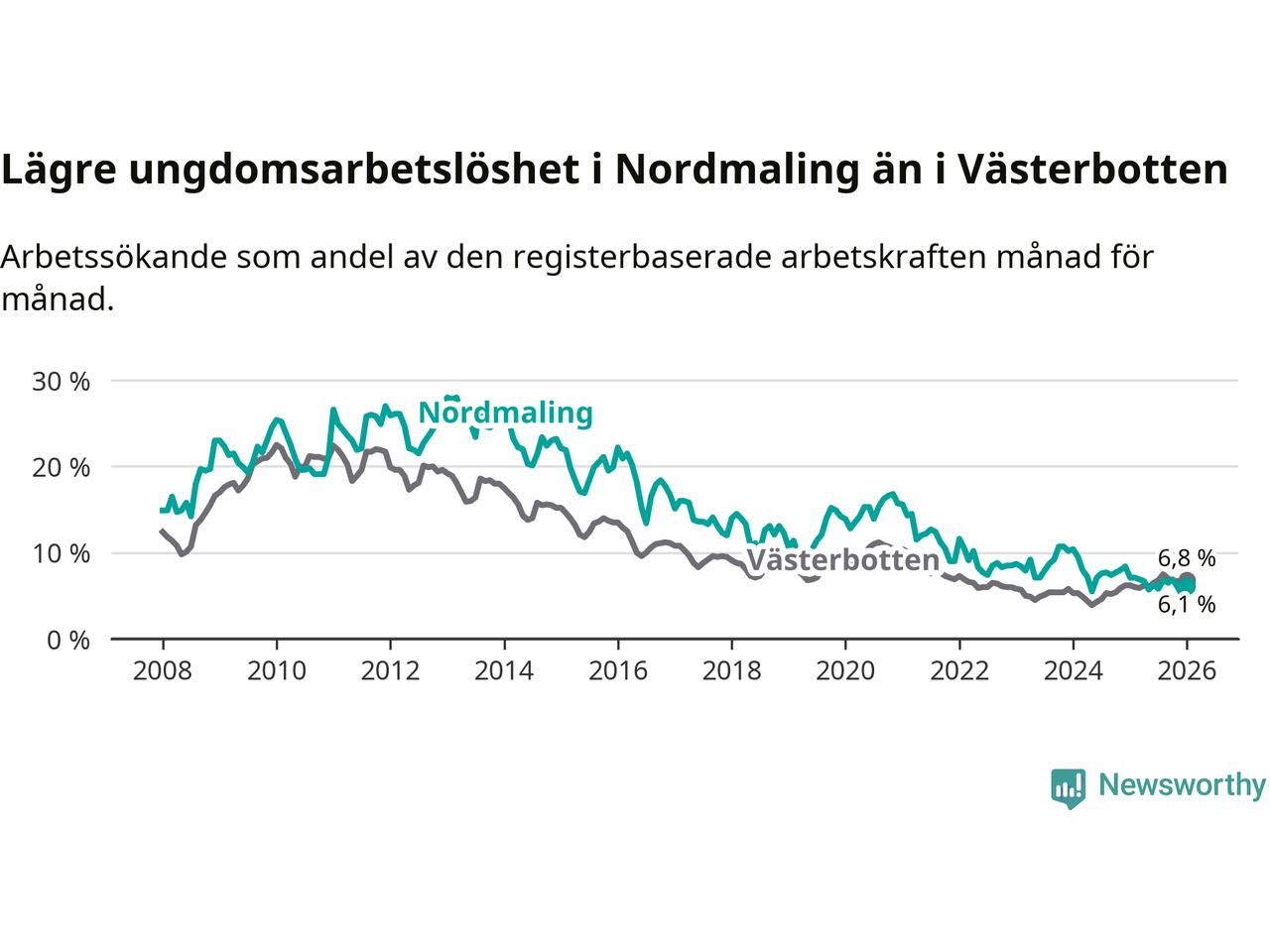 Medan Nordmaling har högre total arbetslöshet än Västerbotten, ligger ungdomsarbetslösheten 0,7 procentenheter lägre i Nordmaling.