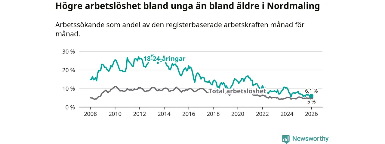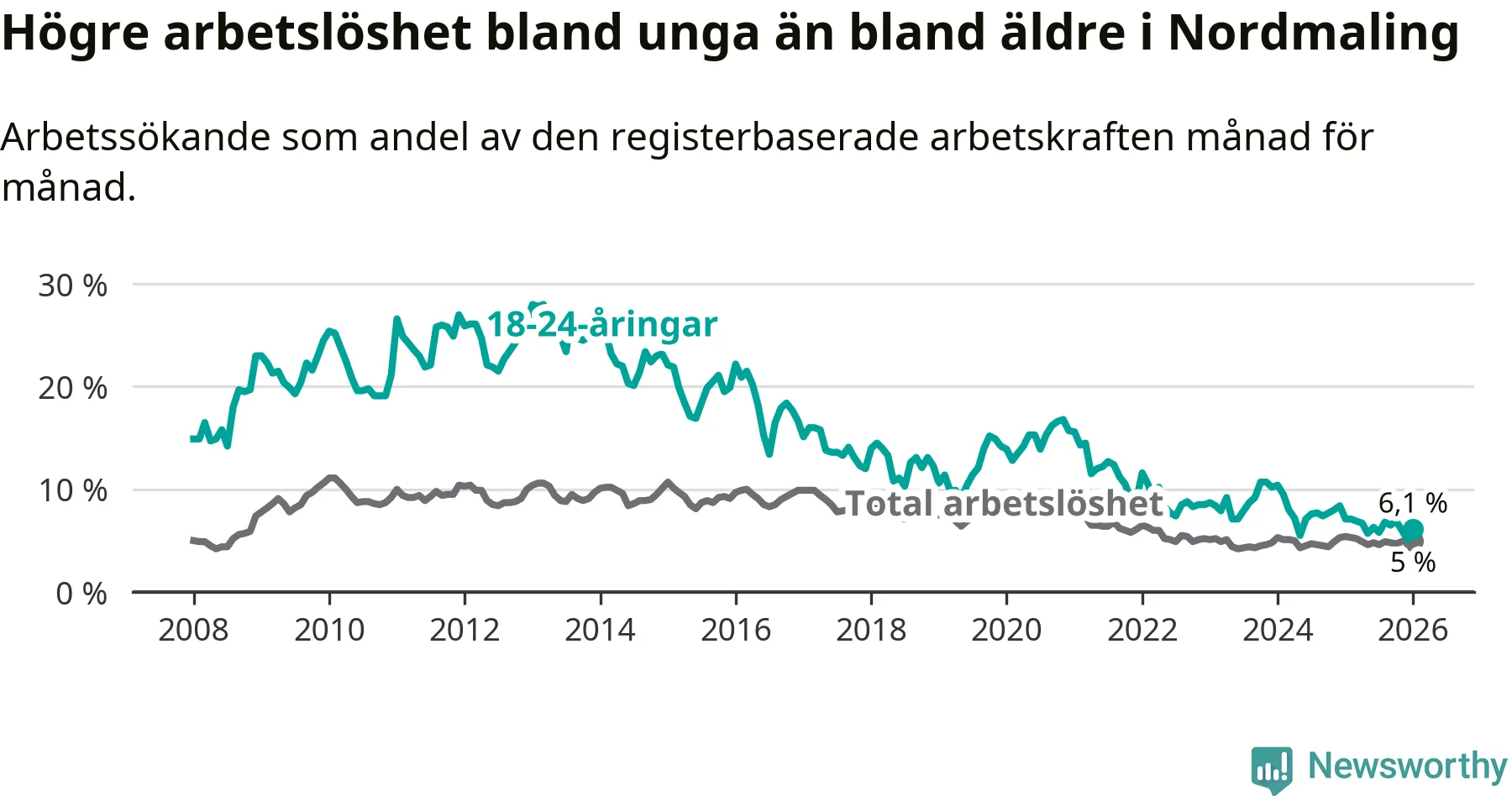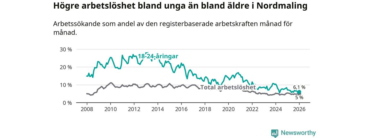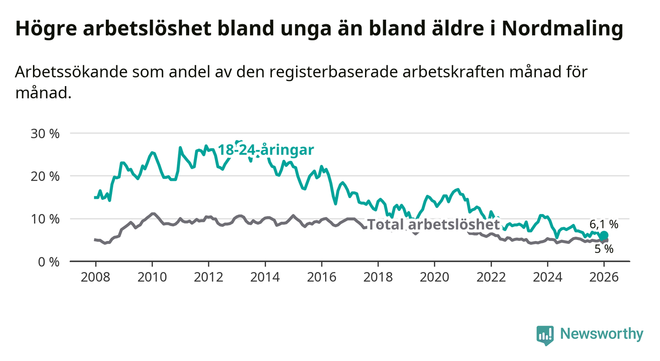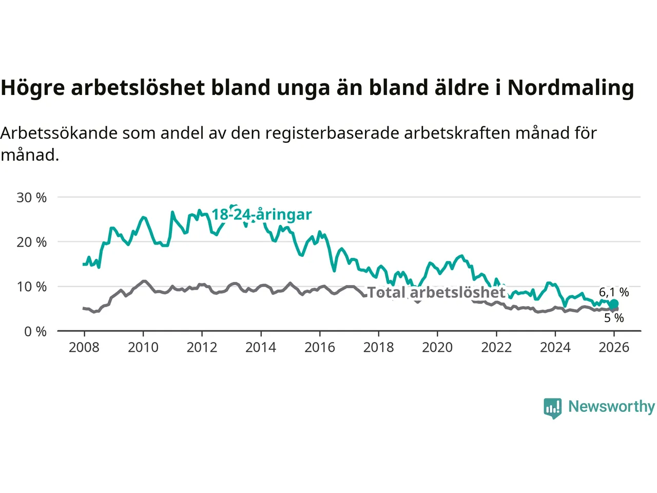 Medan Nordmaling har högre total arbetslöshet än Västerbotten, ligger ungdomsarbetslösheten 0,7 procentenheter lägre i Nordmaling.