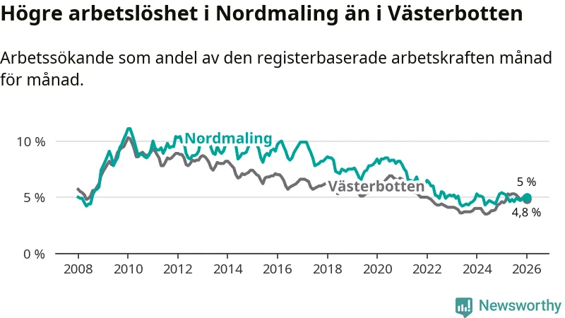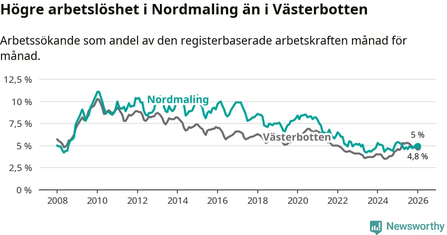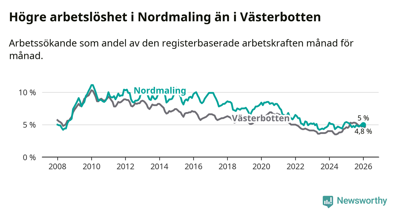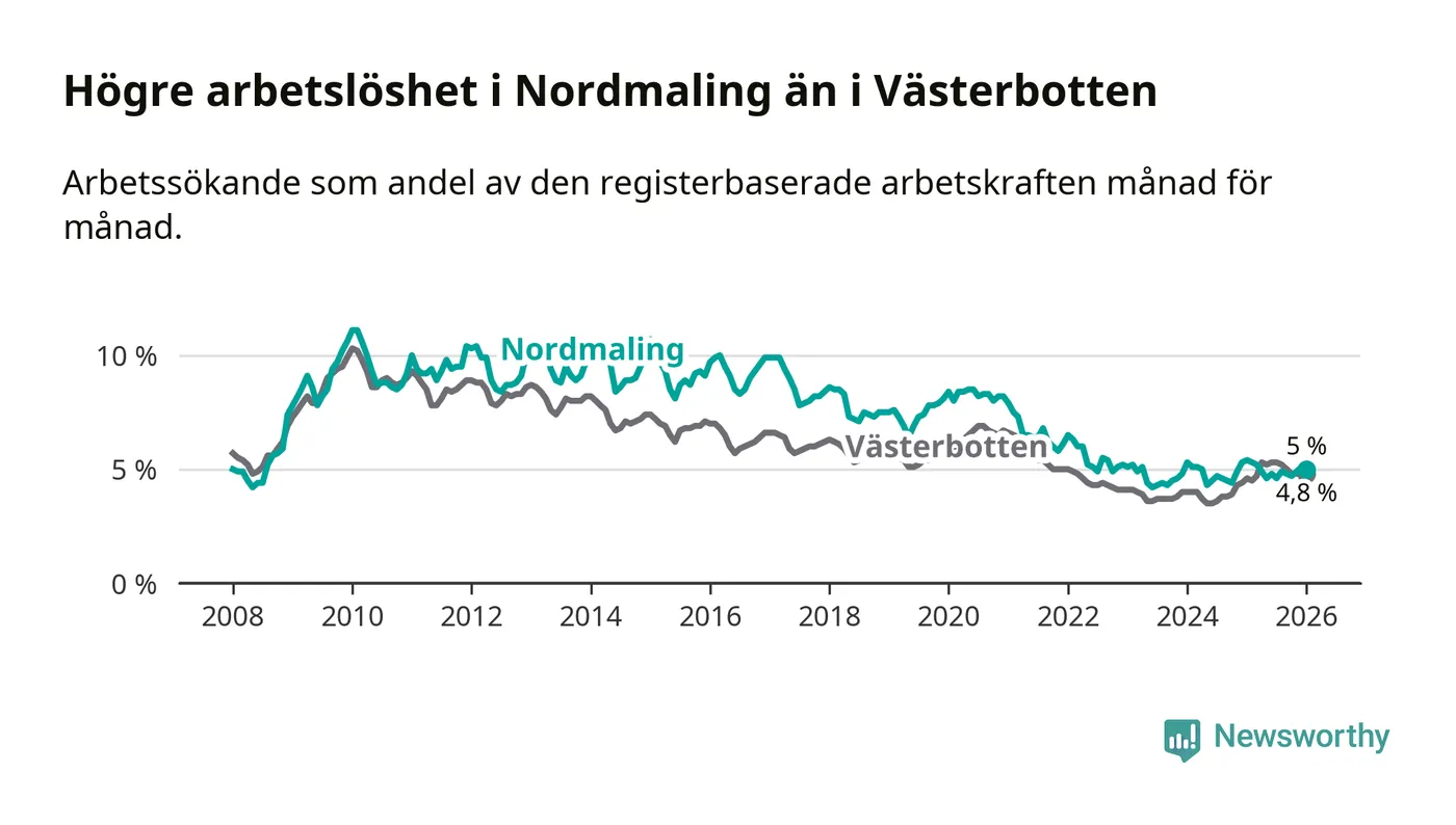 Under januari månad rapporterade Nordmalings kommun en total arbetslöshet på 5,0 procent. Det är en minskning jämfört med samma tidpunkt i fjol (−0,4 procentenheter). I Västerbottens län däremot stiger arbetslösheten .