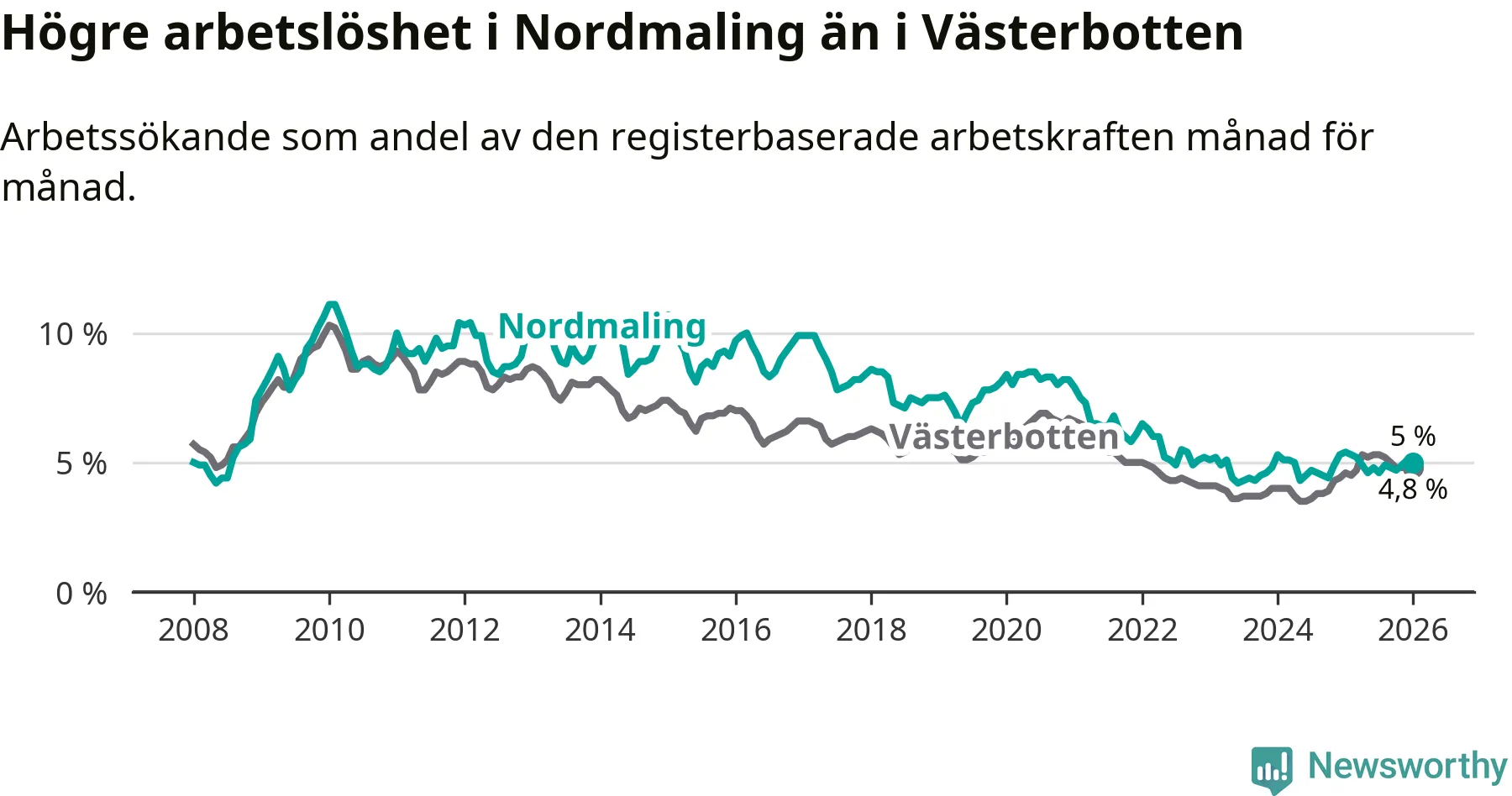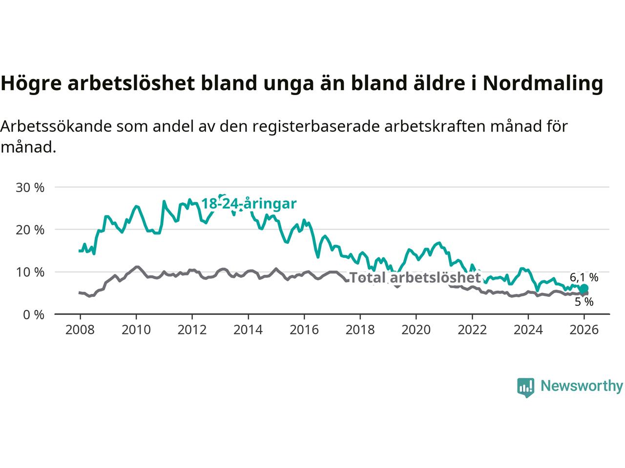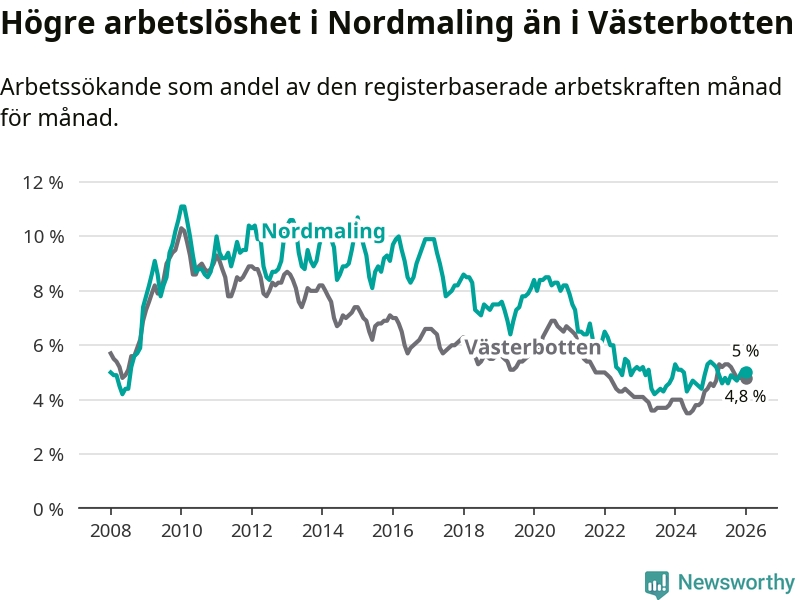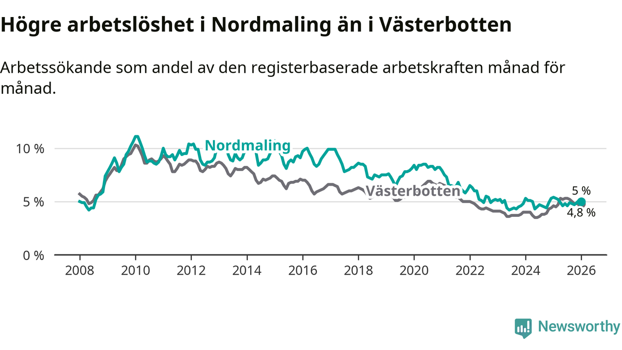 Under januari månad rapporterade Nordmalings kommun en total arbetslöshet på 5,0 procent. Det är en minskning jämfört med samma tidpunkt i fjol (−0,4 procentenheter). I Västerbottens län däremot stiger arbetslösheten .