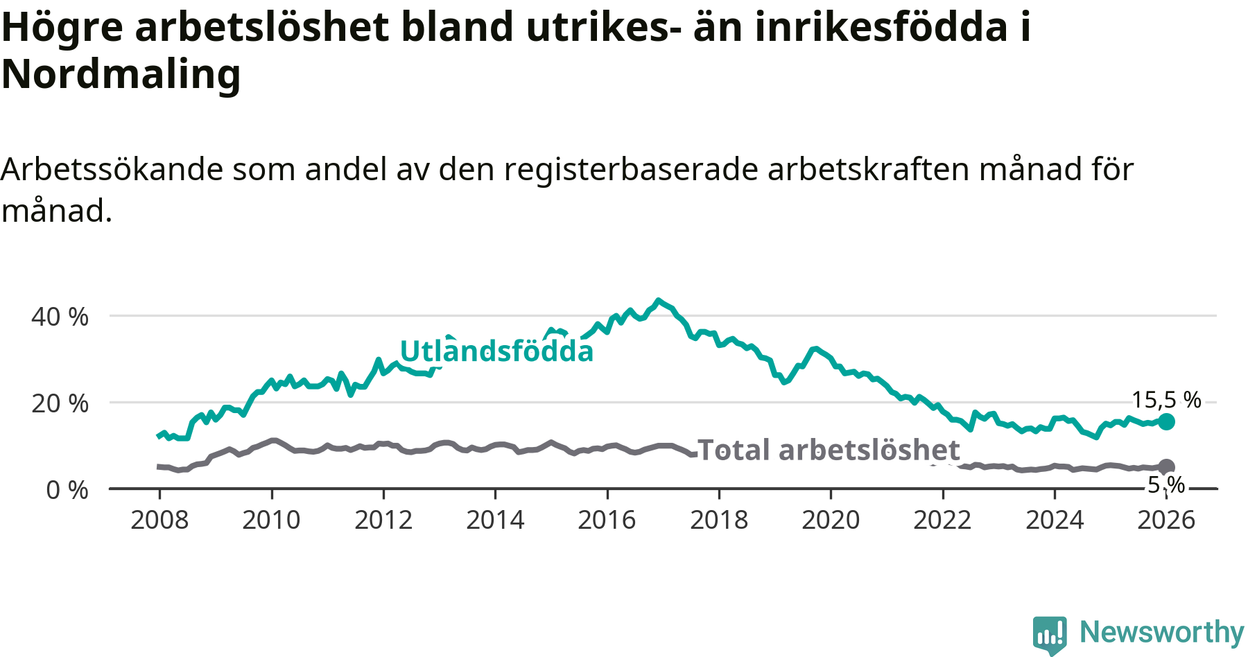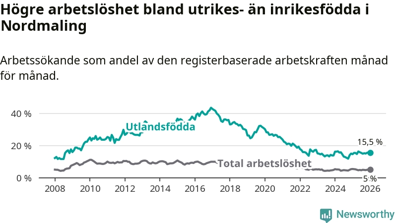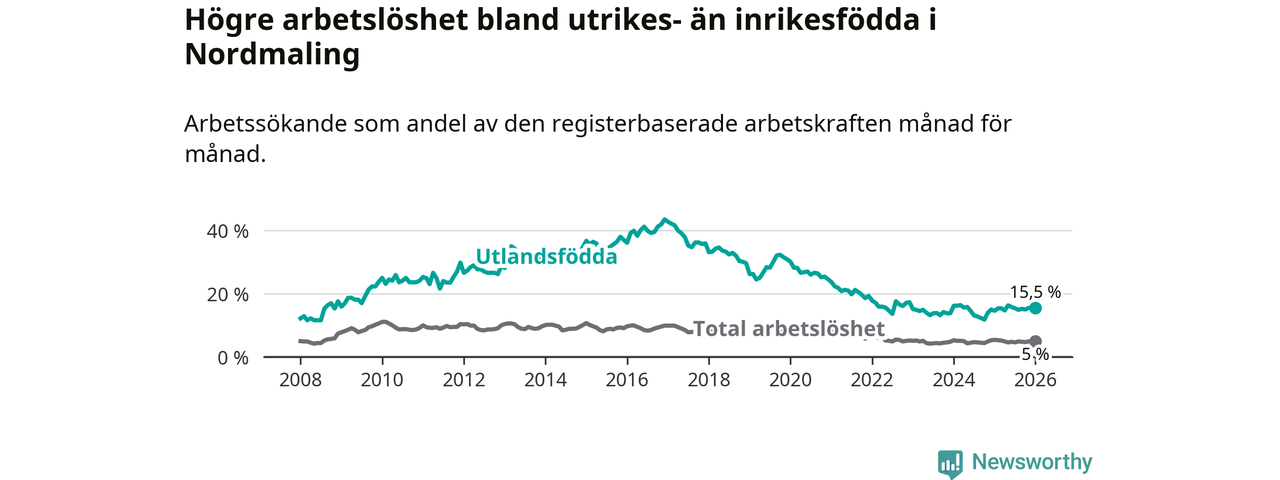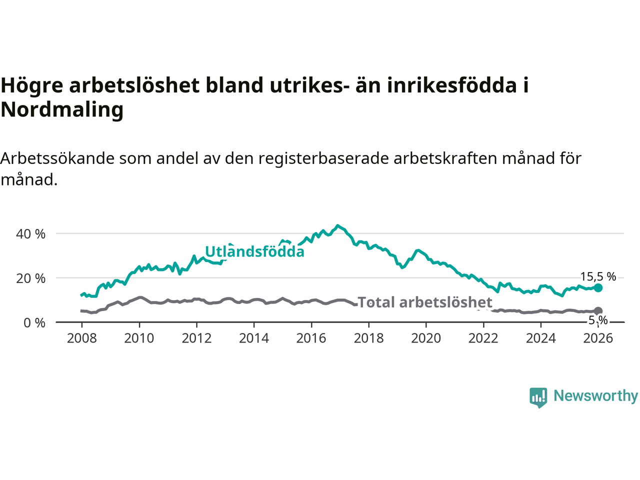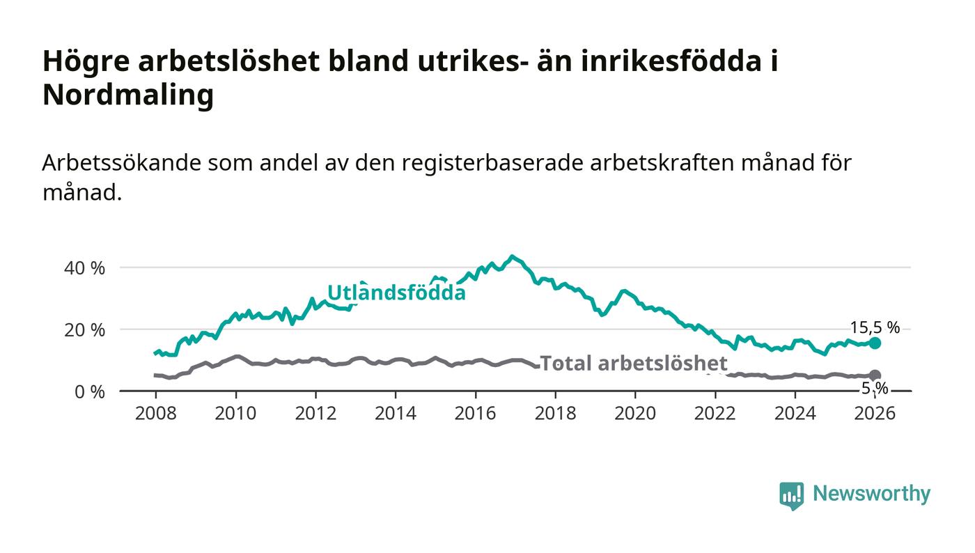 Arbetslösheten bland utlandsfödda var 15,5 procent i Nordmaling under januari månad, motsvarande 57 av 368 personer. Det är 0,9 procentenheter fler än vid samma tidpunkt i fjol (+2 om man räknar personer). Därmed är de utlandsföddas arbetslöshet högre än vid samma tidpunkt i fjol för nionde månaden i följd.