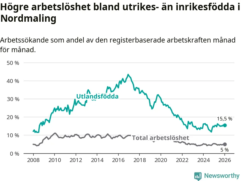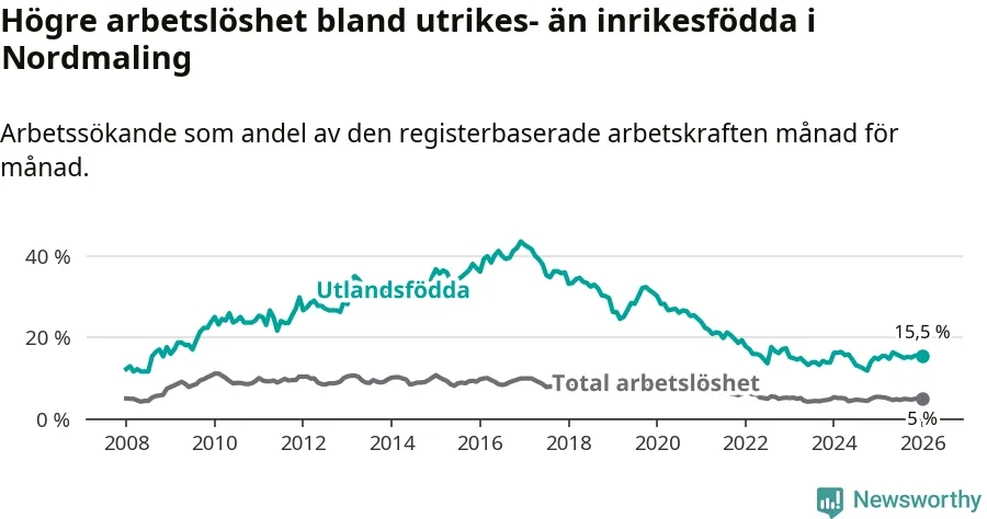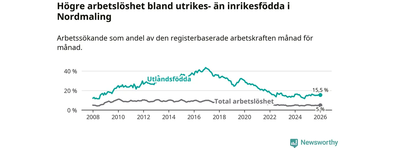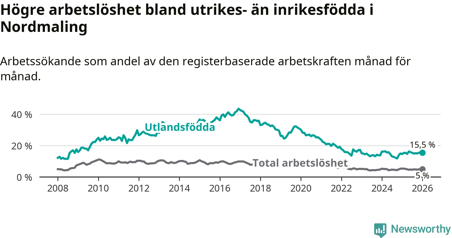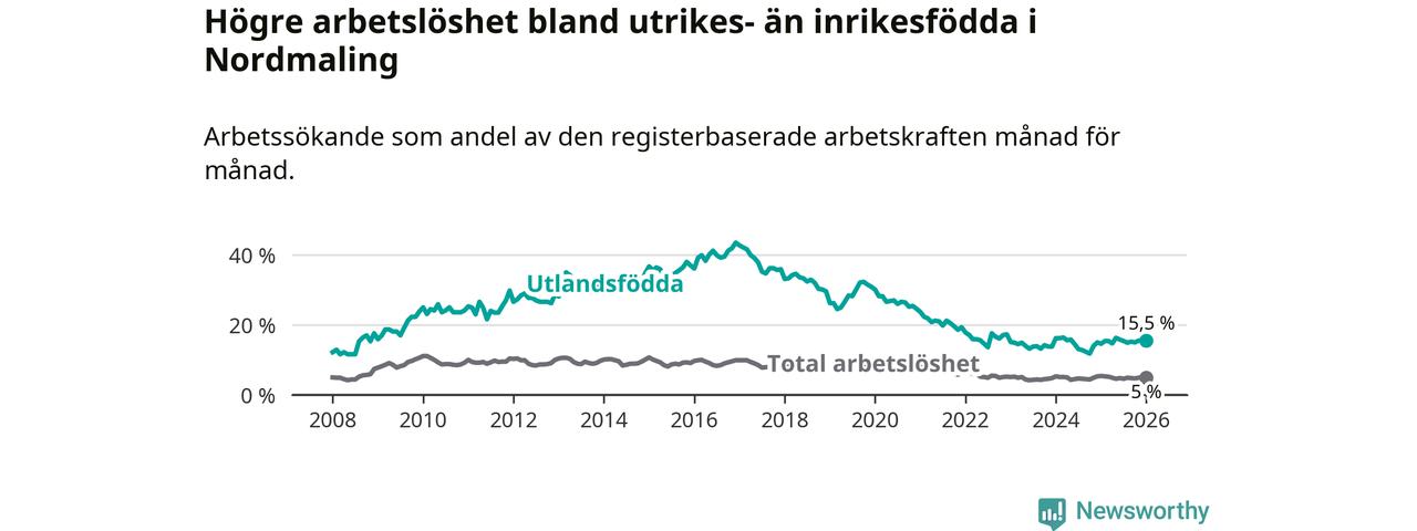 Arbetslösheten bland utlandsfödda var 15,5 procent i Nordmaling under januari månad, motsvarande 57 av 368 personer. Det är 0,9 procentenheter fler än vid samma tidpunkt i fjol (+2 om man räknar personer). Därmed är de utlandsföddas arbetslöshet högre än vid samma tidpunkt i fjol för nionde månaden i följd.