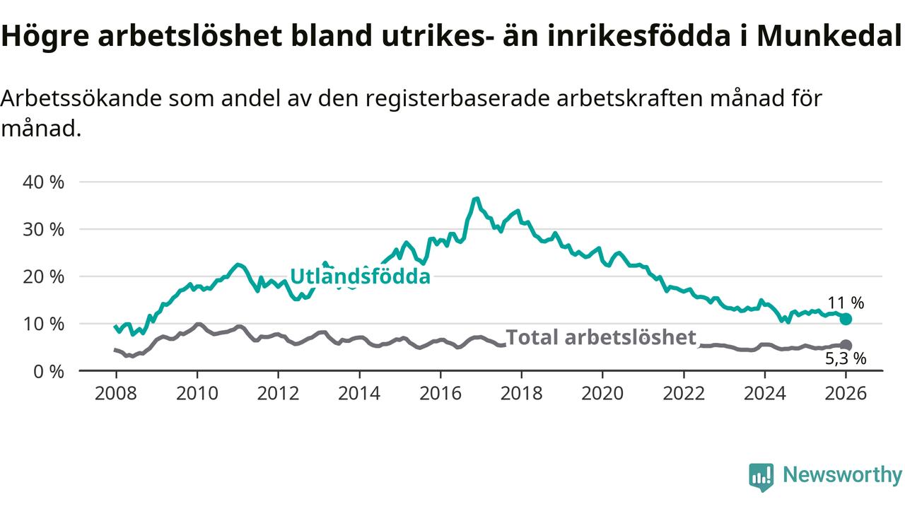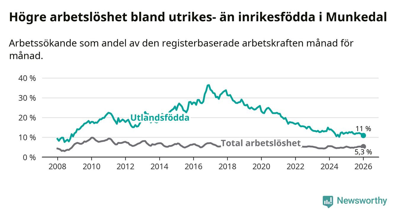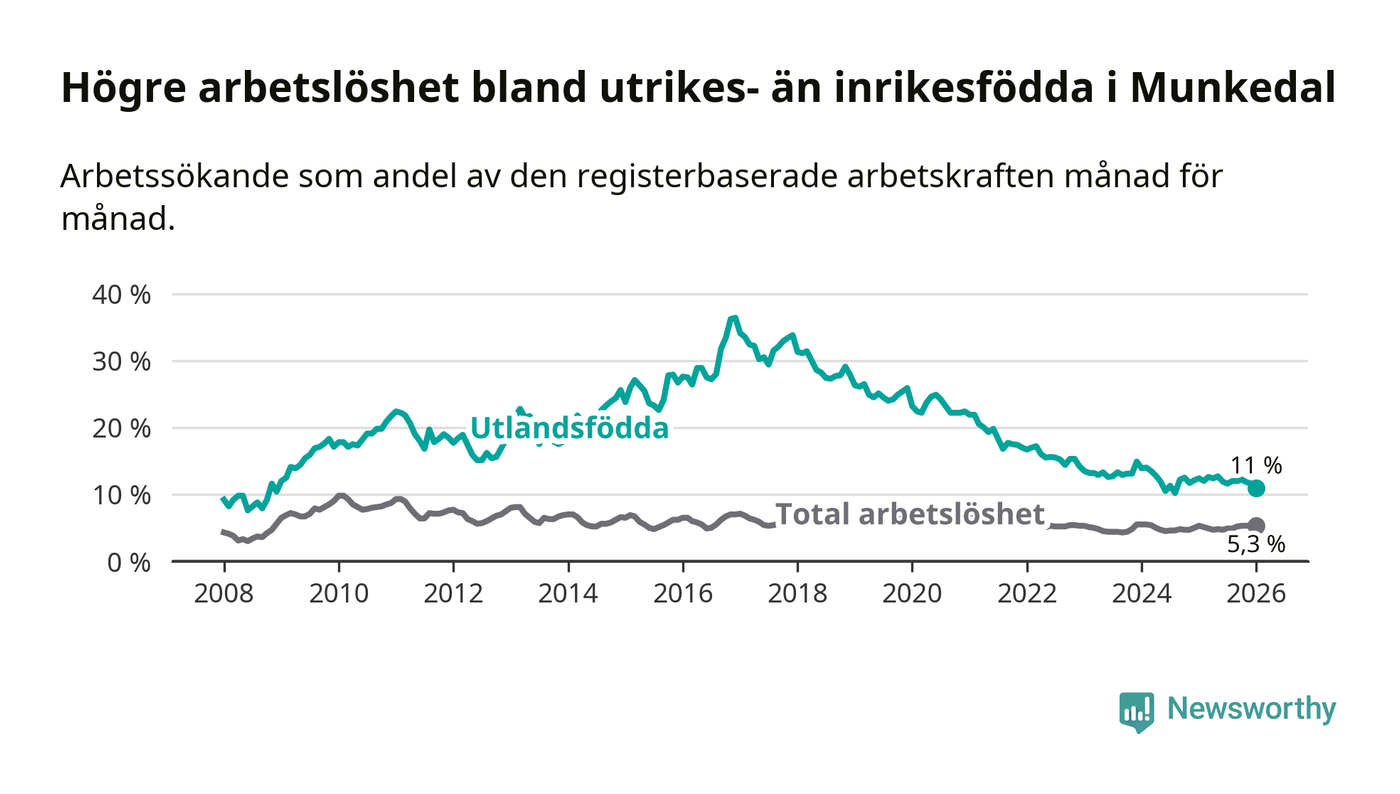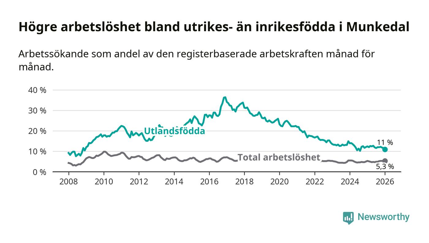 Arbetslösheten bland utlandsfödda var 11,0 procent i Munkedal under januari månad, motsvarande 75 av 682 personer. Det är 1,4 procentenheter färre än vid samma tidpunkt i fjol (−12 om man räknar personer).