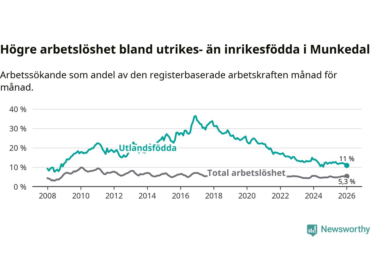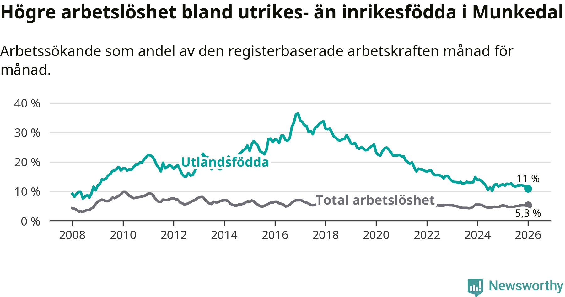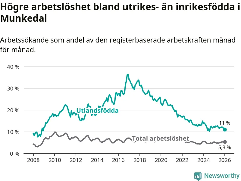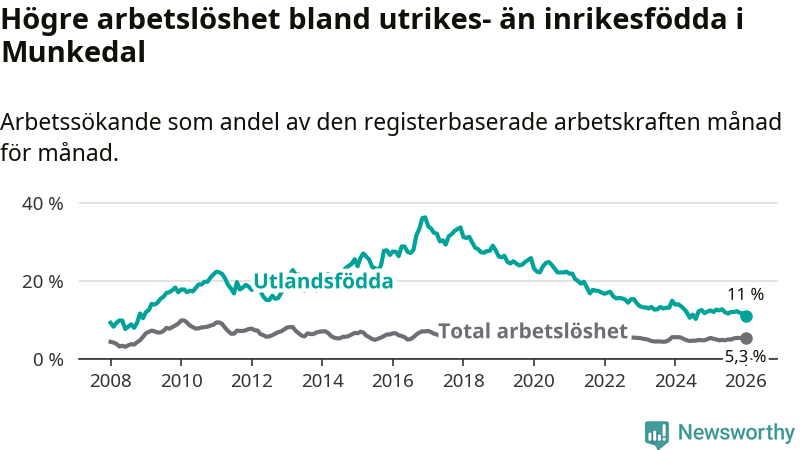 Arbetslösheten bland utlandsfödda var 11,0 procent i Munkedal under januari månad, motsvarande 75 av 682 personer. Det är 1,4 procentenheter färre än vid samma tidpunkt i fjol (−12 om man räknar personer).