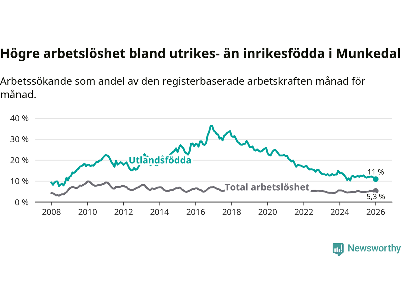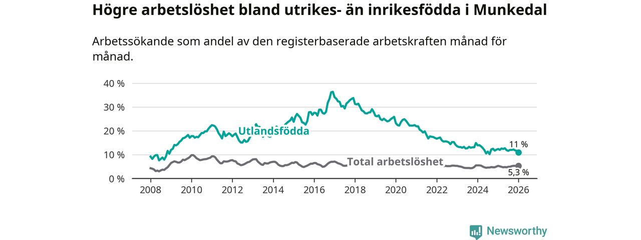 Skillnaden i arbetslöshet mellan utrikesfödda och hela befolkningen är 5,7 procentenheter i Munkedal. Det är en mindre skillnad än för ett år sedan (−1,4 procentenheter).