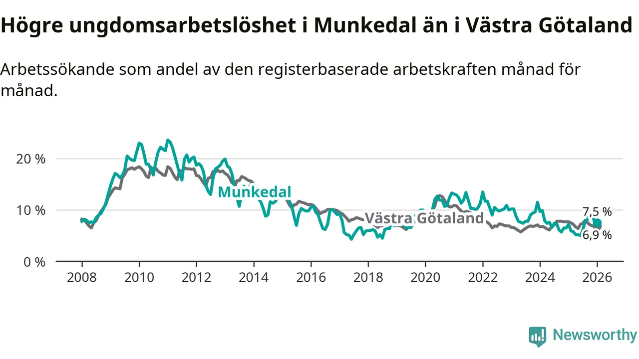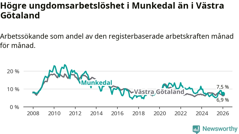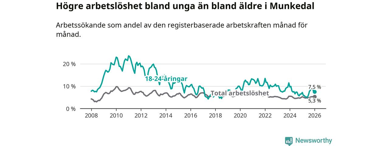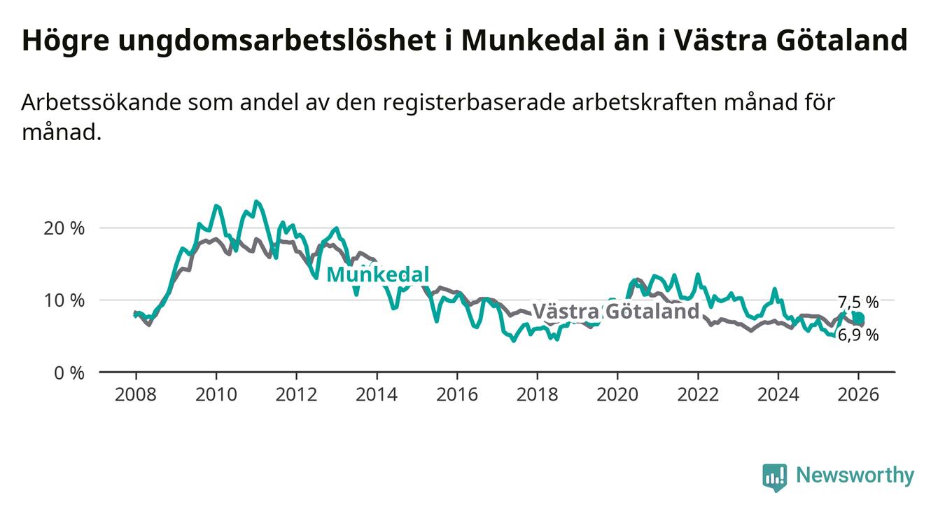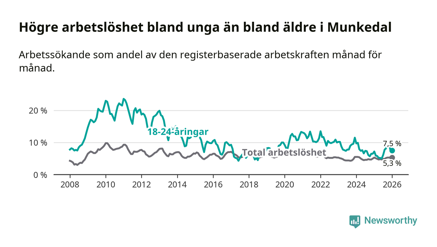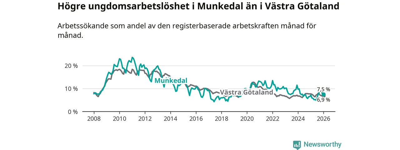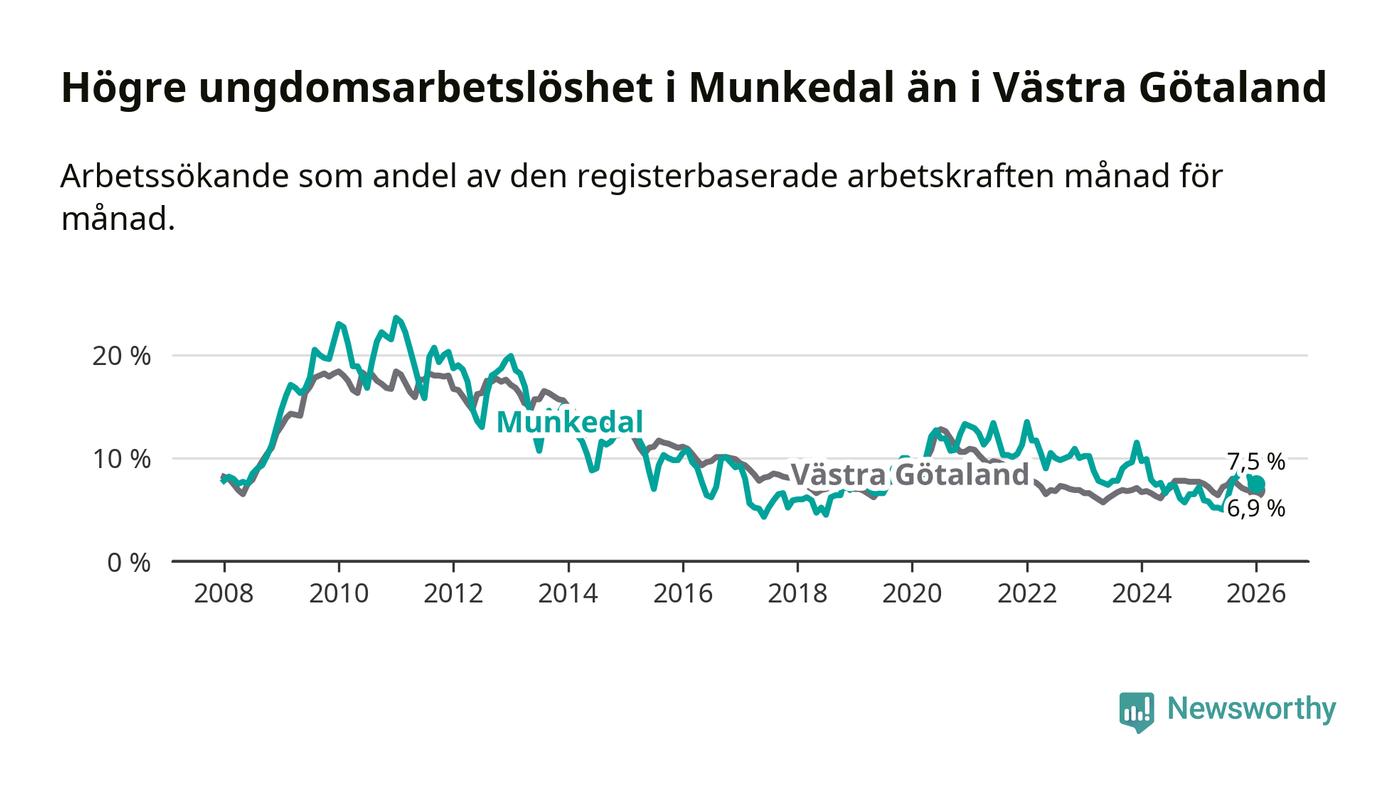 Medan Munkedal har lägre total arbetslöshet än Västra Götaland, ligger ungdomsarbetslösheten 0,6 procentenheter högre i Munkedal.