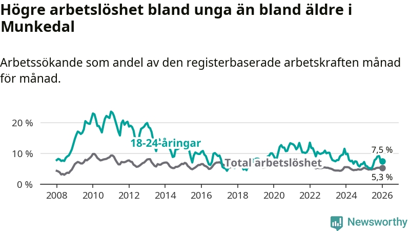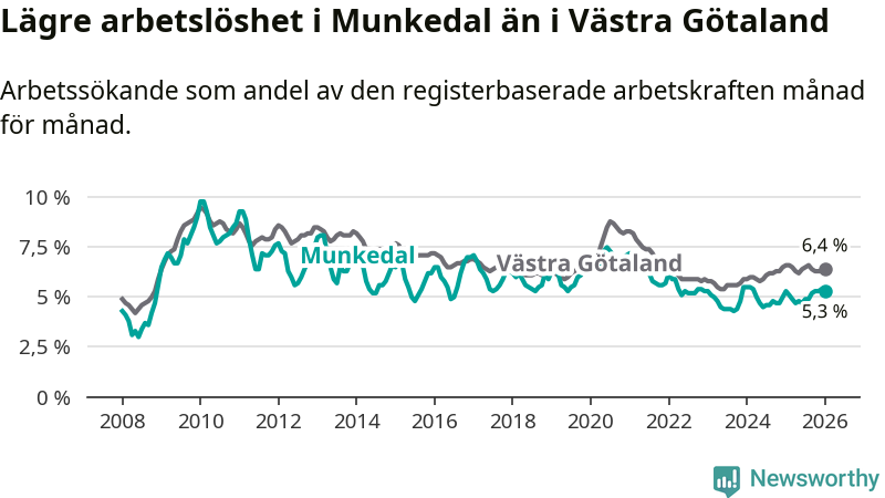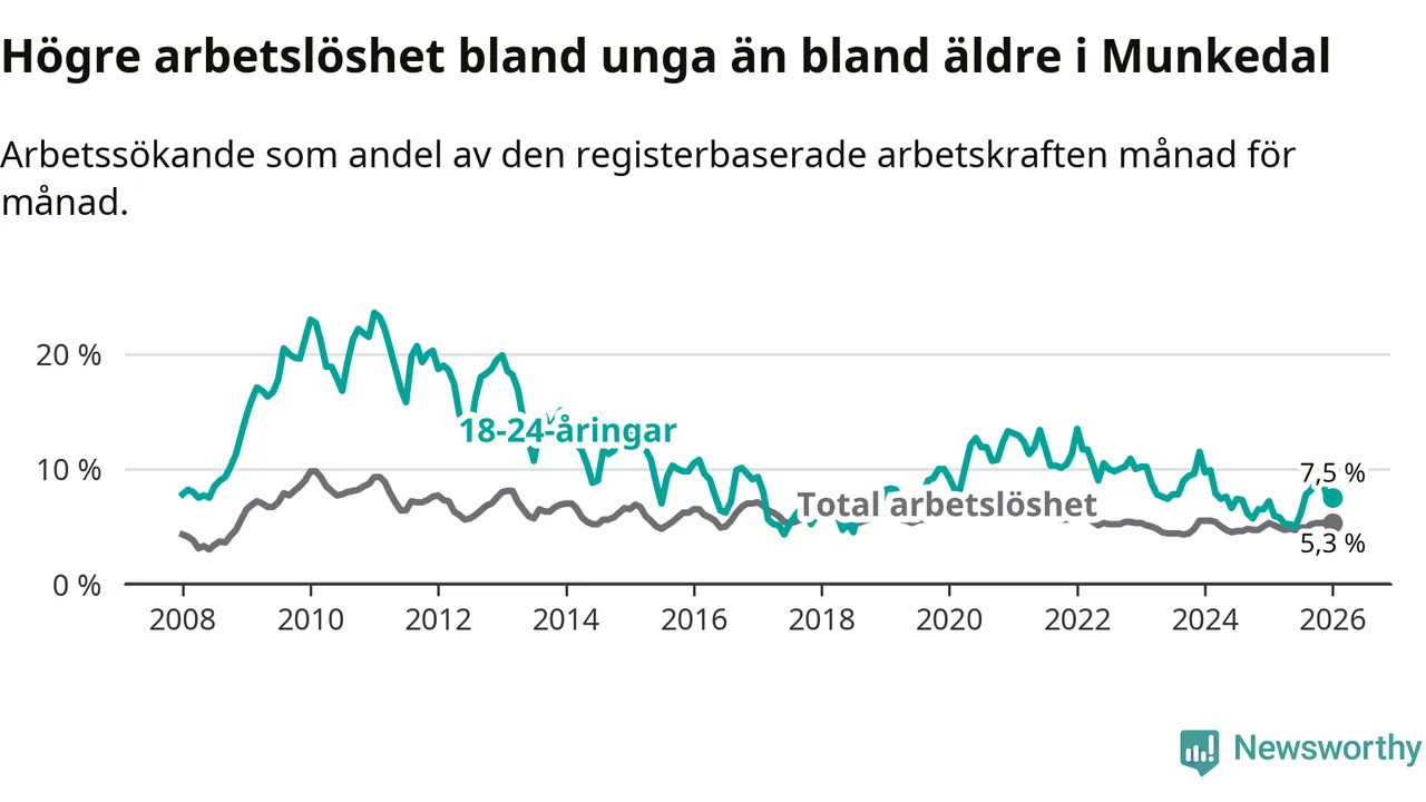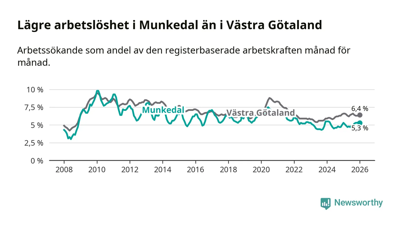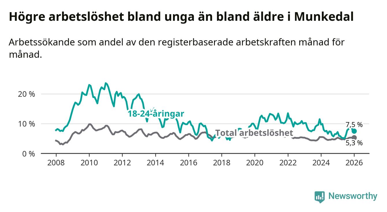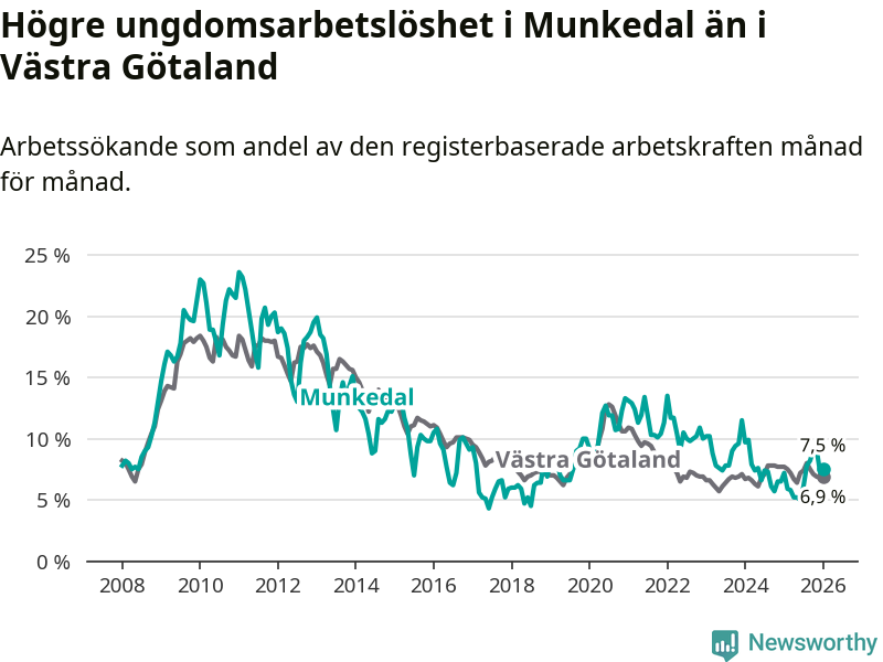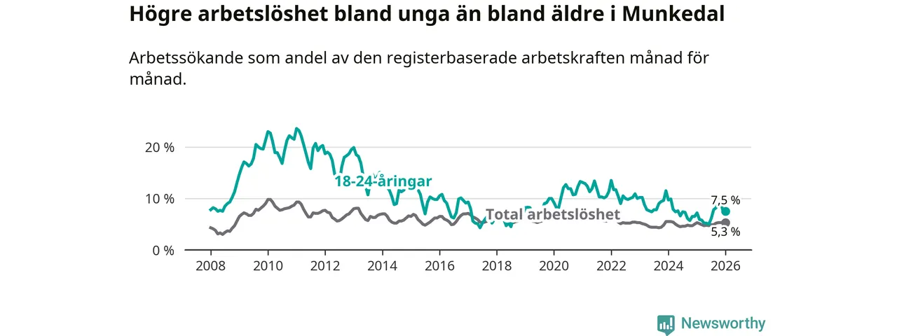 Medan Munkedal har lägre total arbetslöshet än Västra Götaland, ligger ungdomsarbetslösheten 0,6 procentenheter högre i Munkedal.