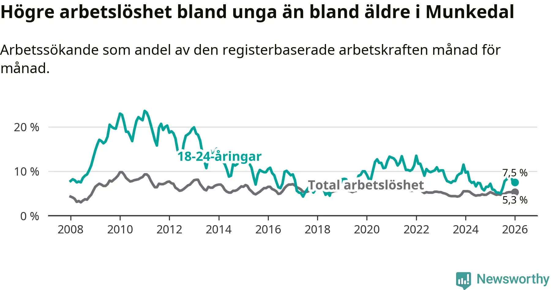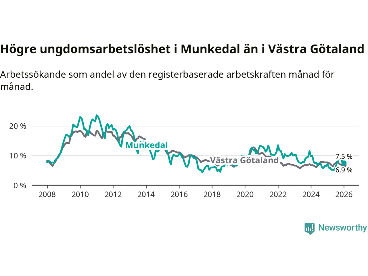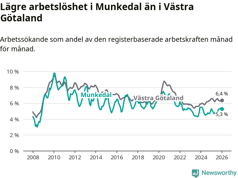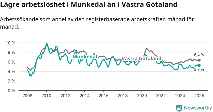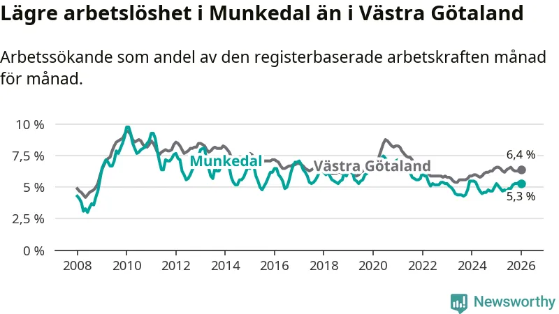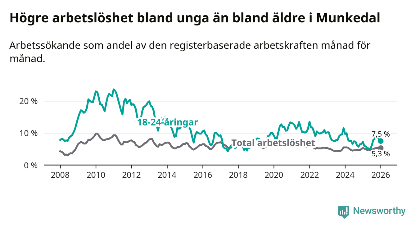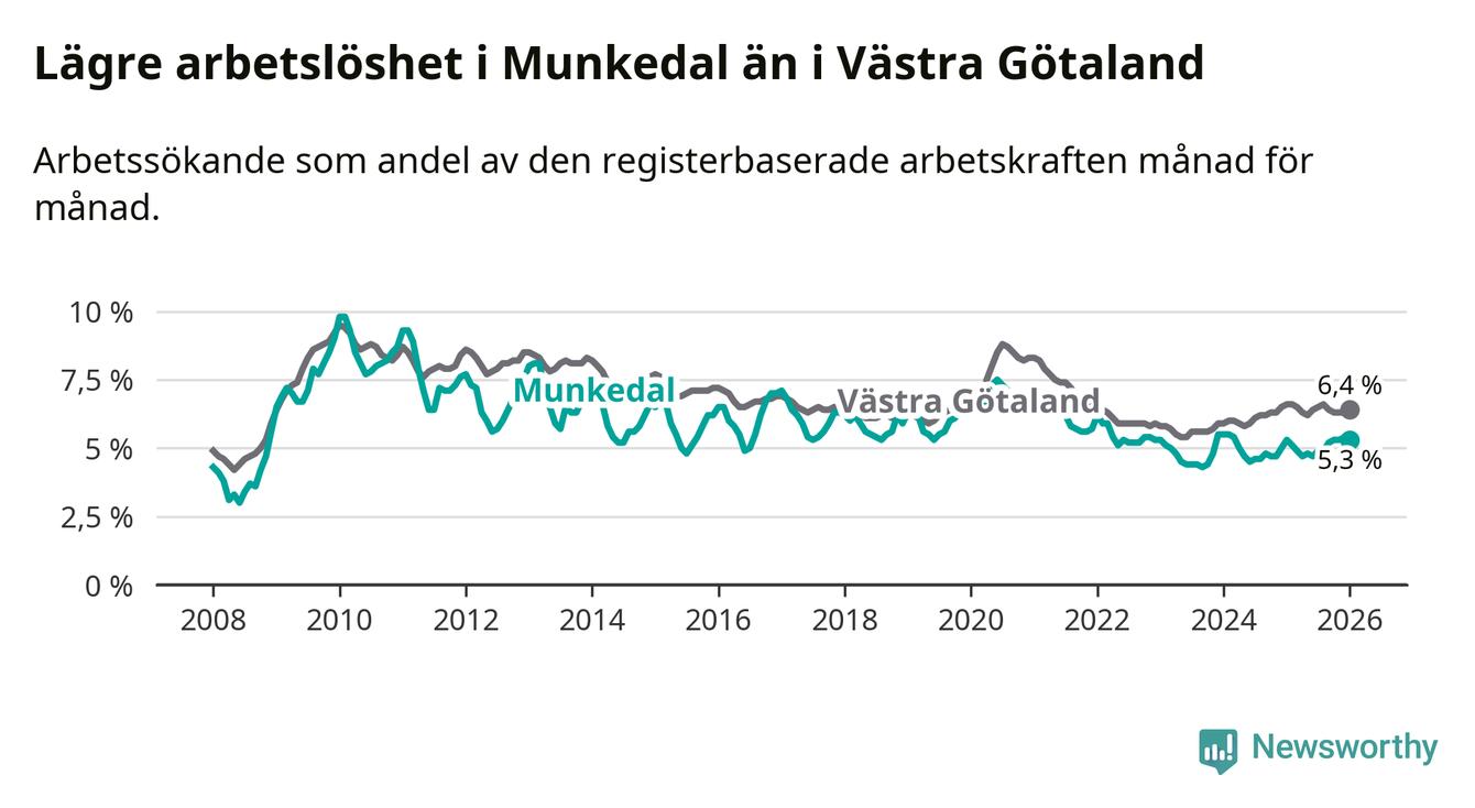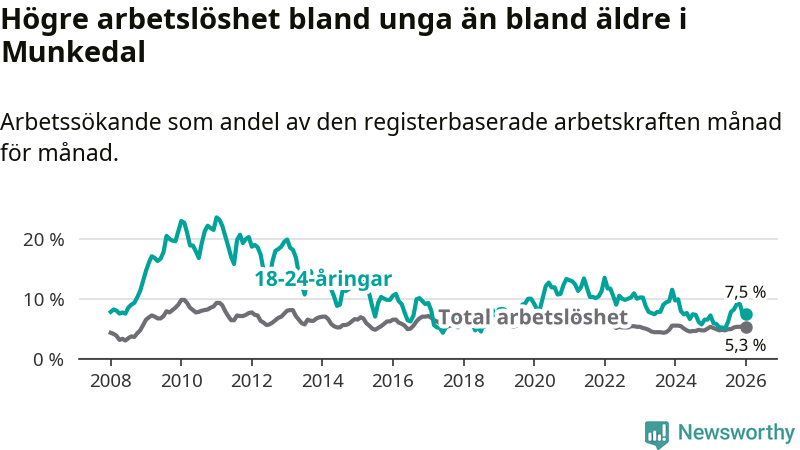 Medan Munkedal har lägre total arbetslöshet än Västra Götaland, ligger ungdomsarbetslösheten 0,6 procentenheter högre i Munkedal.