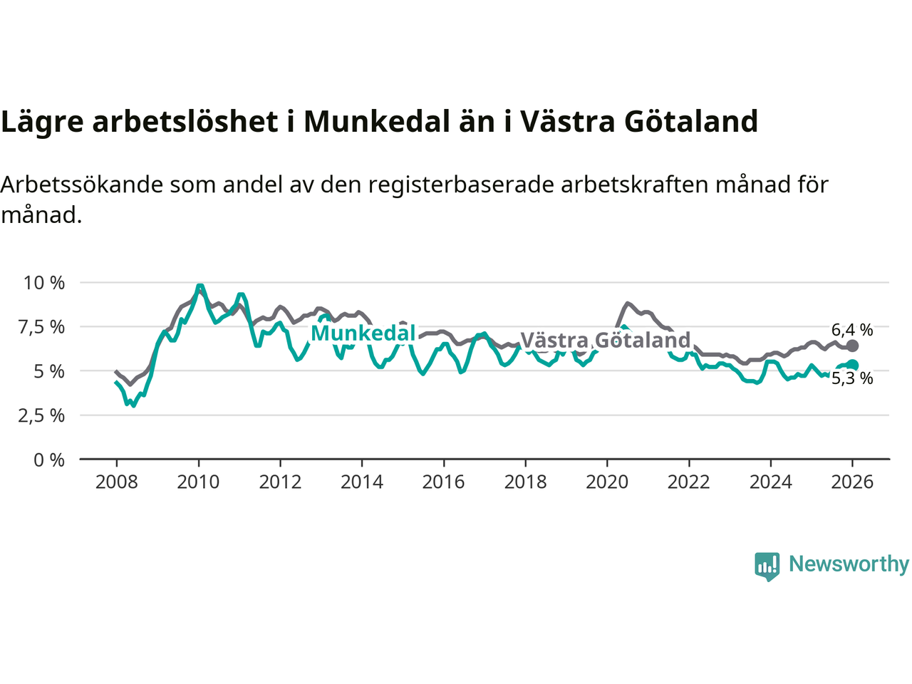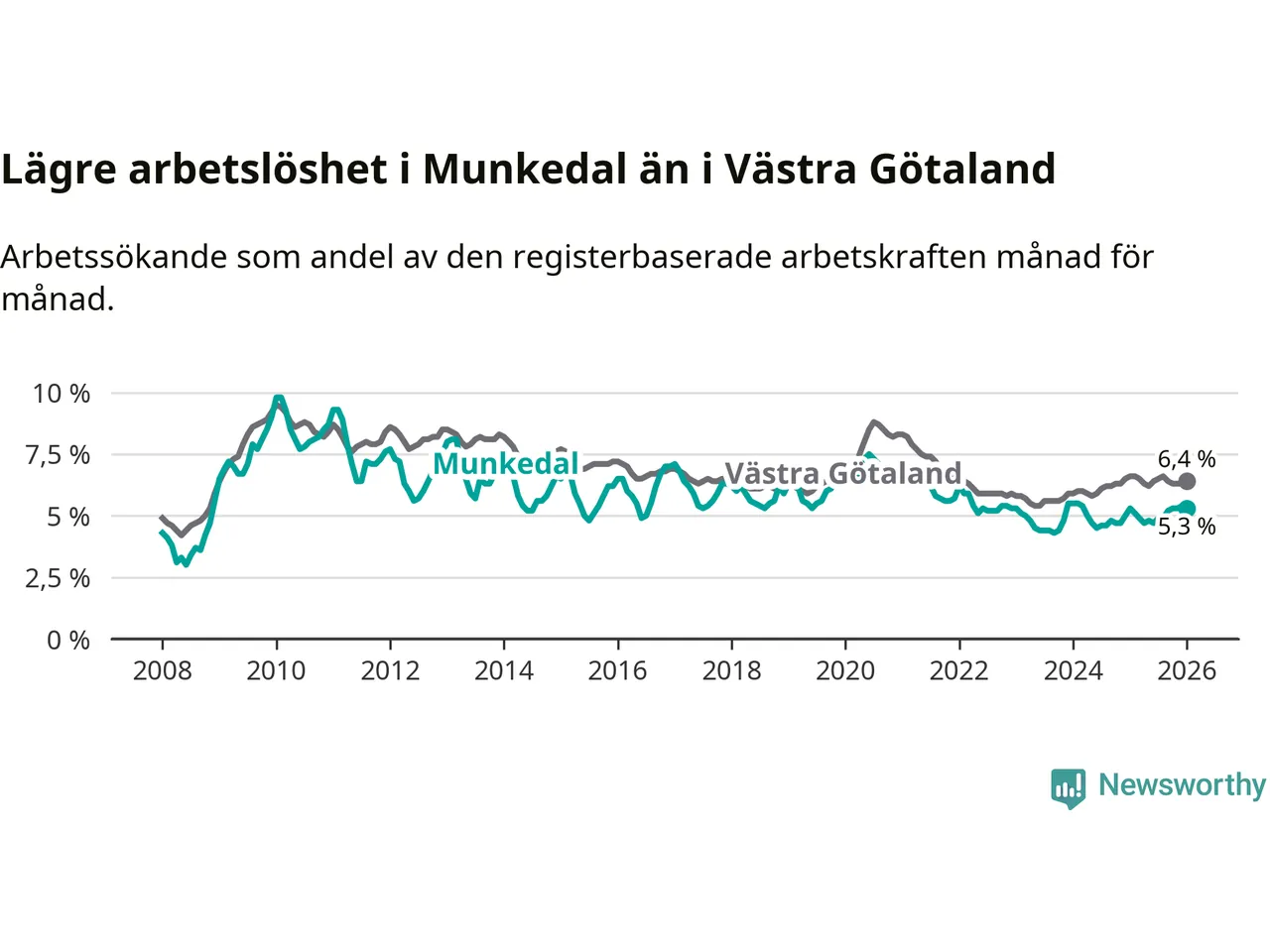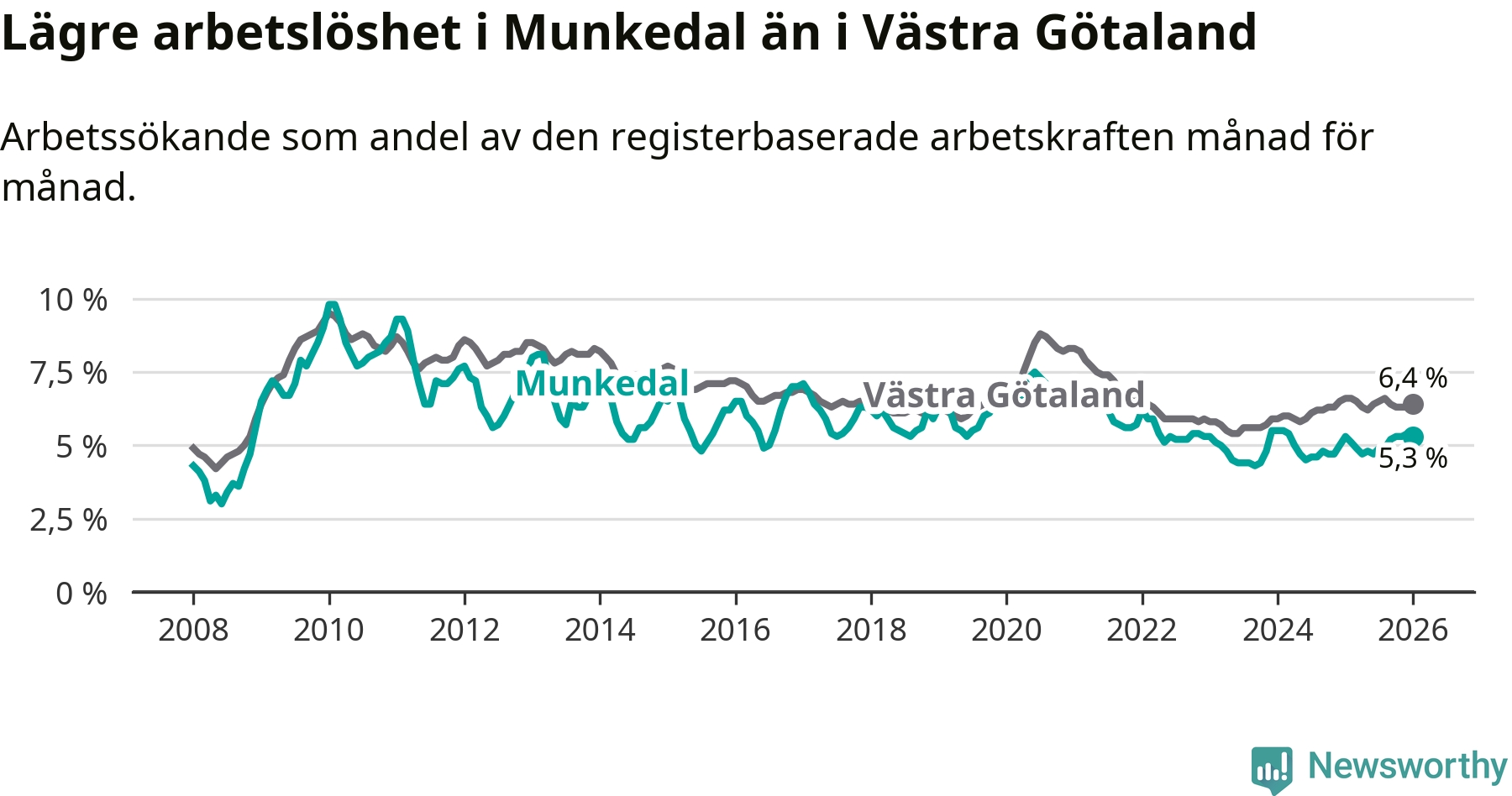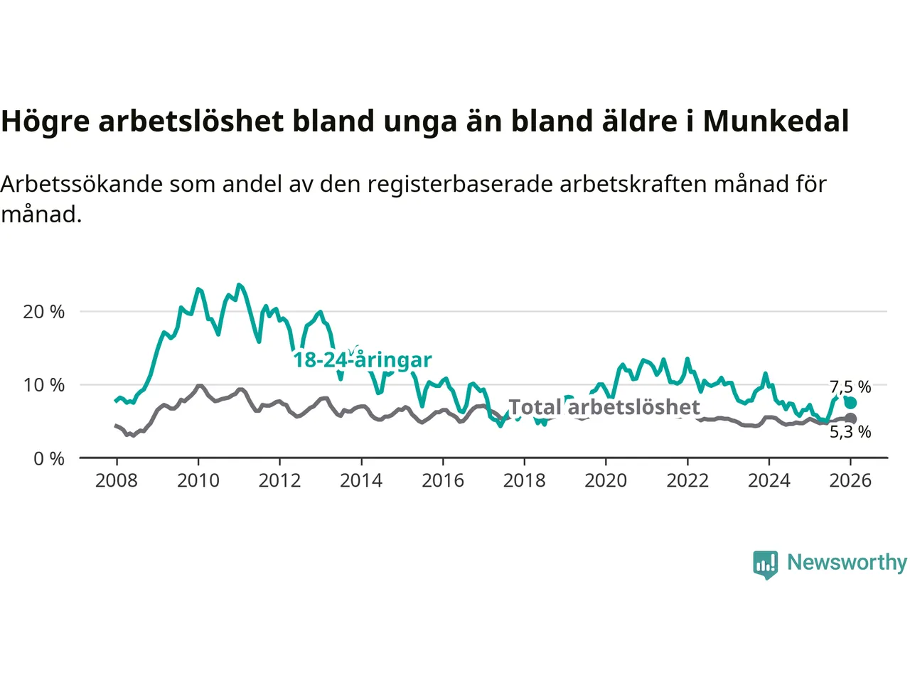 Medan Munkedal har lägre total arbetslöshet än Västra Götaland, ligger ungdomsarbetslösheten 0,6 procentenheter högre i Munkedal.
