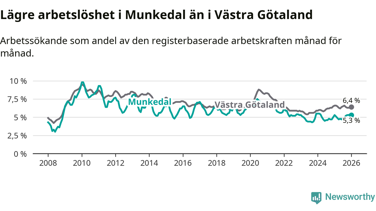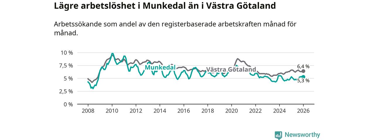 Under januari månad rapporterade Munkedals kommun en total arbetslöshet på 5,3 procent. Det är i samma nivå som i januari i fjol. I Västra Götalands län däremot sjunker arbetslösheten