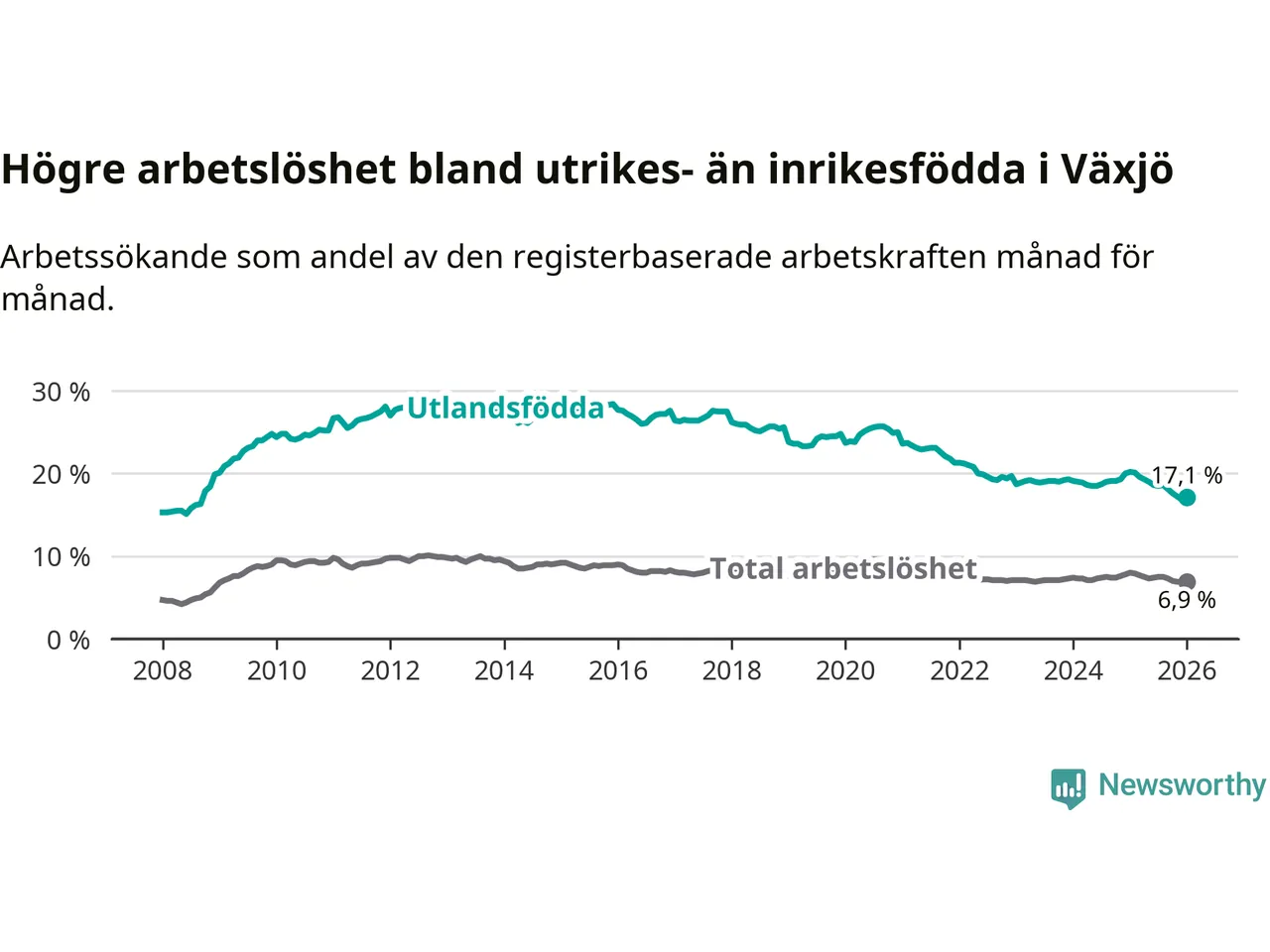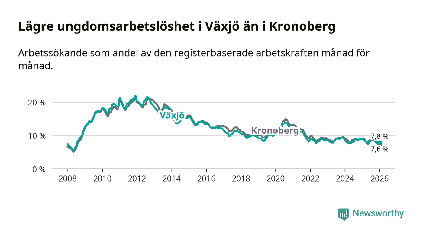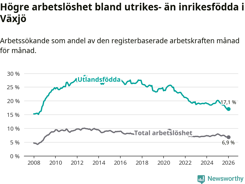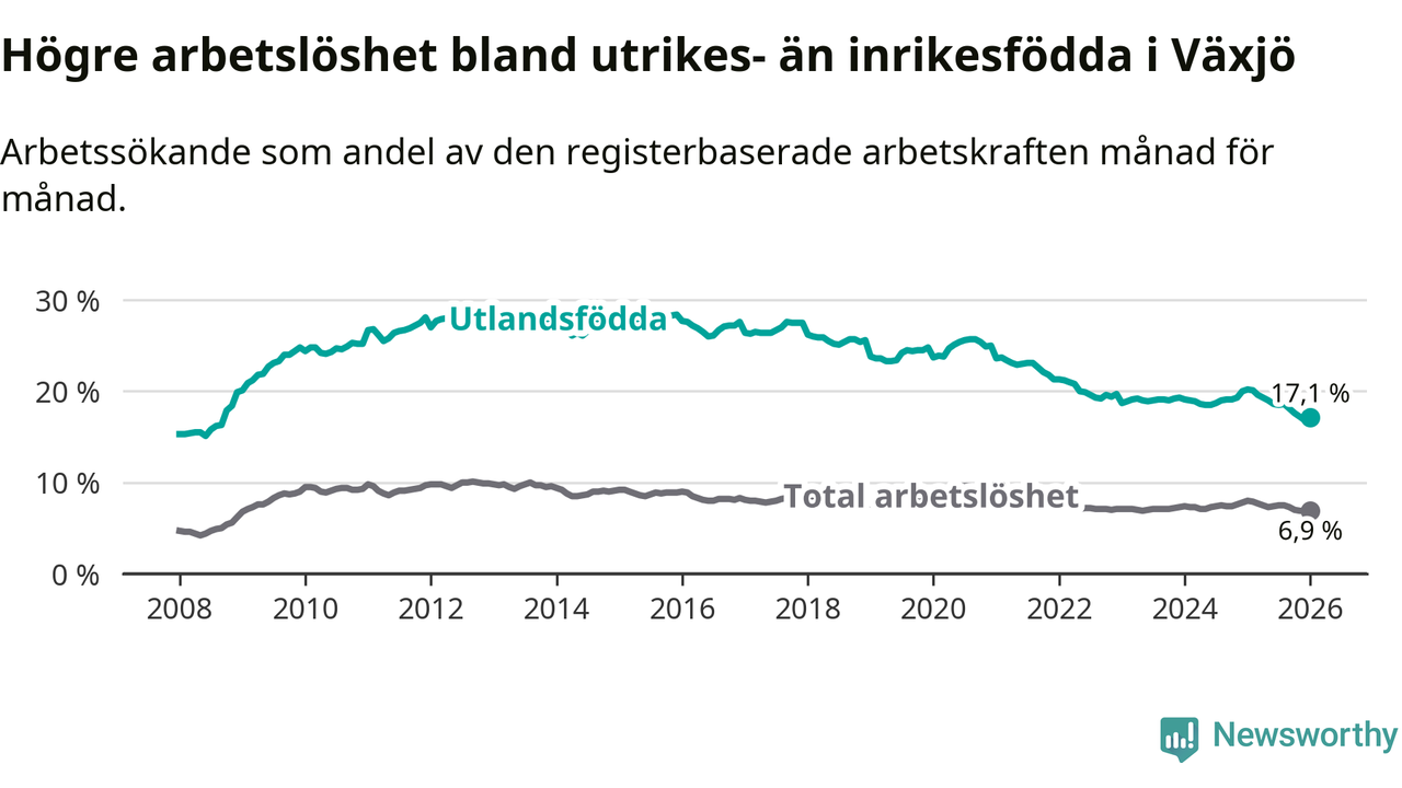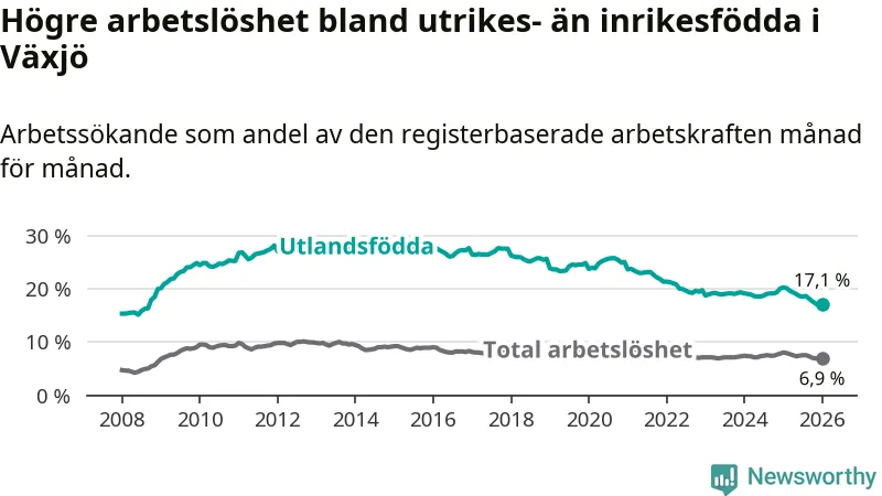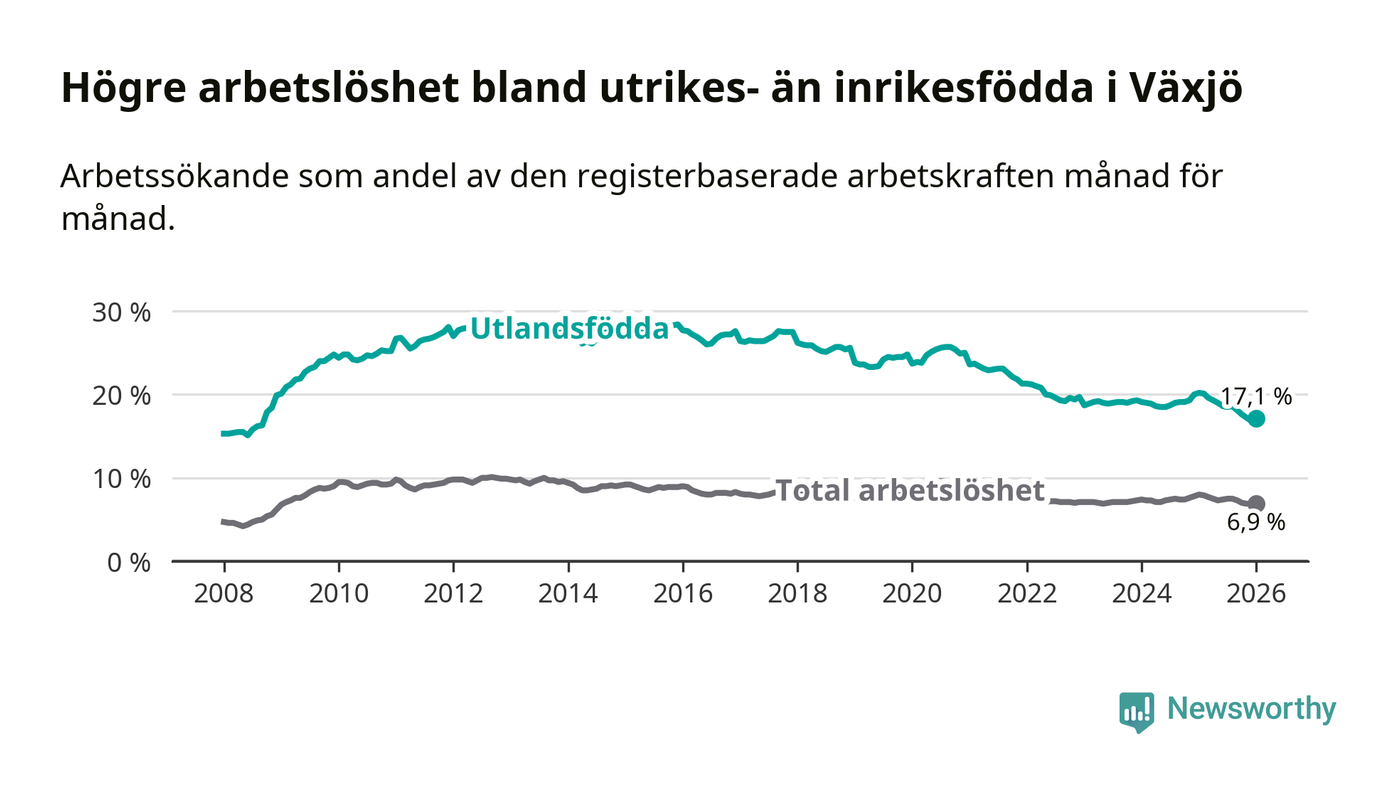 Arbetslösheten bland utlandsfödda var 17,1 procent i Växjö under januari månad, motsvarande 2 150 av 12 573 personer. Det är 3,1 procentenheter färre än vid samma tidpunkt i fjol (−311 om man räknar personer). Därmed är de utlandsföddas arbetslöshet lägre än vid samma tidpunkt i fjol för sjunde månaden i följd. Sedan juni 2025 har arbetslösheten bland utlandsfödda minskat från 18,6 till 17,1 procent.