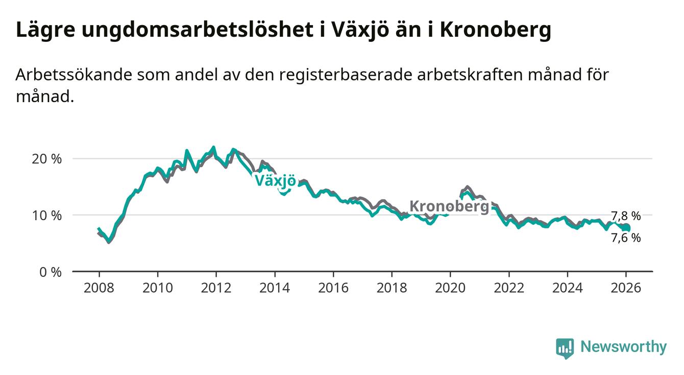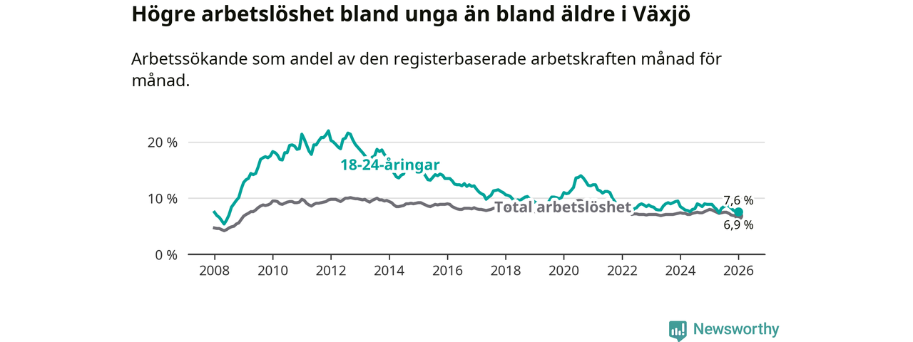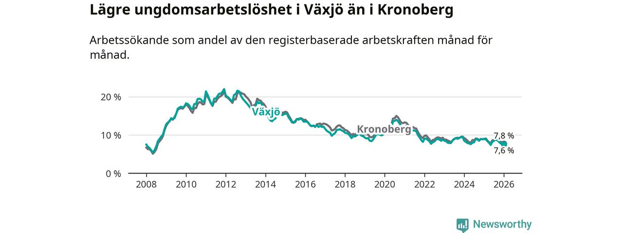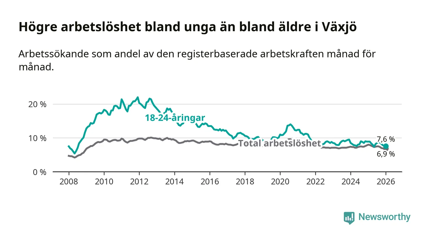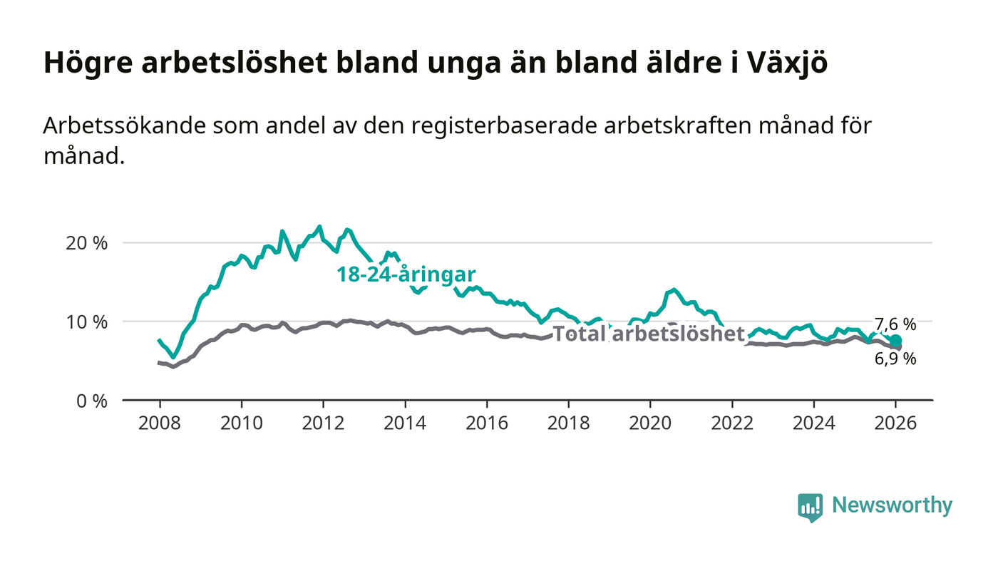 Arbetslösheten bland utlandsfödda var 17,1 procent i Växjö under januari månad, motsvarande 2 150 av 12 573 personer. Det är 3,1 procentenheter färre än vid samma tidpunkt i fjol (−311 om man räknar personer). Därmed är de utlandsföddas arbetslöshet lägre än vid samma tidpunkt i fjol för sjunde månaden i följd. Sedan juni 2025 har arbetslösheten bland utlandsfödda minskat från 18,6 till 17,1 procent.