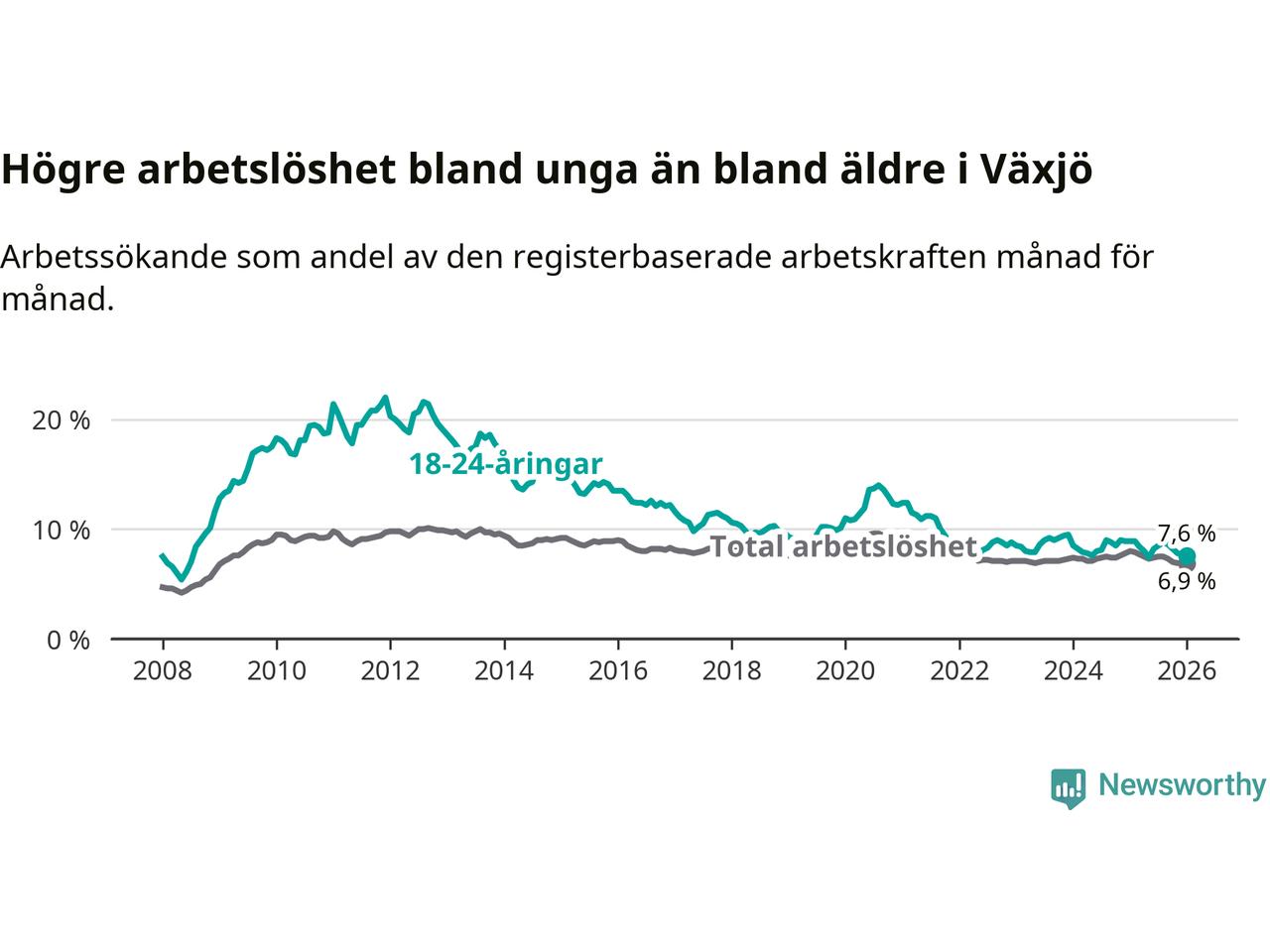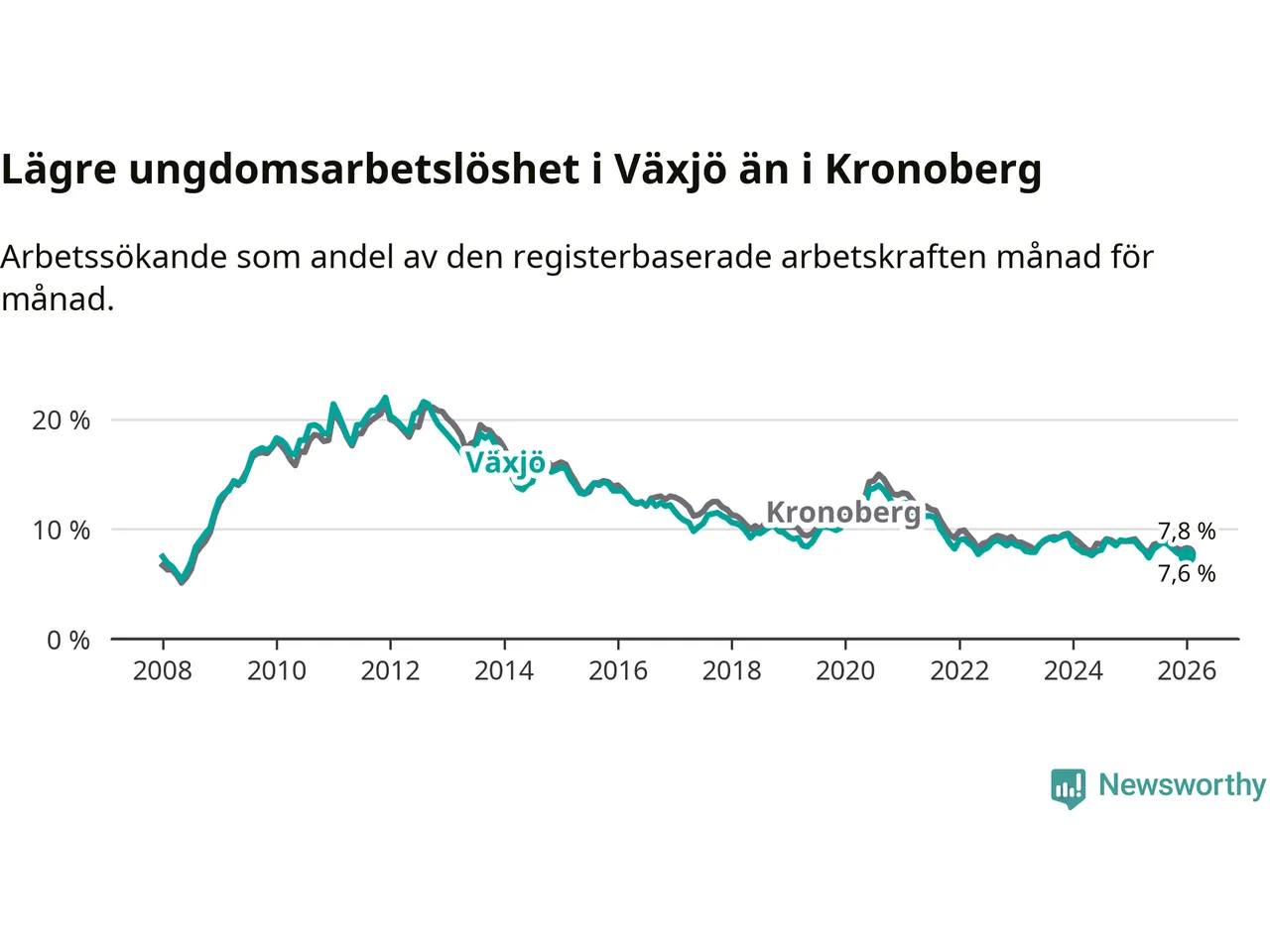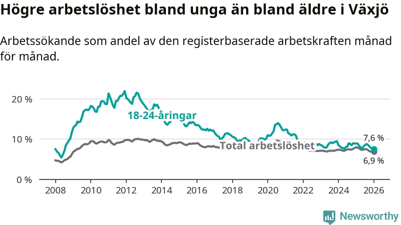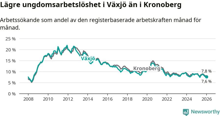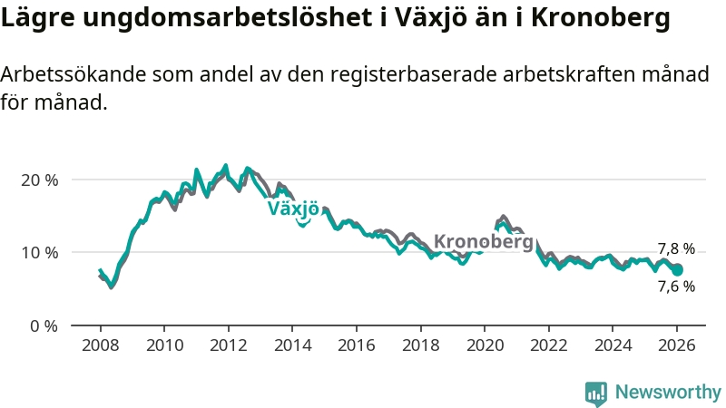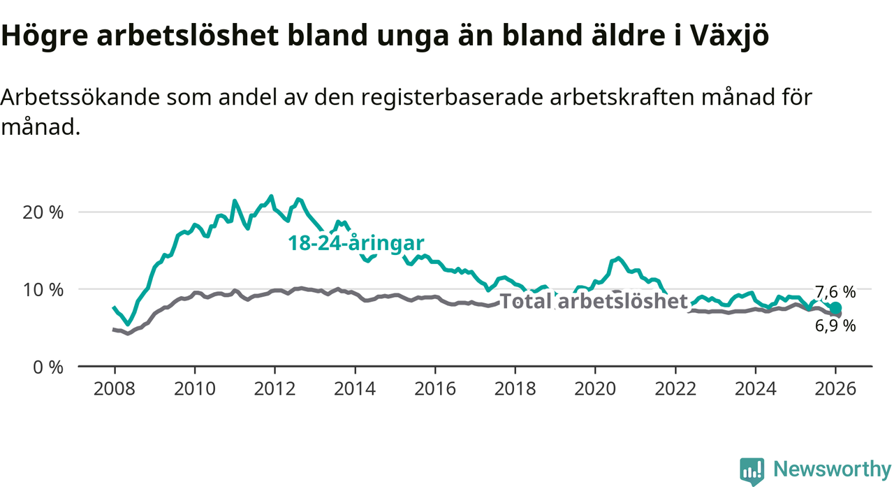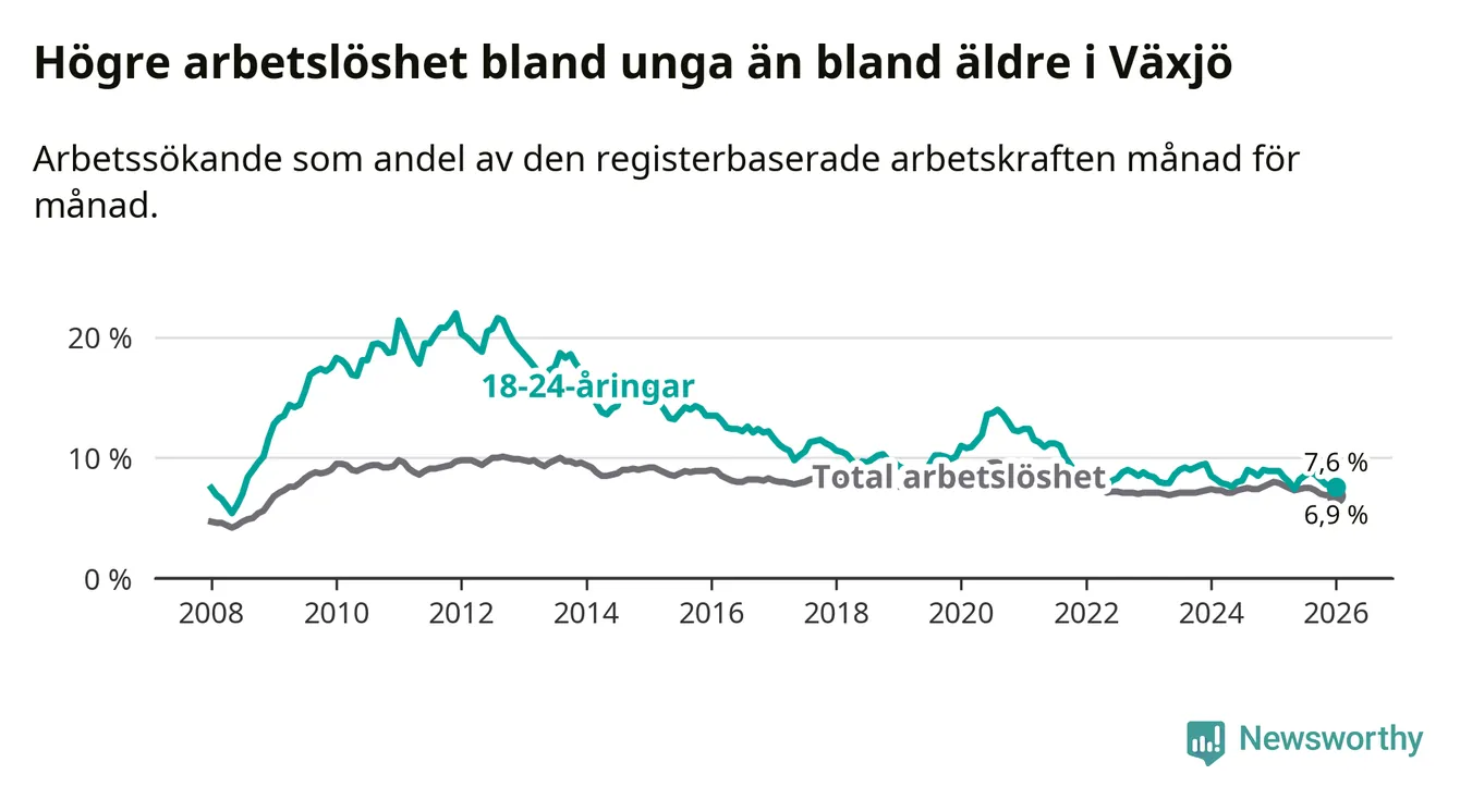 Arbetslösheten bland utlandsfödda var 17,1 procent i Växjö under januari månad, motsvarande 2 150 av 12 573 personer. Det är 3,1 procentenheter färre än vid samma tidpunkt i fjol (−311 om man räknar personer). Därmed är de utlandsföddas arbetslöshet lägre än vid samma tidpunkt i fjol för sjunde månaden i följd. Sedan juni 2025 har arbetslösheten bland utlandsfödda minskat från 18,6 till 17,1 procent.