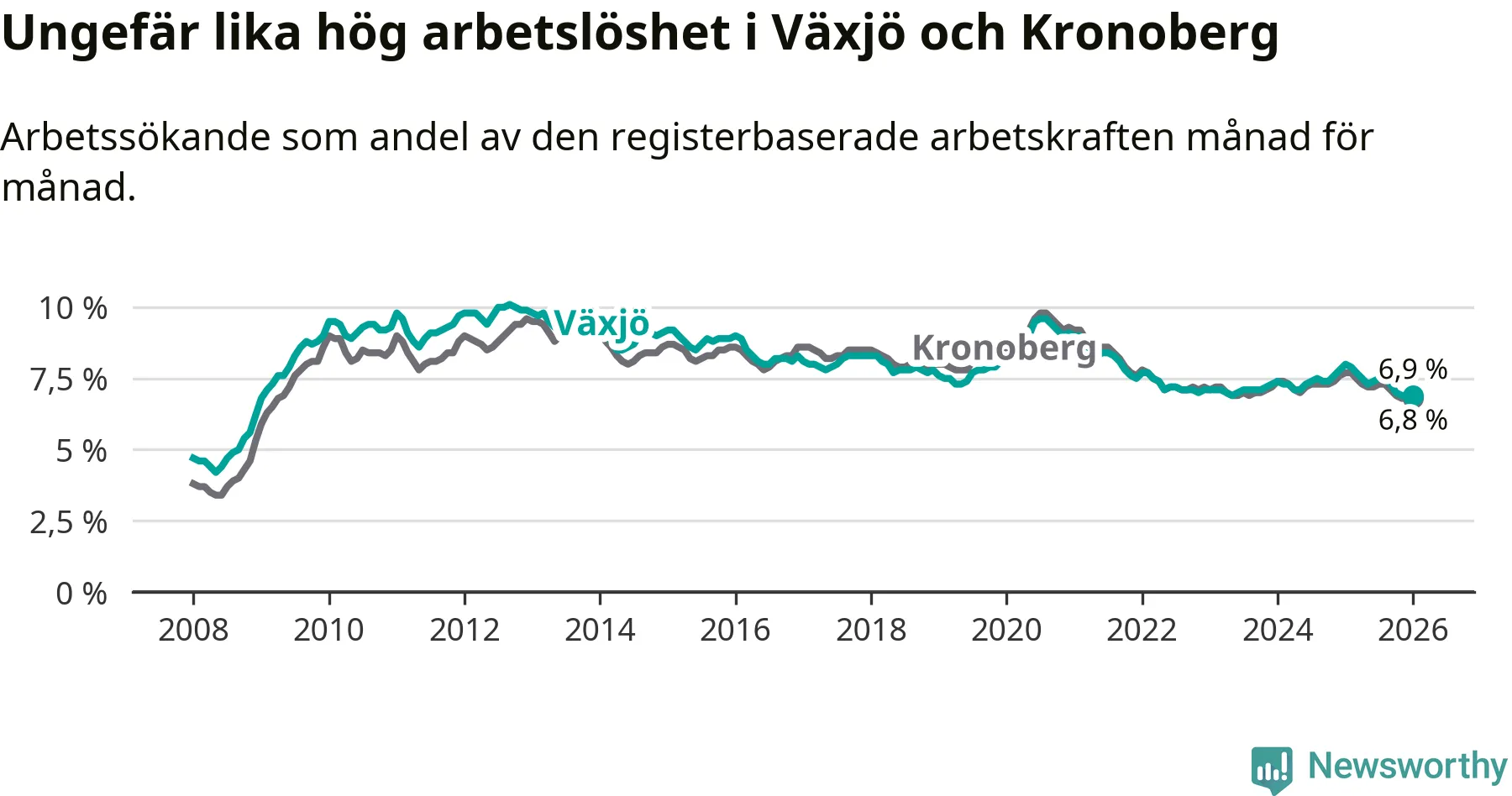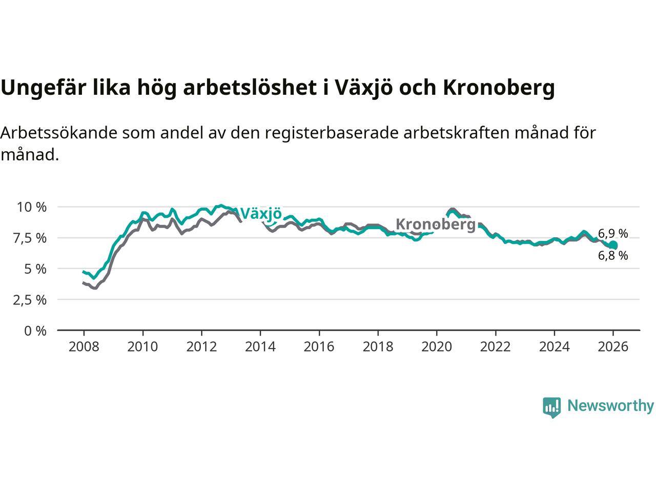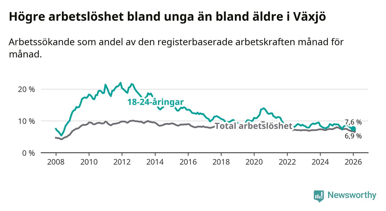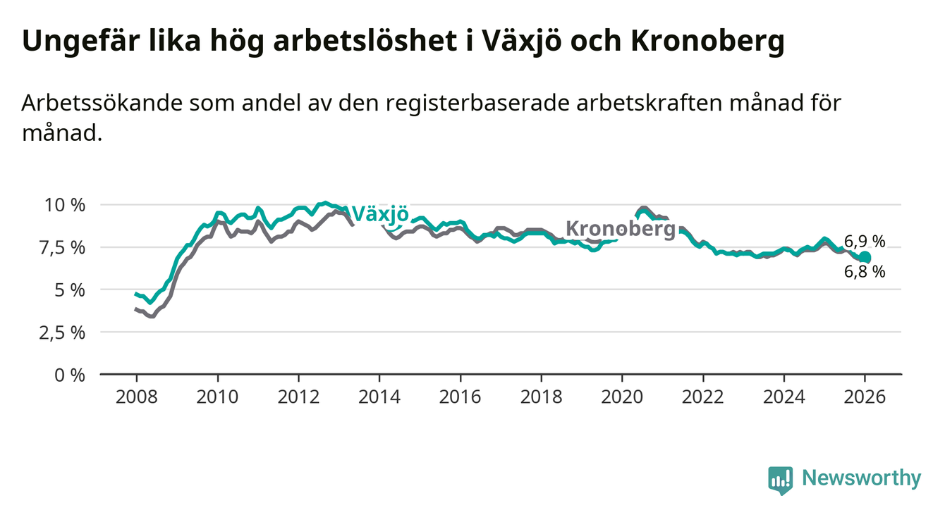 Under januari månad rapporterade Växjö kommun en total arbetslöshet på 6,9 procent. Det är en minskning jämfört med samma tidpunkt i fjol (−1,1 procentenheter). Även i Kronobergs län sjunker arbetslösheten .