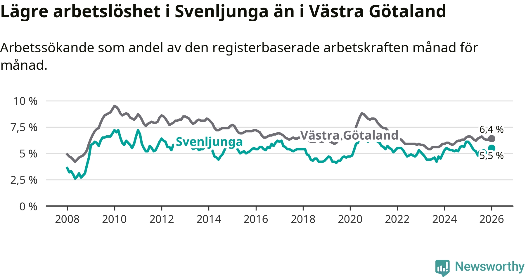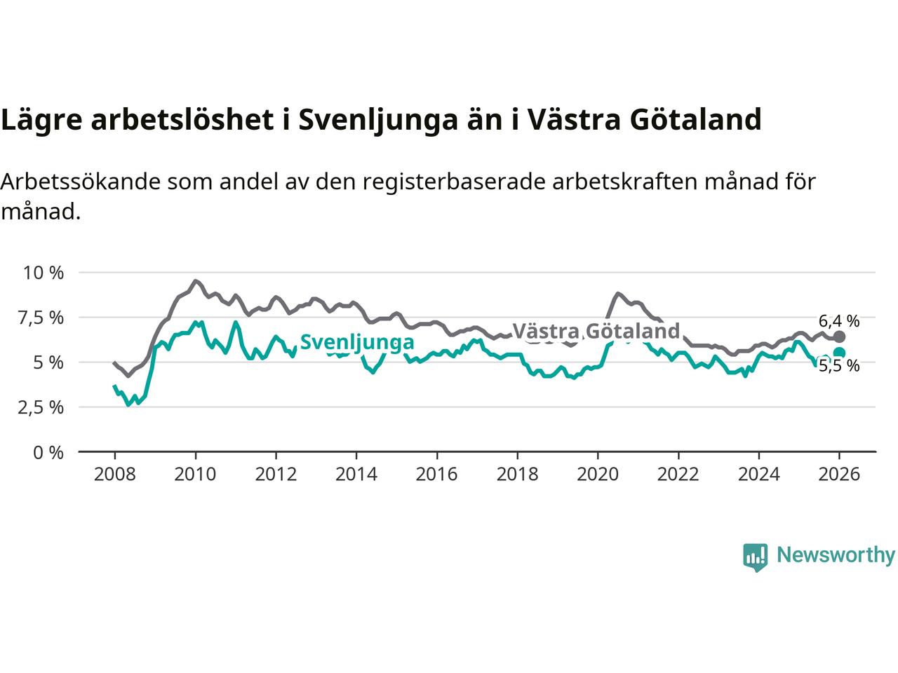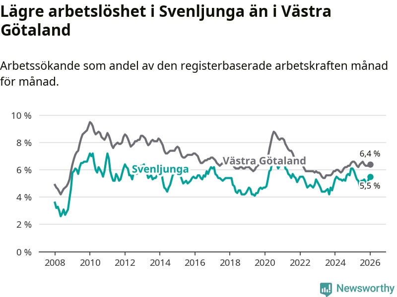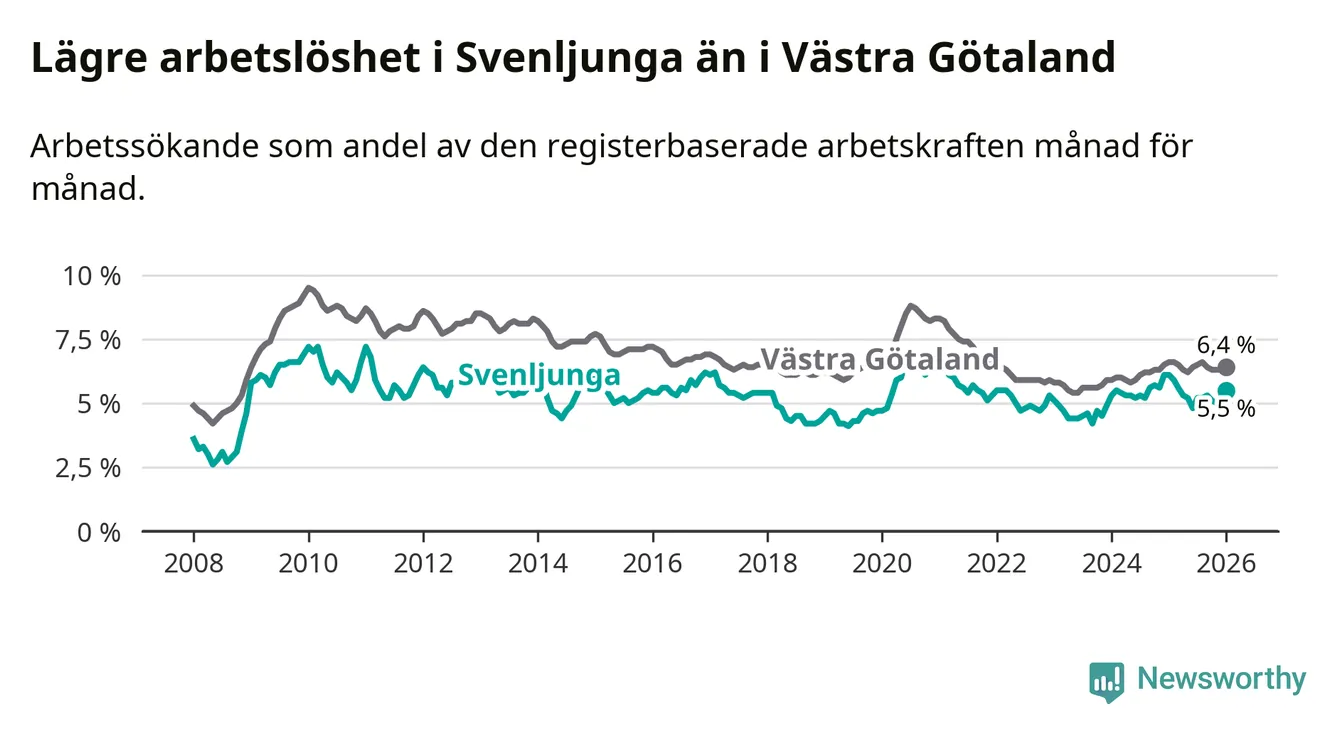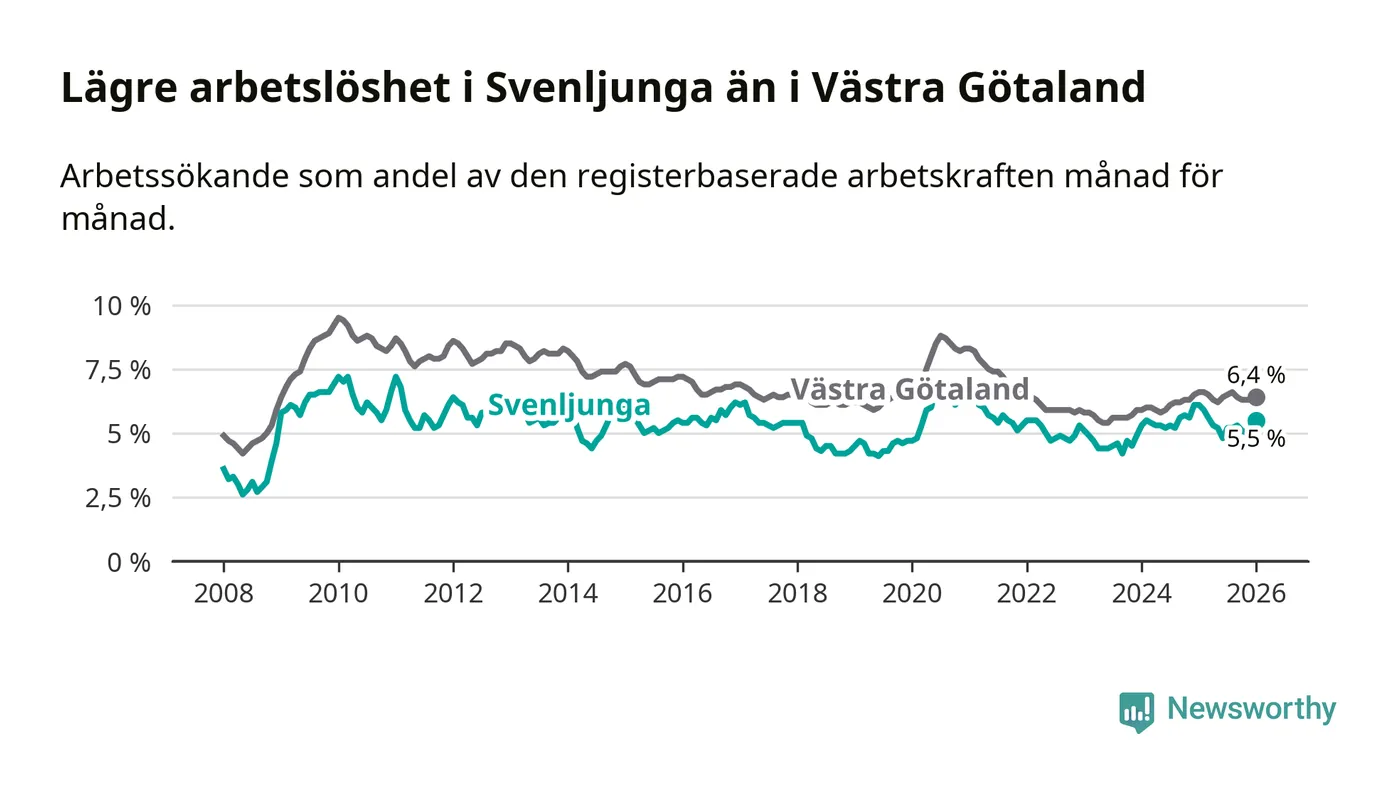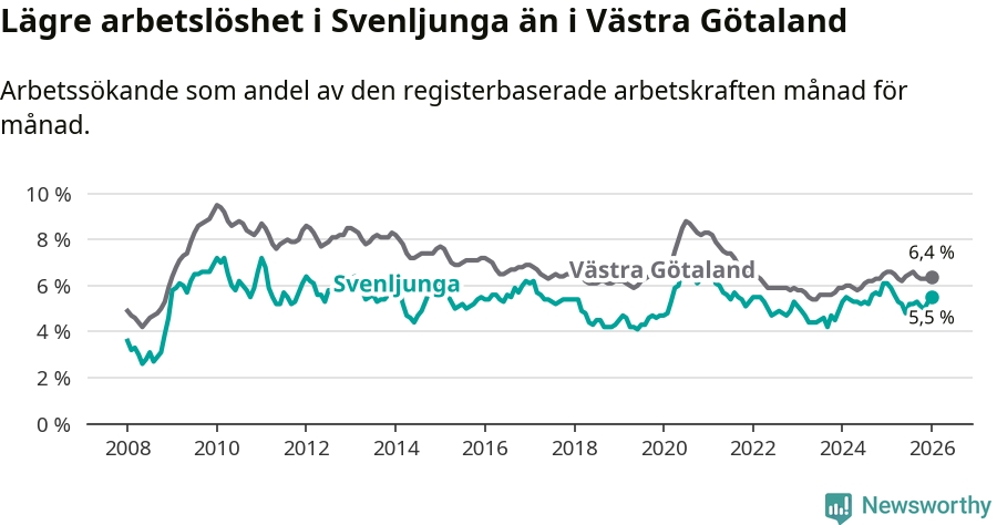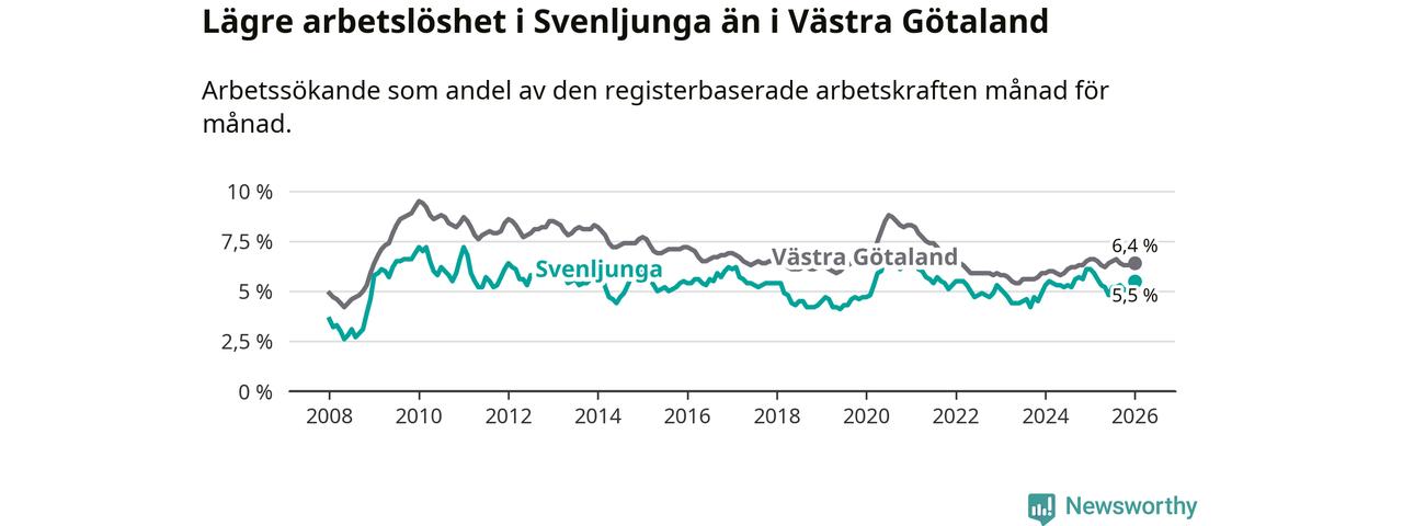 Under januari månad rapporterade Svenljunga kommun en total arbetslöshet på 5,5 procent. Det är en minskning jämfört med samma tidpunkt i fjol (−0,6 procentenheter). Även i Västra Götalands län sjunker arbetslösheten .