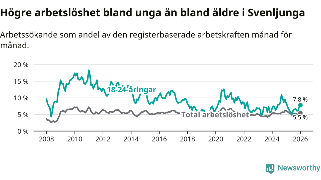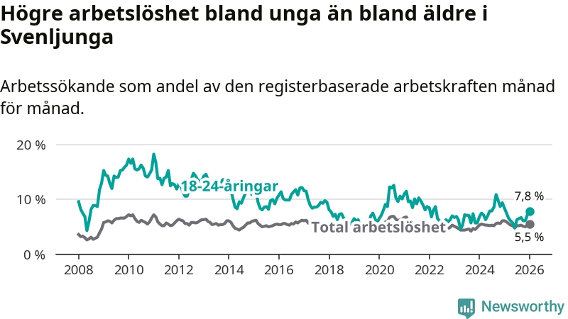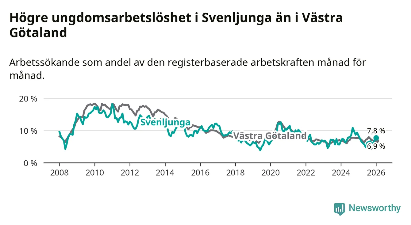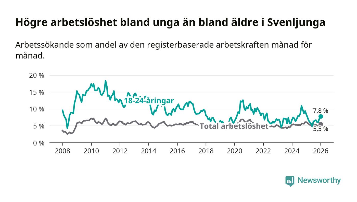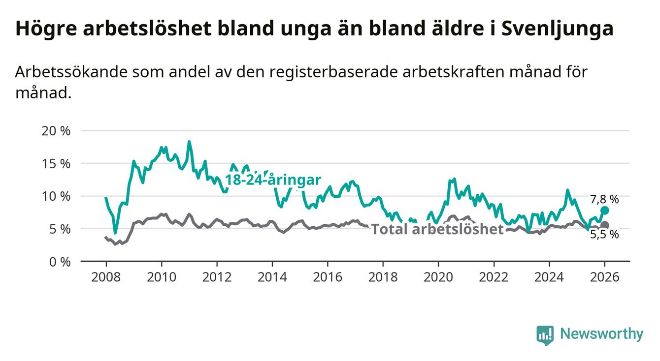 I och med den senaste månadens nedgång har de ungas arbetslöshet i Svenljunga sjunkit elva månader i följd (ner från 7,5 procent i februari 2025 till 7,8 procent nu).