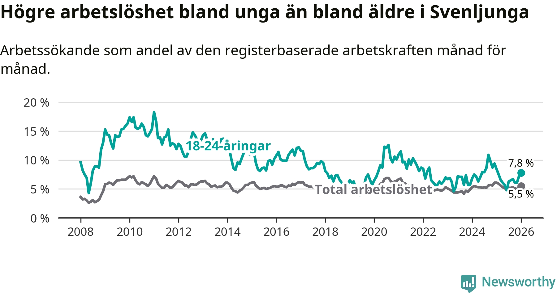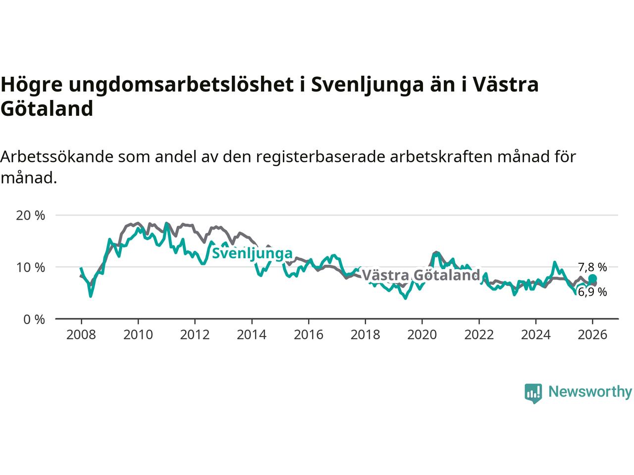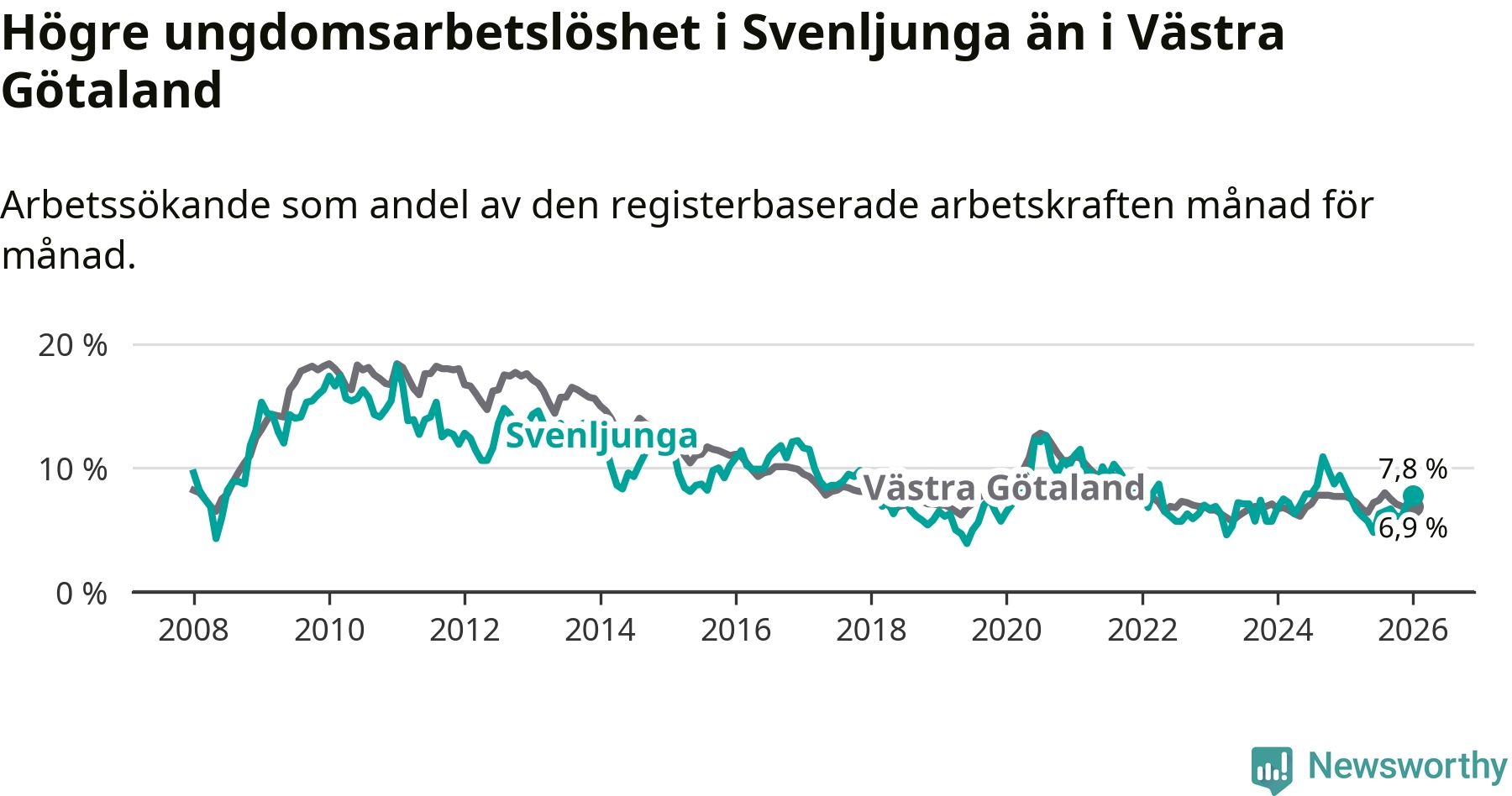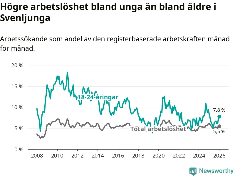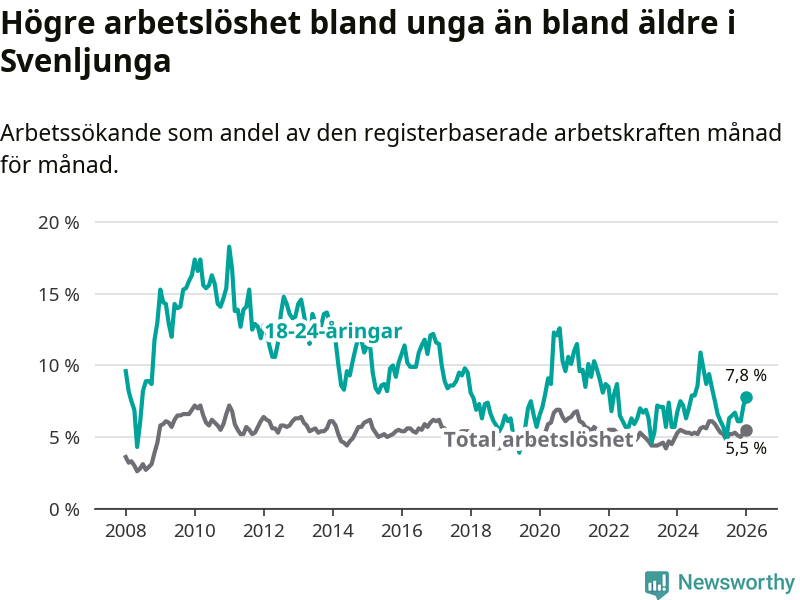 I och med den senaste månadens nedgång har de ungas arbetslöshet i Svenljunga sjunkit elva månader i följd (ner från 7,5 procent i februari 2025 till 7,8 procent nu).