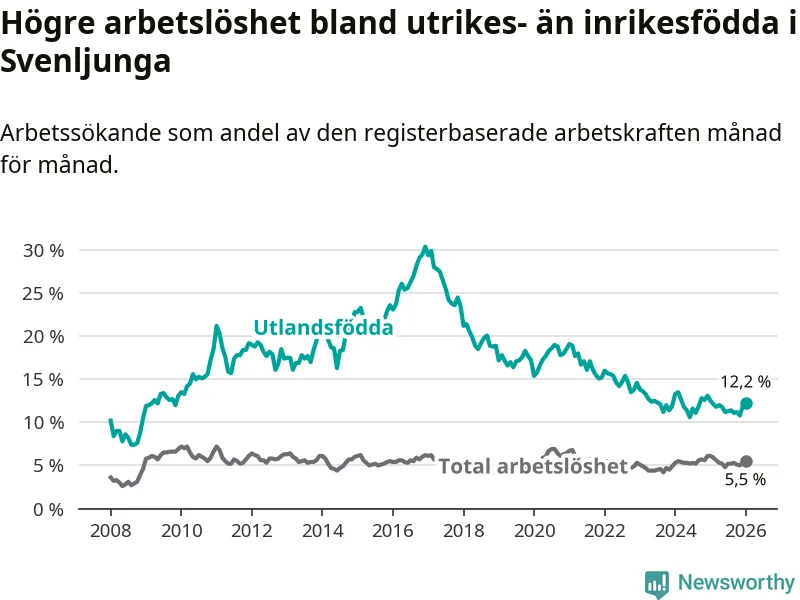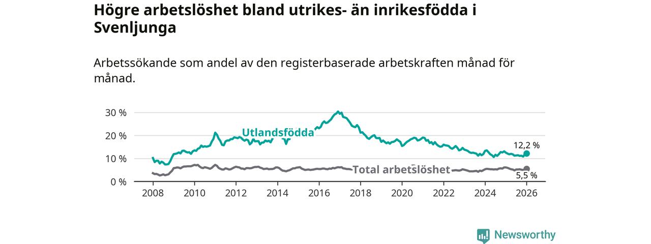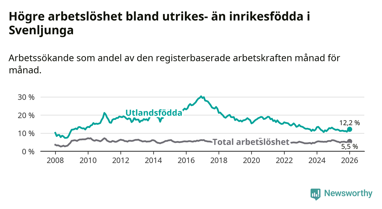Arbetslösheten bland utlandsfödda var 12,2 procent i Svenljunga under januari månad, motsvarande 104 av 852 personer. Det är 0,3 procentenheter färre än vid samma tidpunkt i fjol (−4 om man räknar personer).