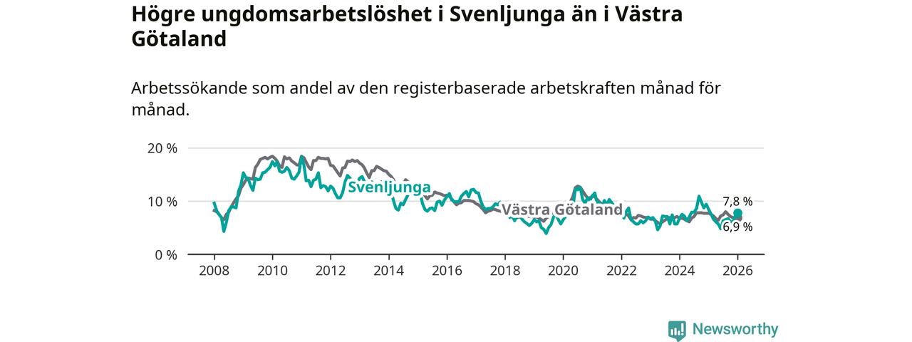 Medan Svenljunga har lägre total arbetslöshet än Västra Götaland, ligger ungdomsarbetslösheten 0,9 procentenheter högre i Svenljunga.