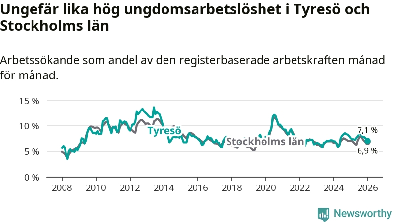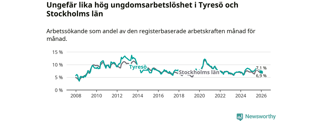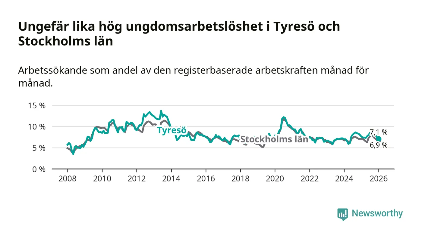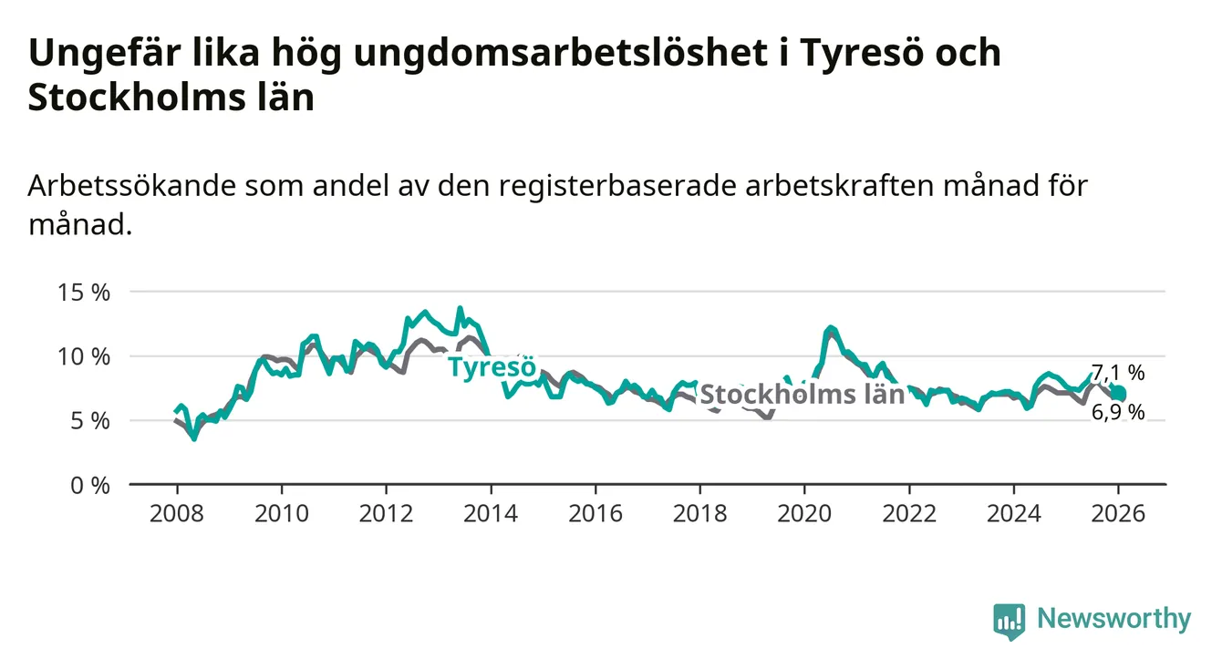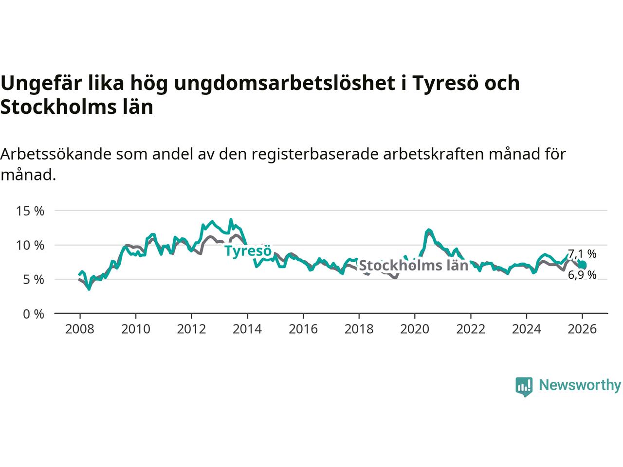 Medan Tyresö har lägre total arbetslöshet än Stockholms län, ligger ungdomsarbetslösheten på i stort sett samma nivå.