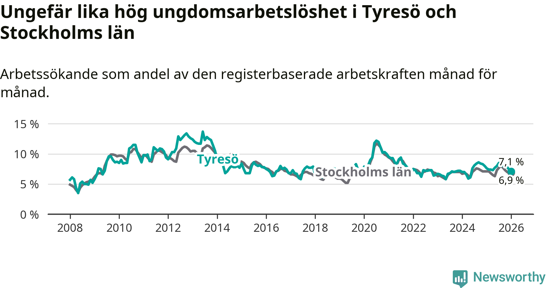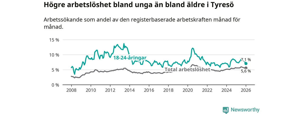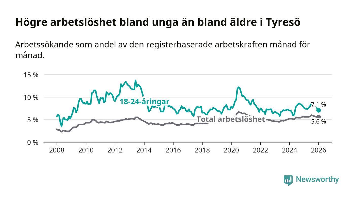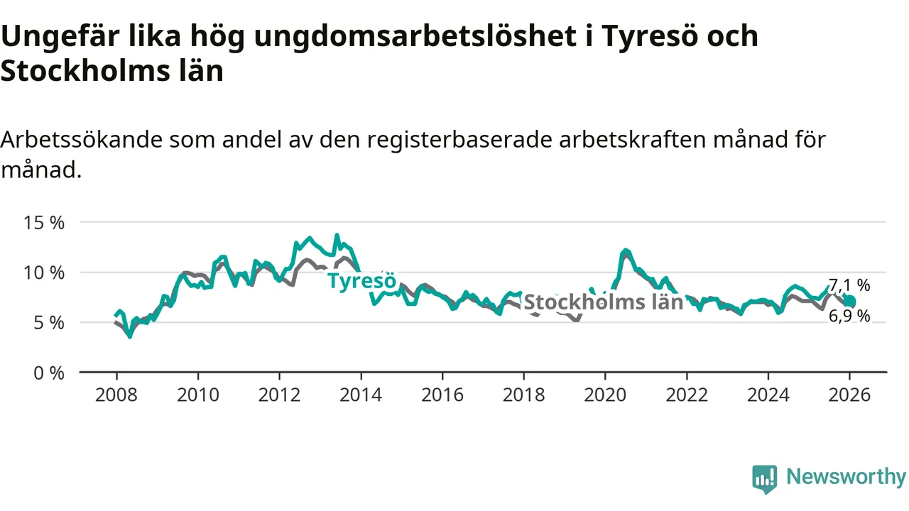 Medan Tyresö har lägre total arbetslöshet än Stockholms län, ligger ungdomsarbetslösheten på i stort sett samma nivå.
