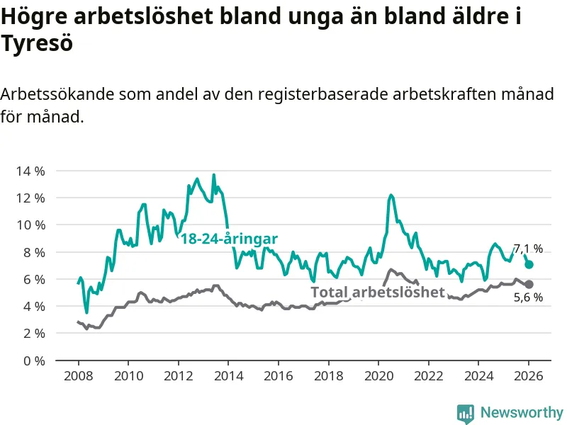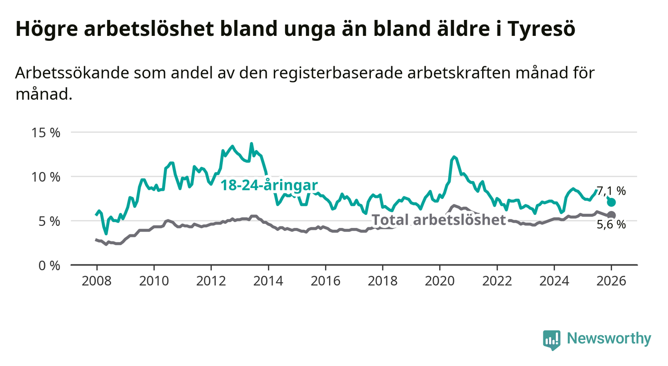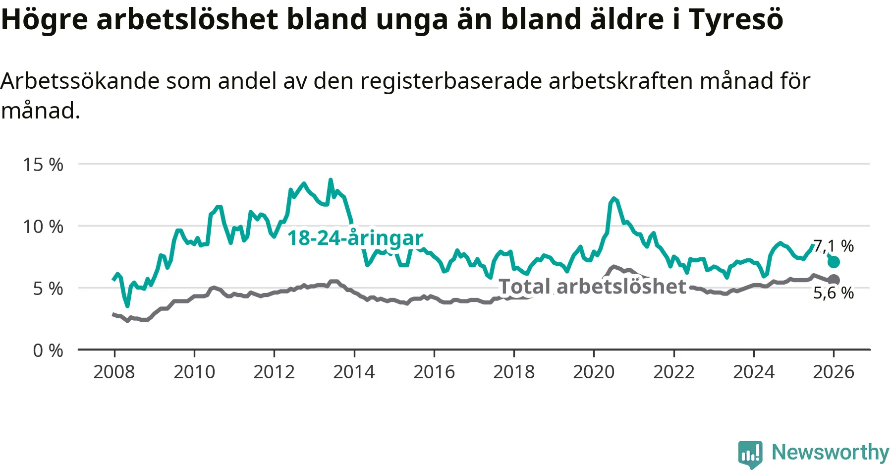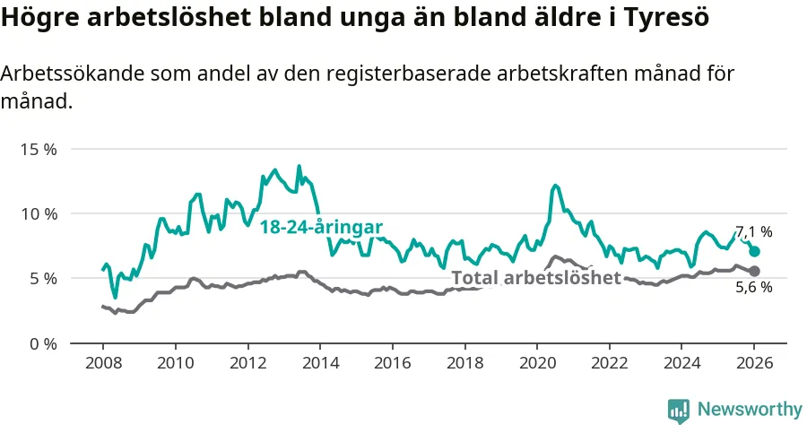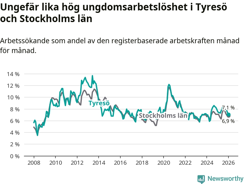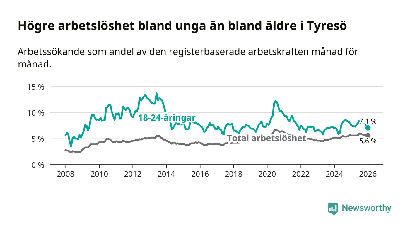 Medan Tyresö har lägre total arbetslöshet än Stockholms län, ligger ungdomsarbetslösheten på i stort sett samma nivå.