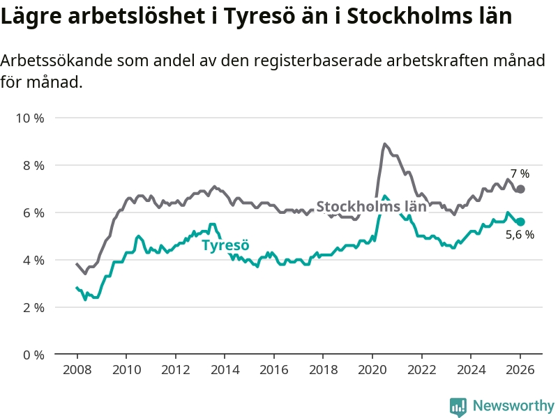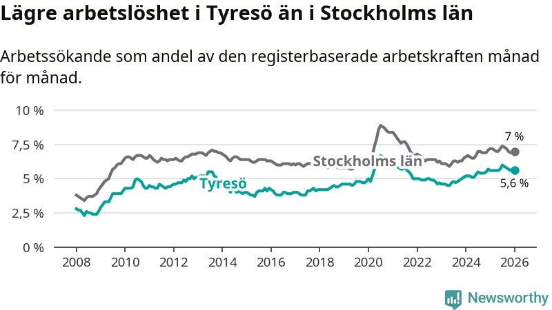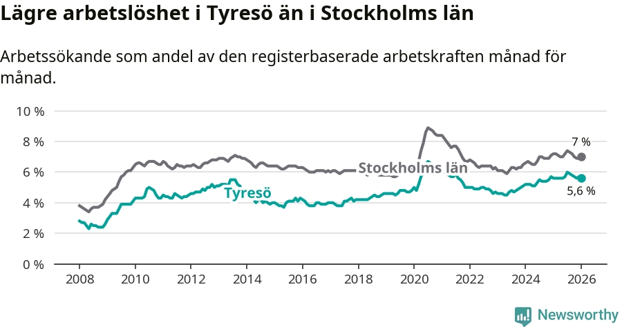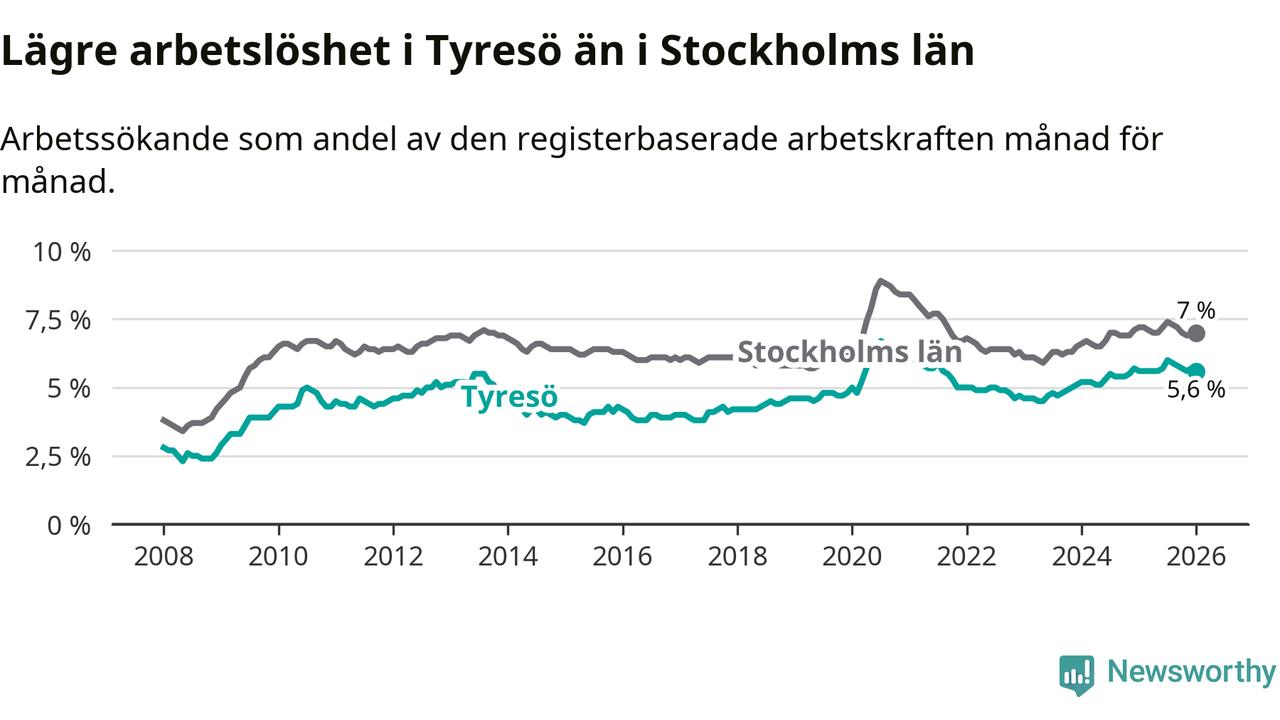 Under januari månad rapporterade Tyresö kommun en total arbetslöshet på 5,6 procent. Det är i samma nivå som i januari i fjol. I Stockholms län däremot sjunker arbetslösheten något