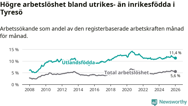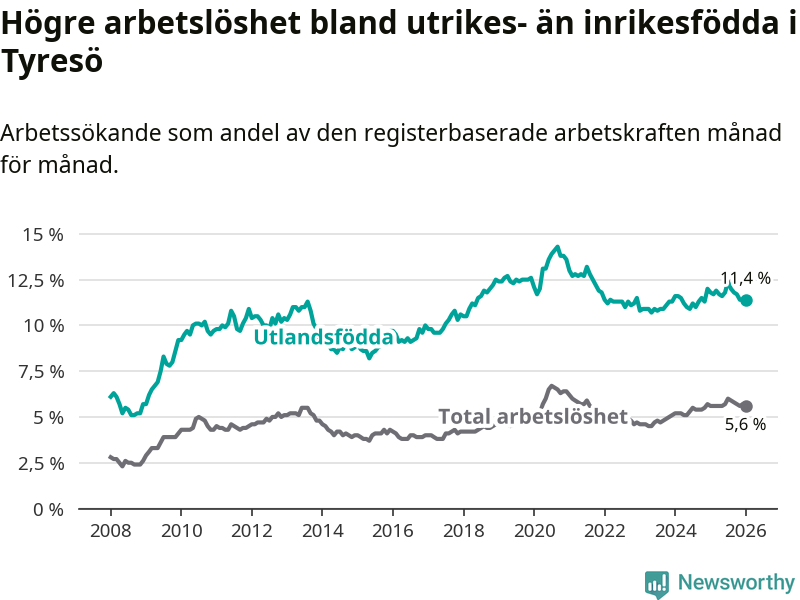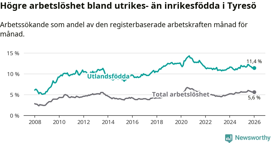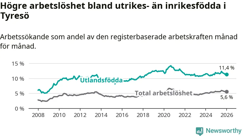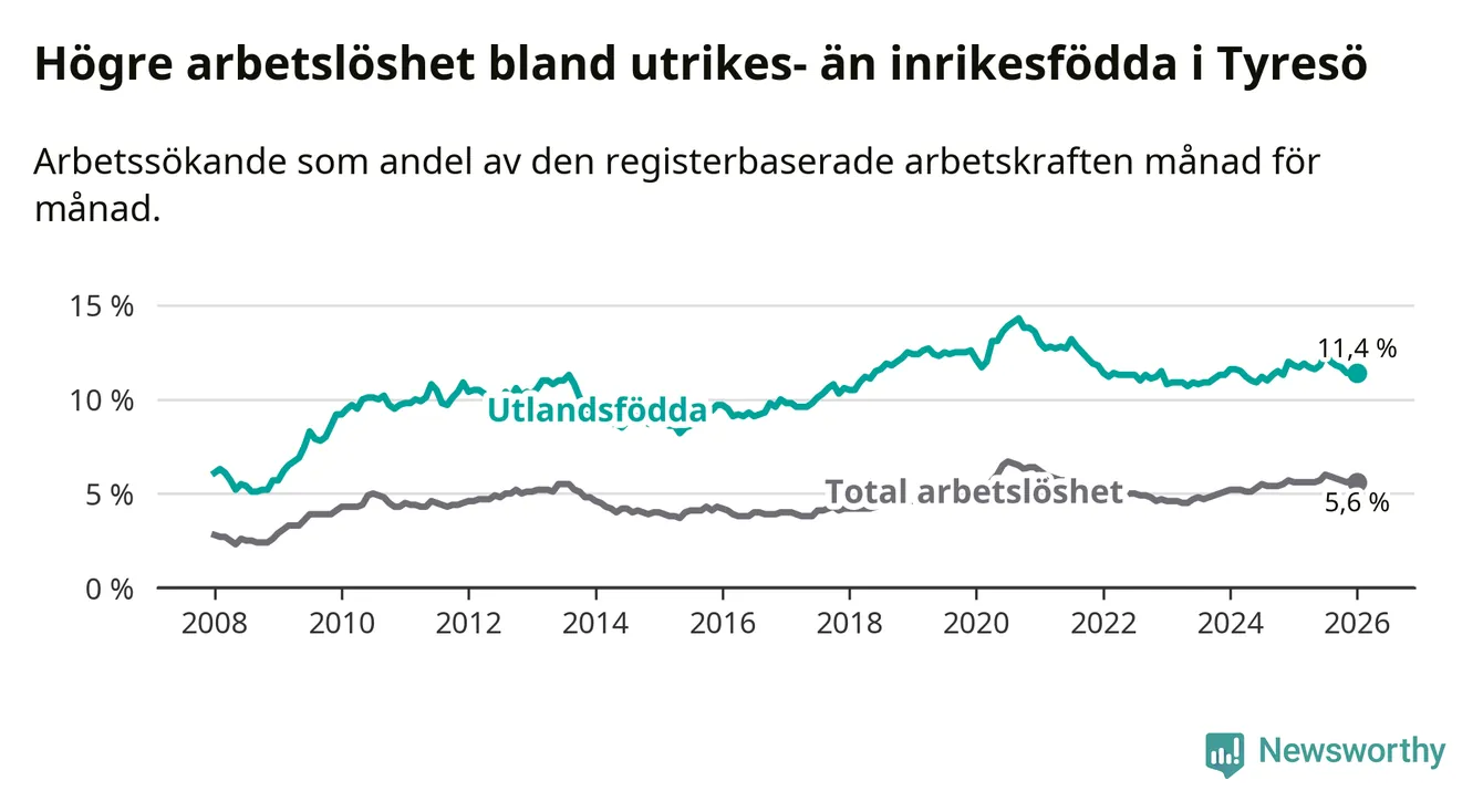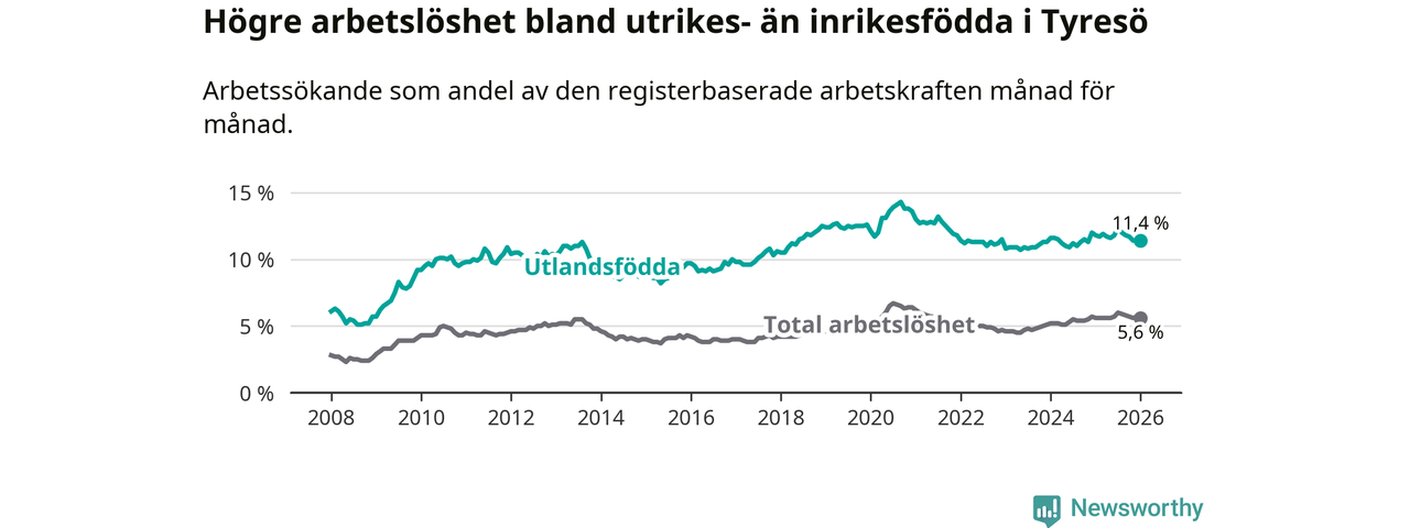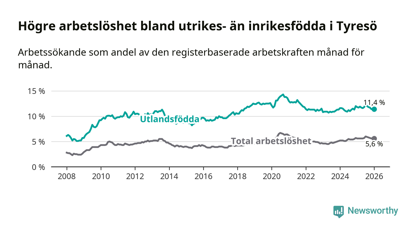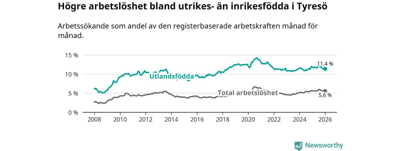Arbetslösheten bland utlandsfödda var 11,4 procent i Tyresö under januari månad, motsvarande 595 av 5 219 personer. Det är 0,4 procentenheter färre än vid samma tidpunkt i fjol (−13 om man räknar personer).