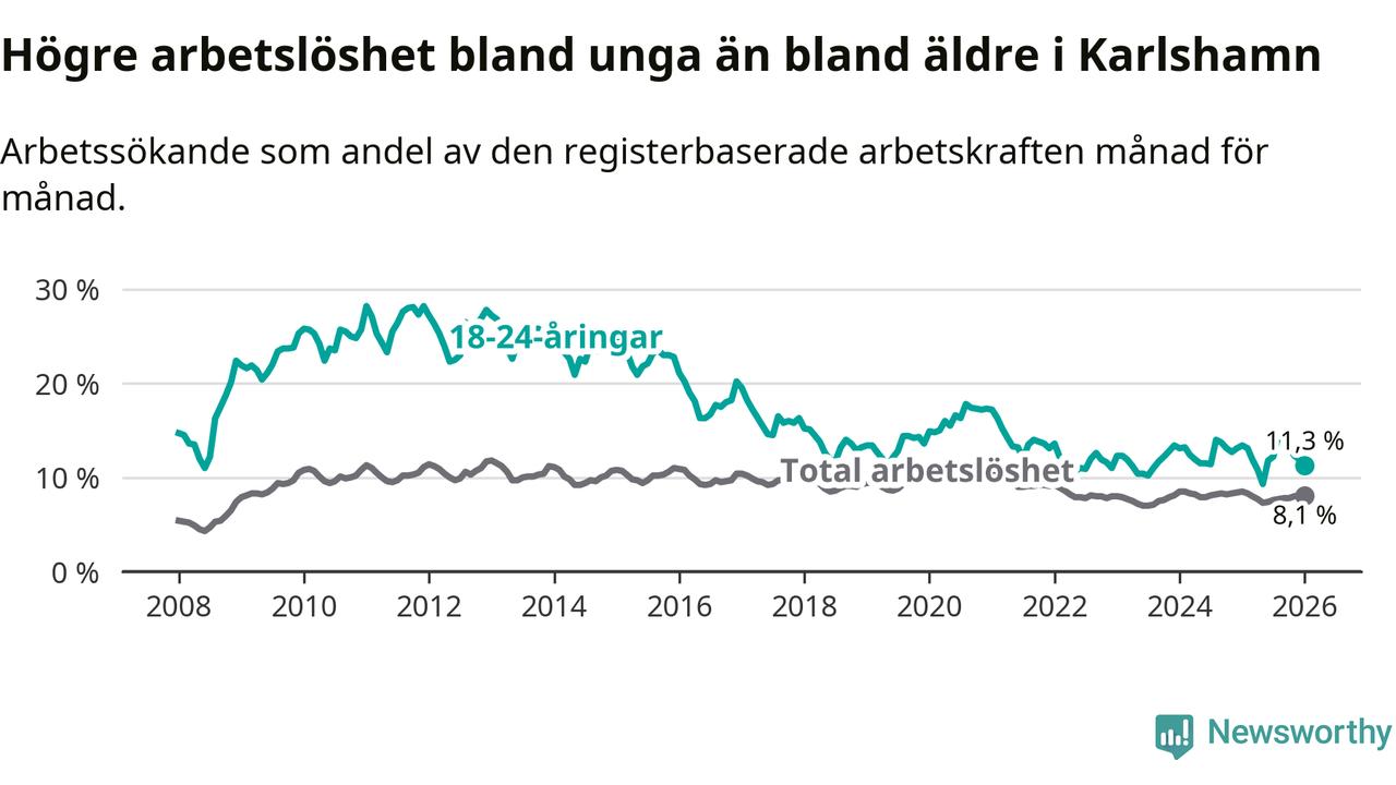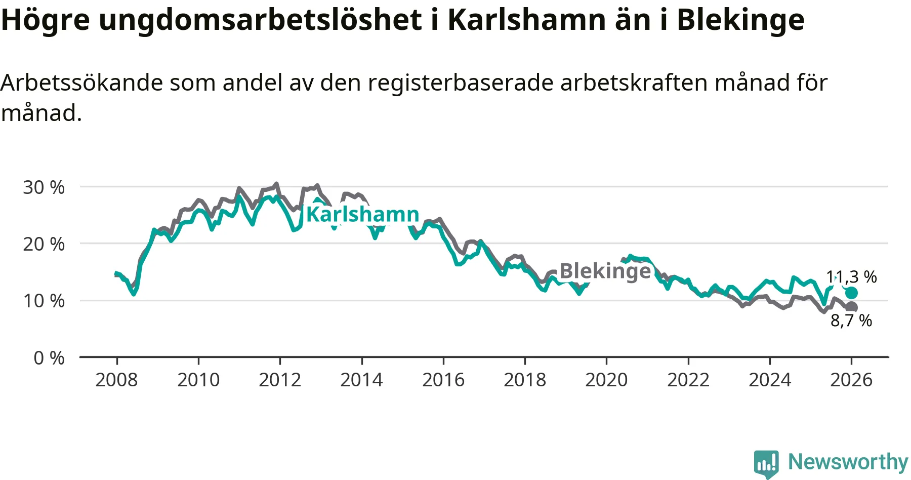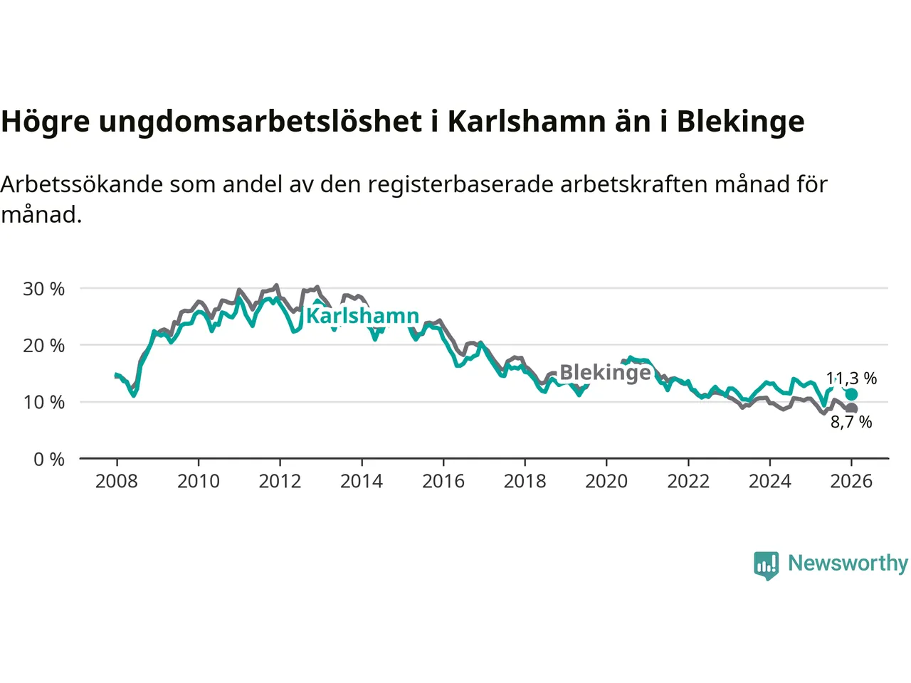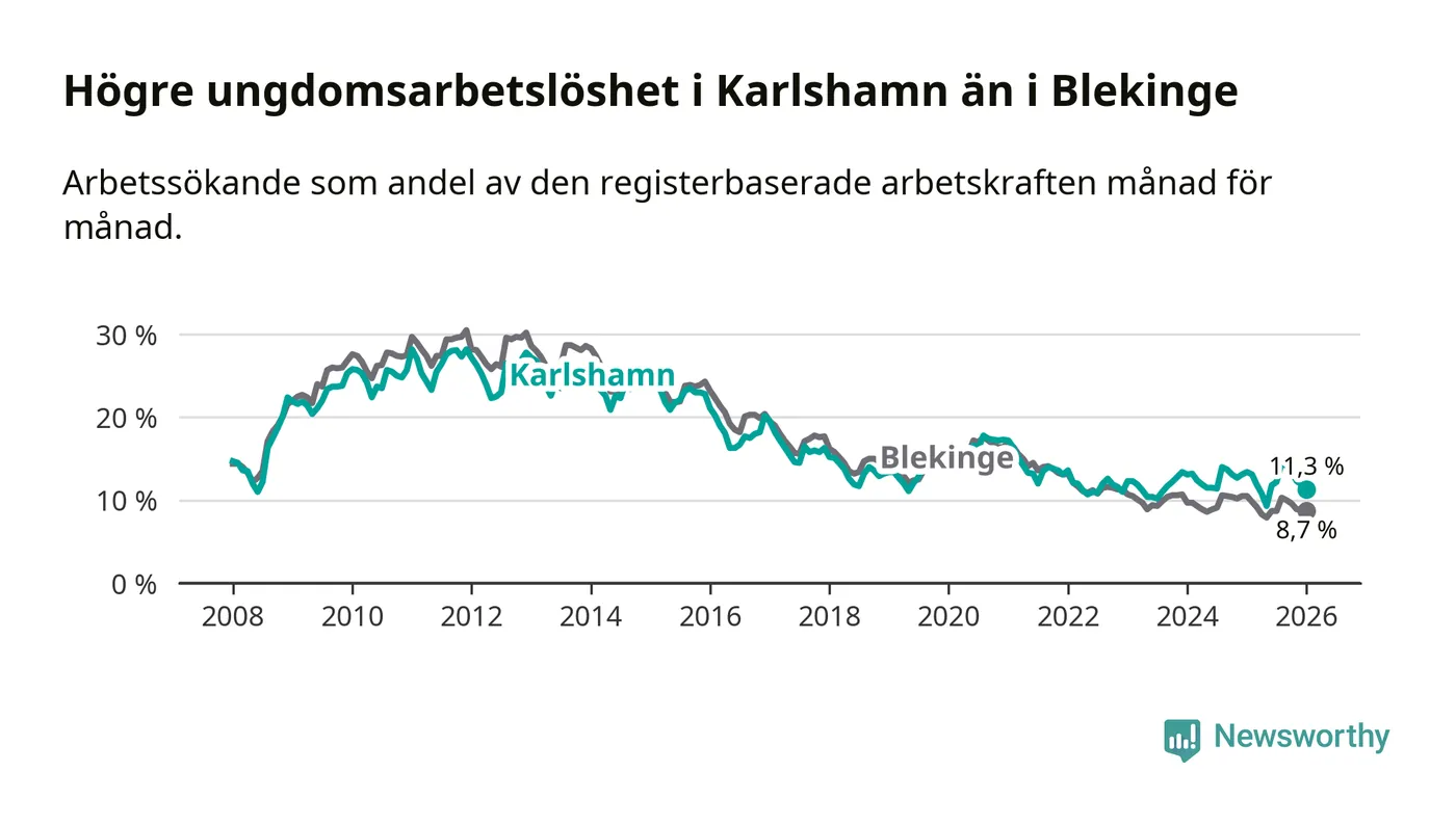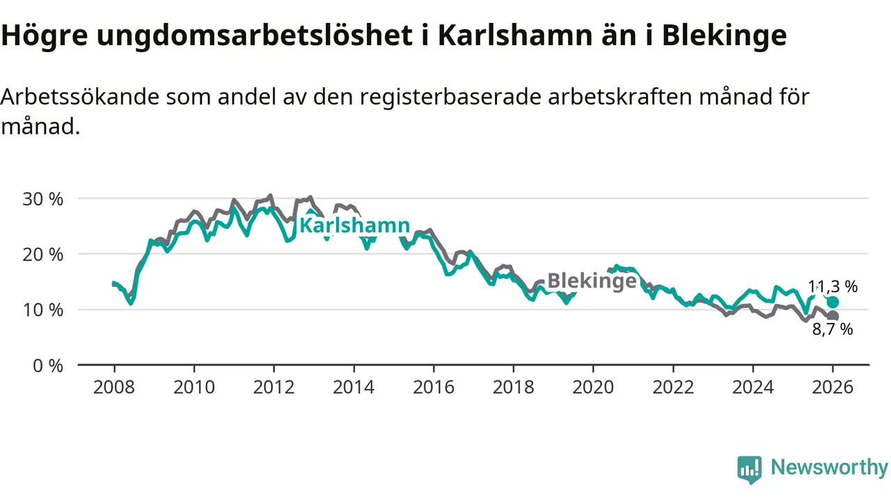Precis som den totala arbetslösheten ligger ungdomsarbetslösheten i Karlshamn högre än i Blekinge som helhet. Skillnaden mellan kommunen och länet är 2,6 procentenheter.