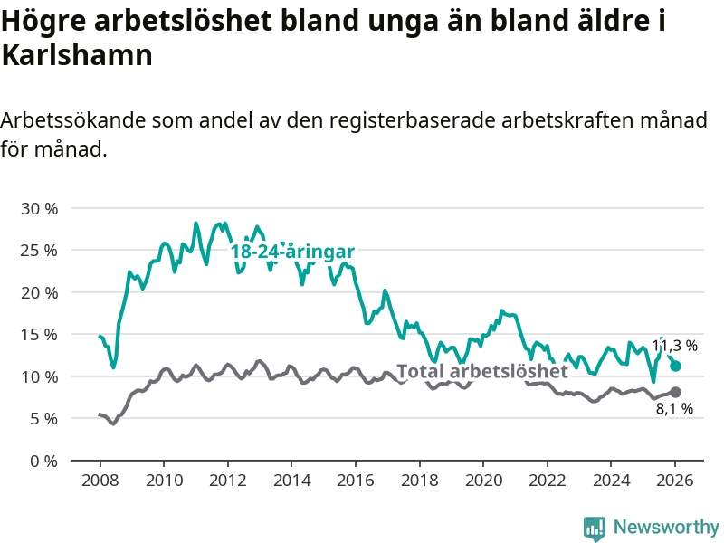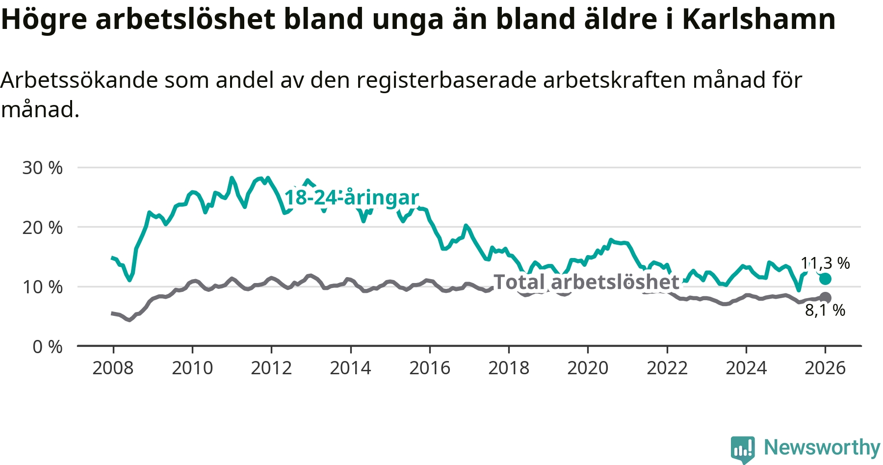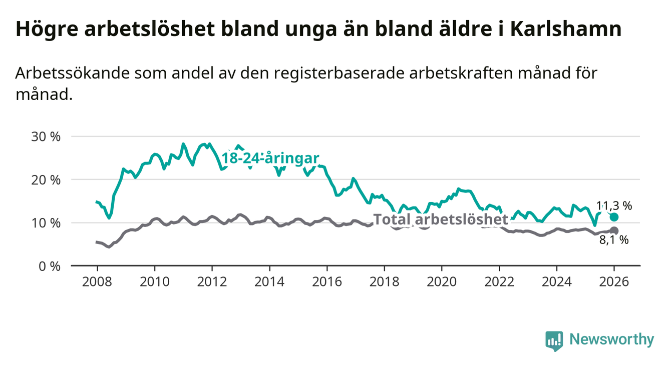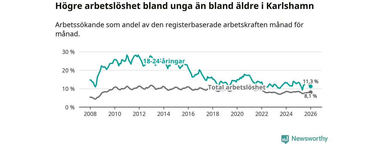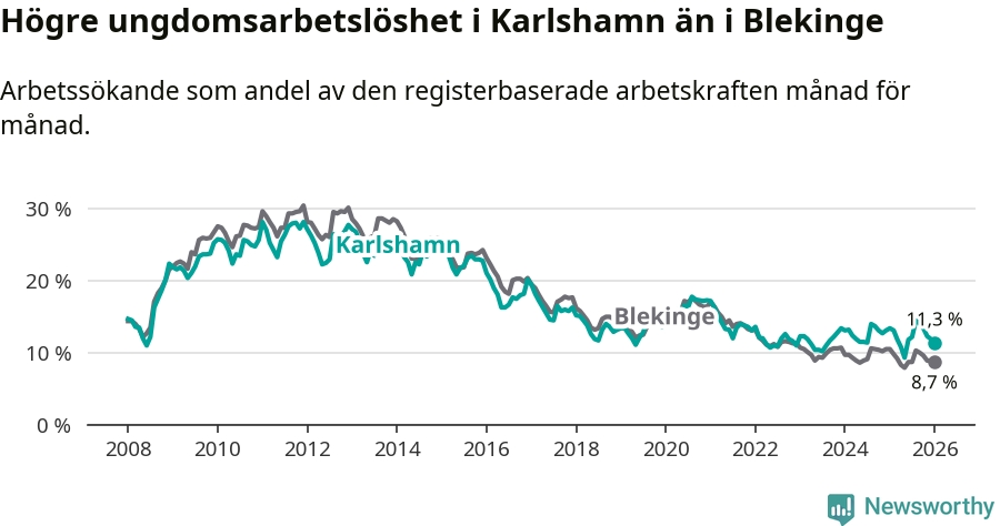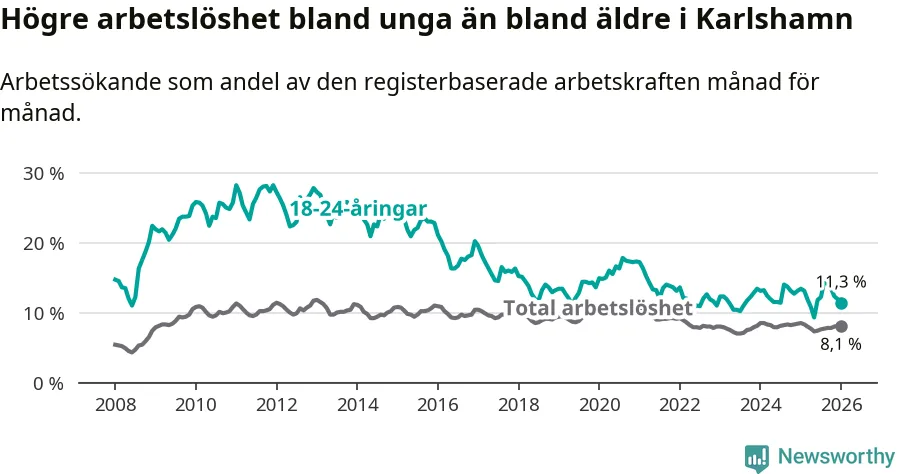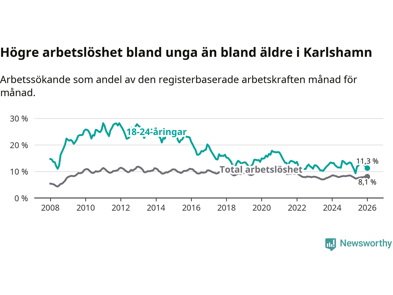 Precis som den totala arbetslösheten ligger ungdomsarbetslösheten i Karlshamn högre än i Blekinge som helhet. Skillnaden mellan kommunen och länet är 2,6 procentenheter.