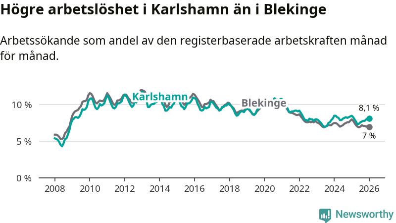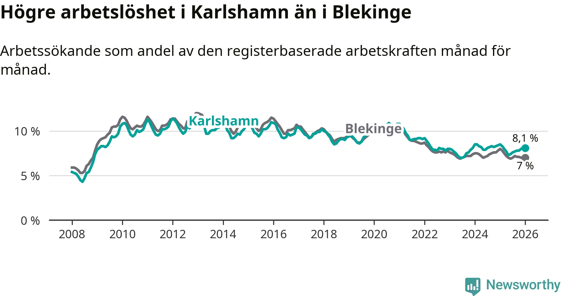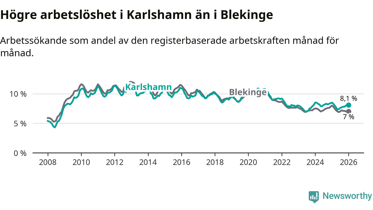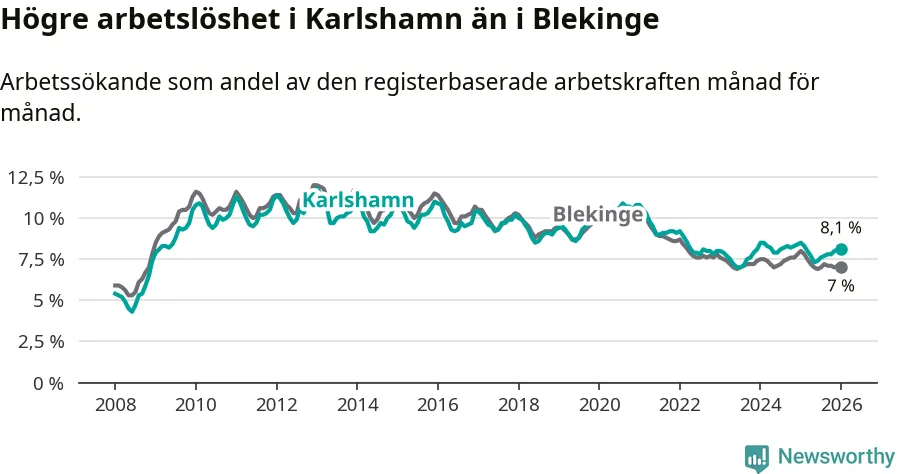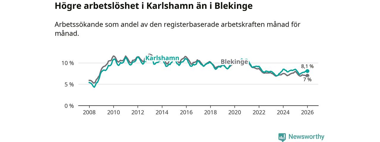 Under januari månad rapporterade Karlshamns kommun en total arbetslöshet på 8,1 procent. Det är en minskning jämfört med samma tidpunkt i fjol (−0,4 procentenheter). Även i Blekinge län sjunker arbetslösheten .