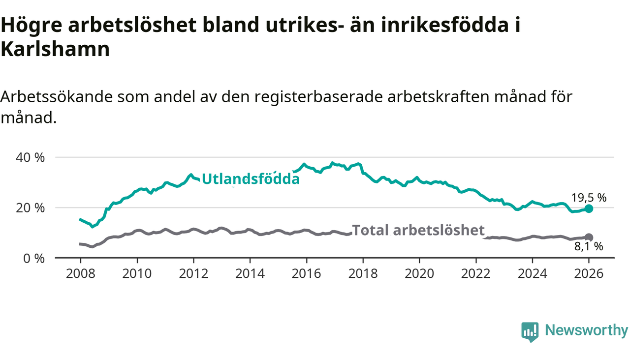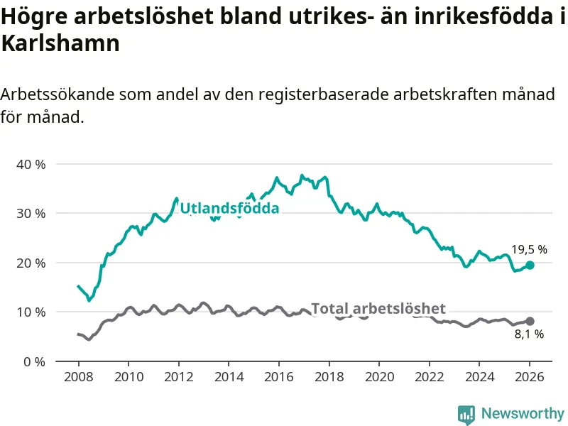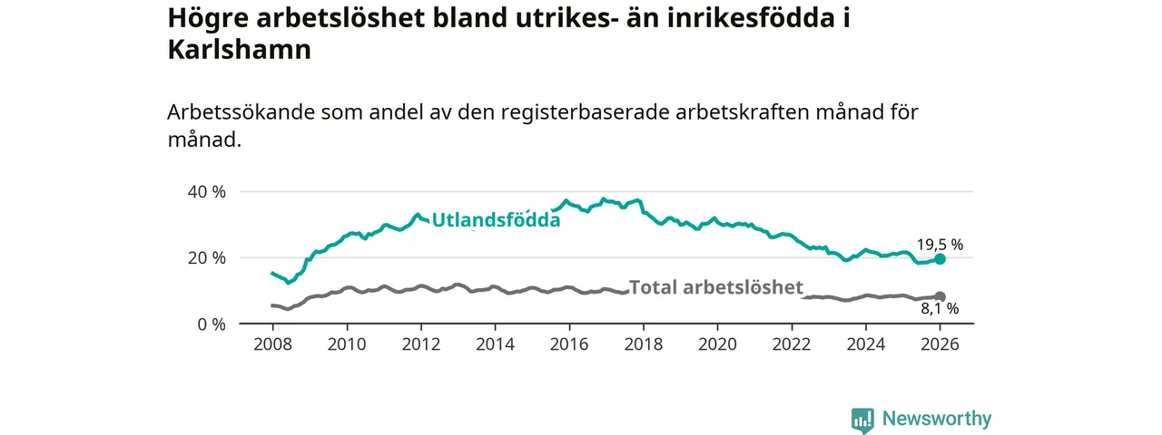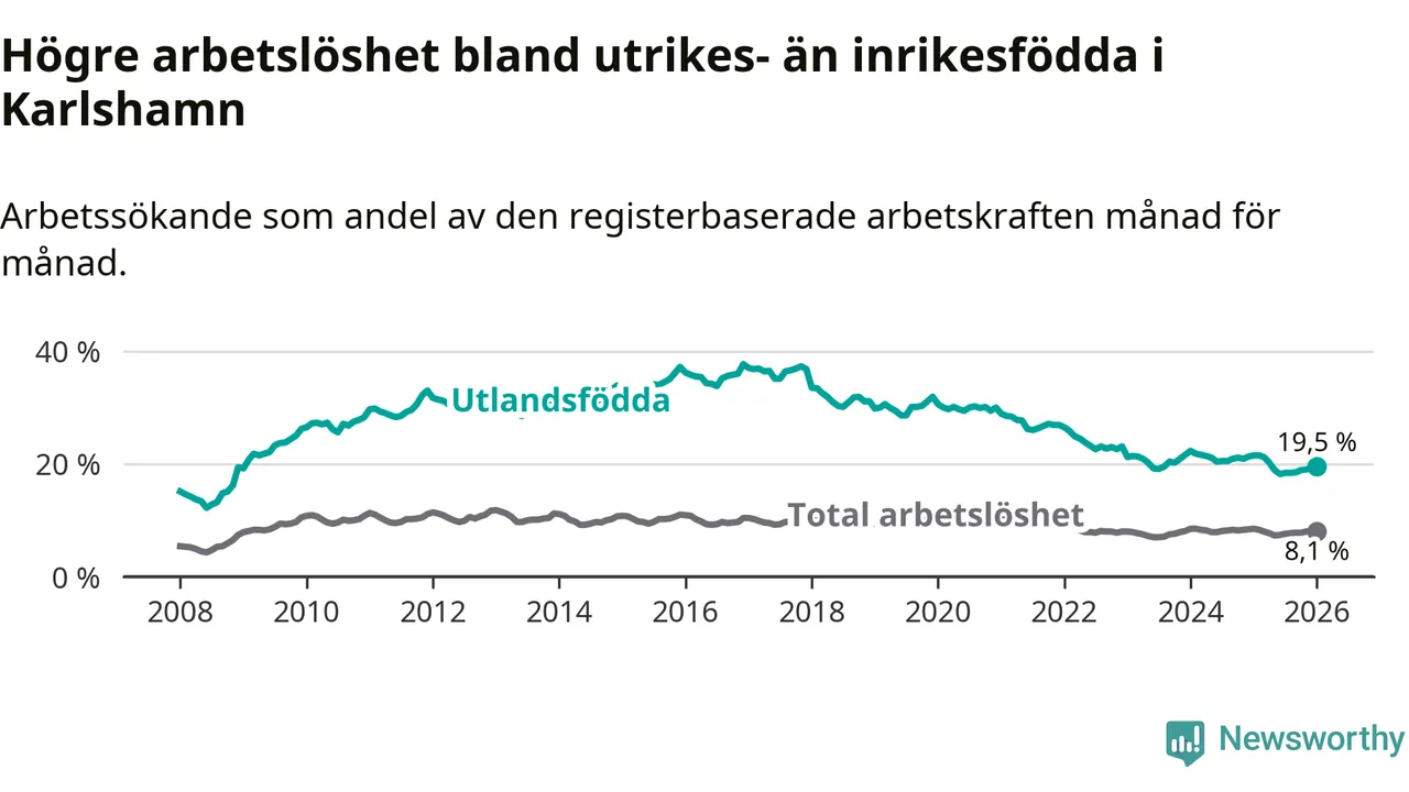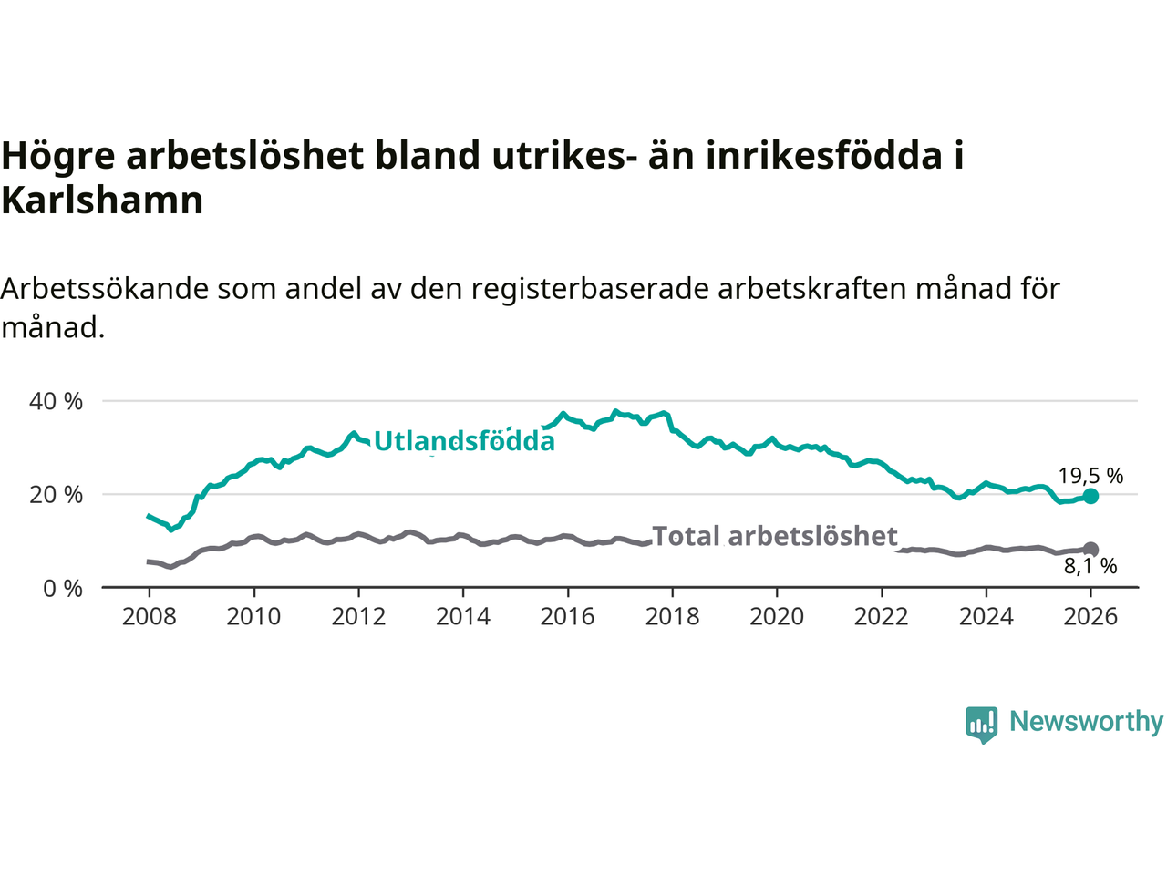 Arbetslösheten bland utlandsfödda var 19,5 procent i Karlshamn under januari månad, motsvarande 518 av 2 656 personer. Det är 2,0 procentenheter färre än vid samma tidpunkt i fjol (−46 om man räknar personer). Därmed är de utlandsföddas arbetslöshet lägre än vid samma tidpunkt i fjol för 14:e månaden i följd. Sedan november 2024 har arbetslösheten bland utlandsfödda minskat från 20,9 till 19,5 procent.