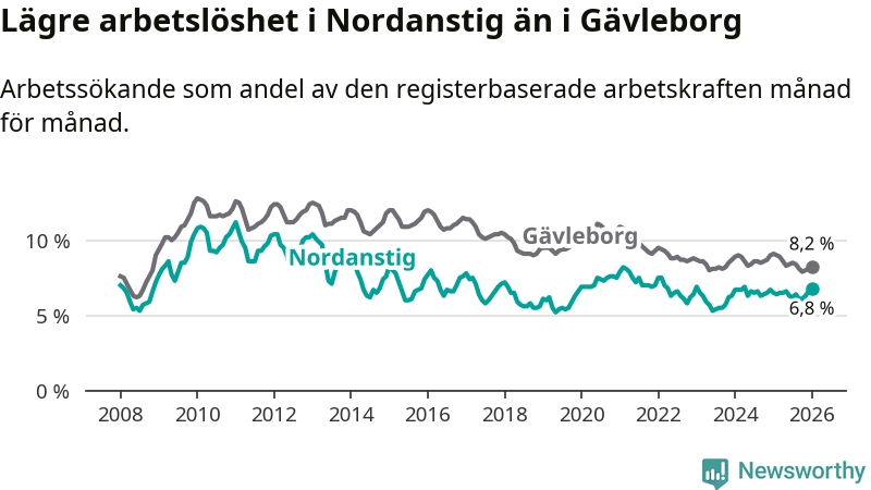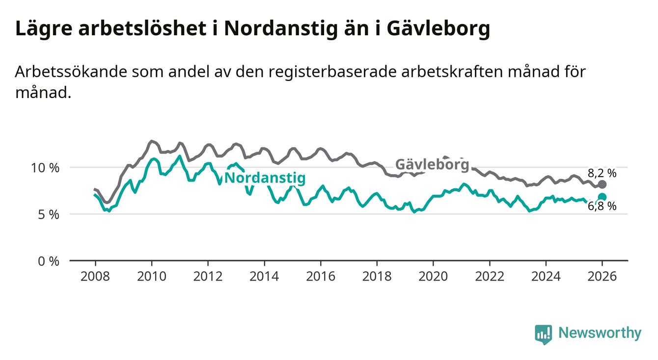 Även om arbetslösheten i Nordanstig alltså ökar, så ligger den fortfarande under snittet i hela Gävleborgs län (6,8 procent i kommunen, jämfört med 8,2 procent i hela länet). Hudiksvall har den lägsta arbetslösheten i länet (6,1 procent), medan Söderhamn har den högsta (9,0 procent). För att Nordanstig skulle komma ner i samma arbetslöshetsnivå som Hudiksvall skulle 29 personer behöva sysselsättas.