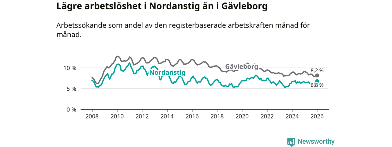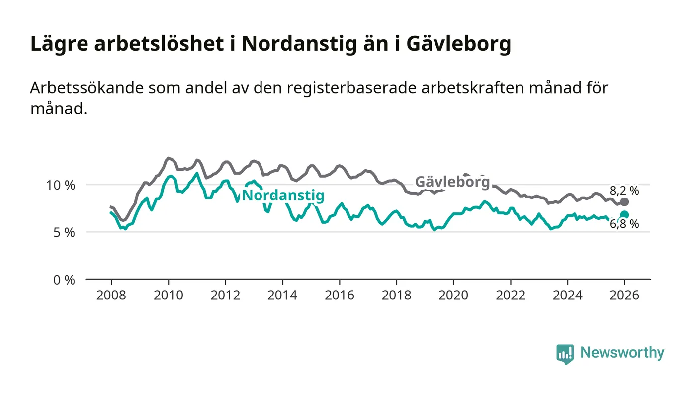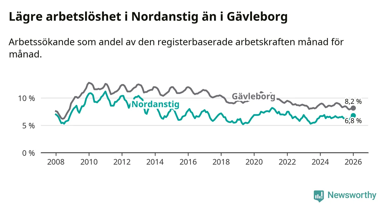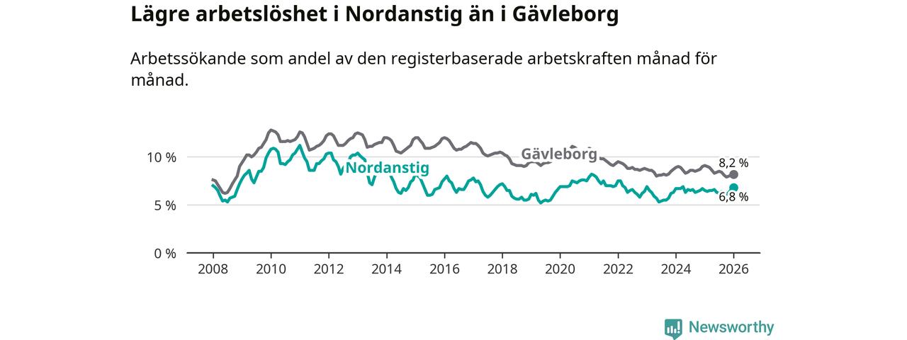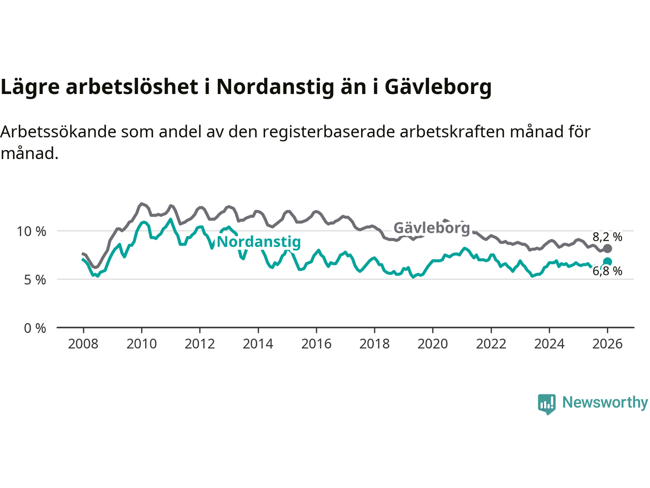 Under januari månad rapporterade Nordanstigs kommun en total arbetslöshet på 6,8 procent. Det är en ökning jämfört med samma tidpunkt i fjol (+0,3 procentenheter). I Gävleborgs län däremot sjunker arbetslösheten .