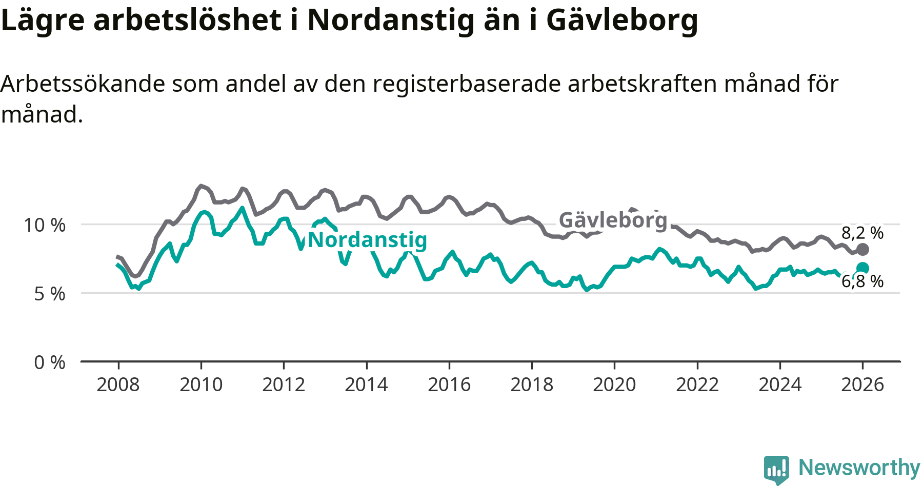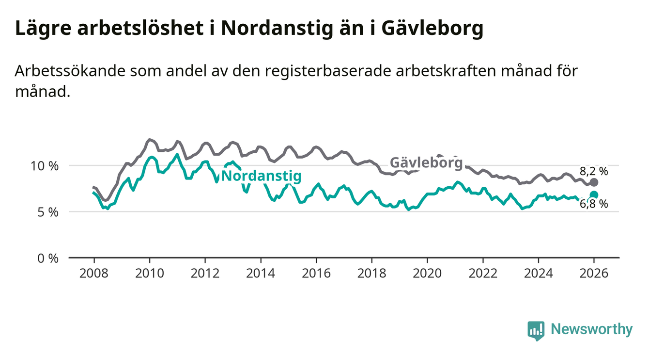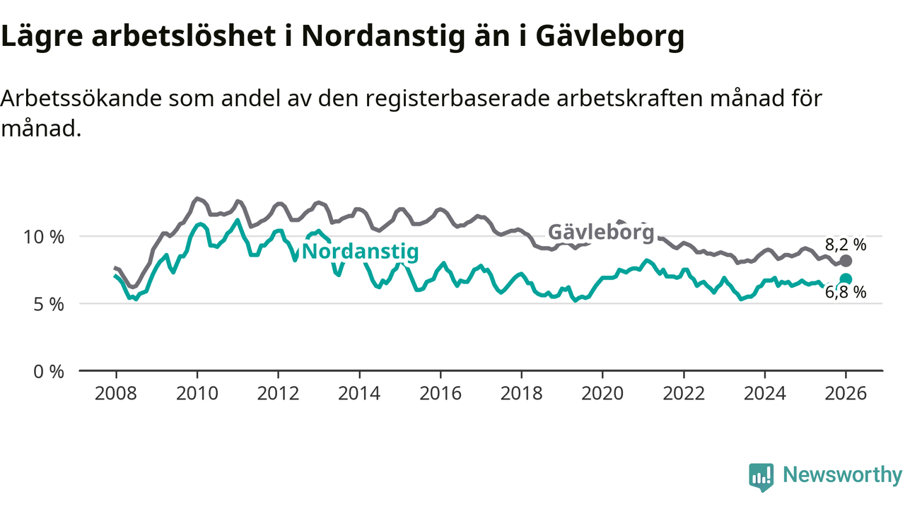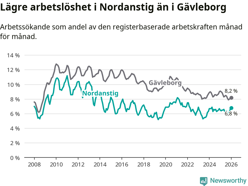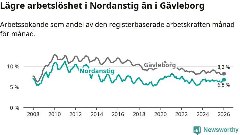 Under januari månad rapporterade Nordanstigs kommun en total arbetslöshet på 6,8 procent. Det är en ökning jämfört med samma tidpunkt i fjol (+0,3 procentenheter). I Gävleborgs län däremot sjunker arbetslösheten .