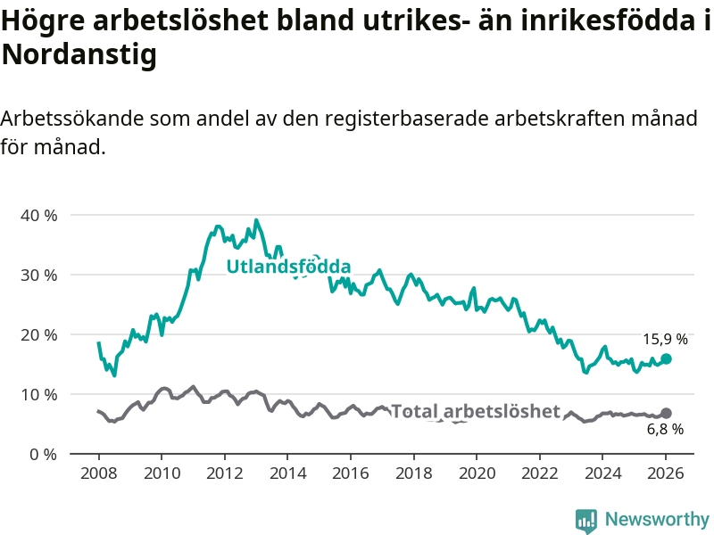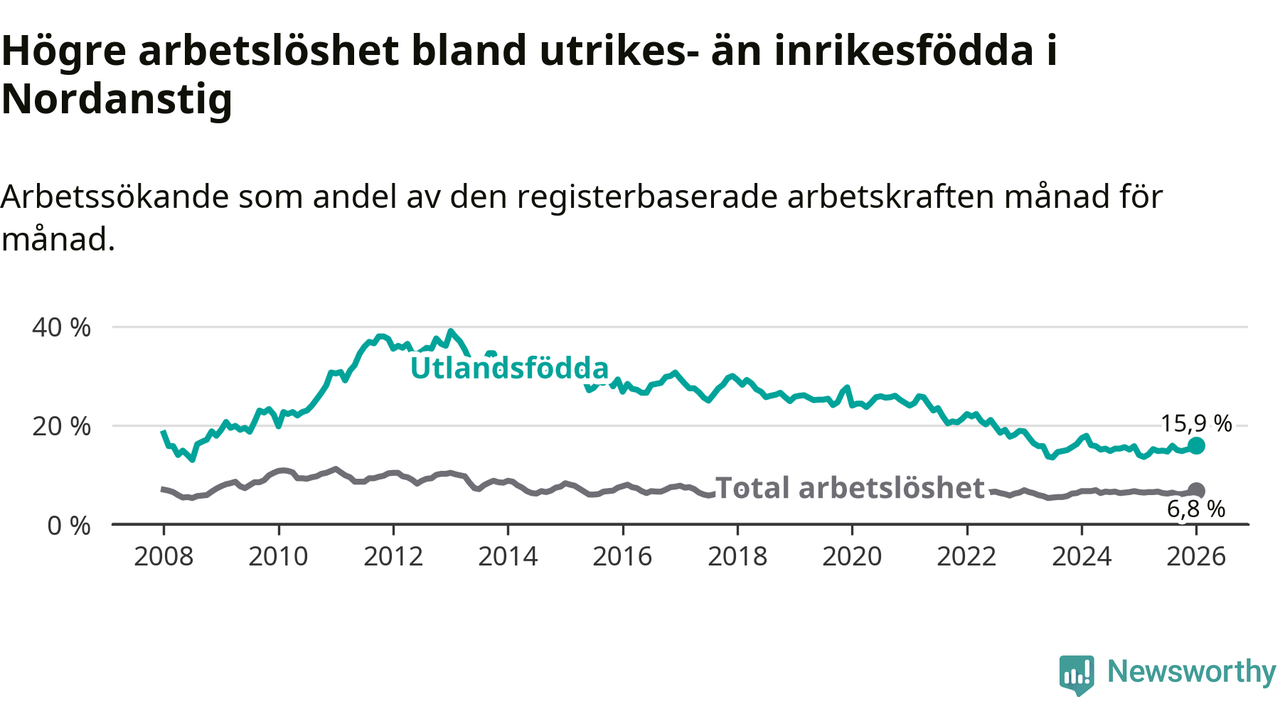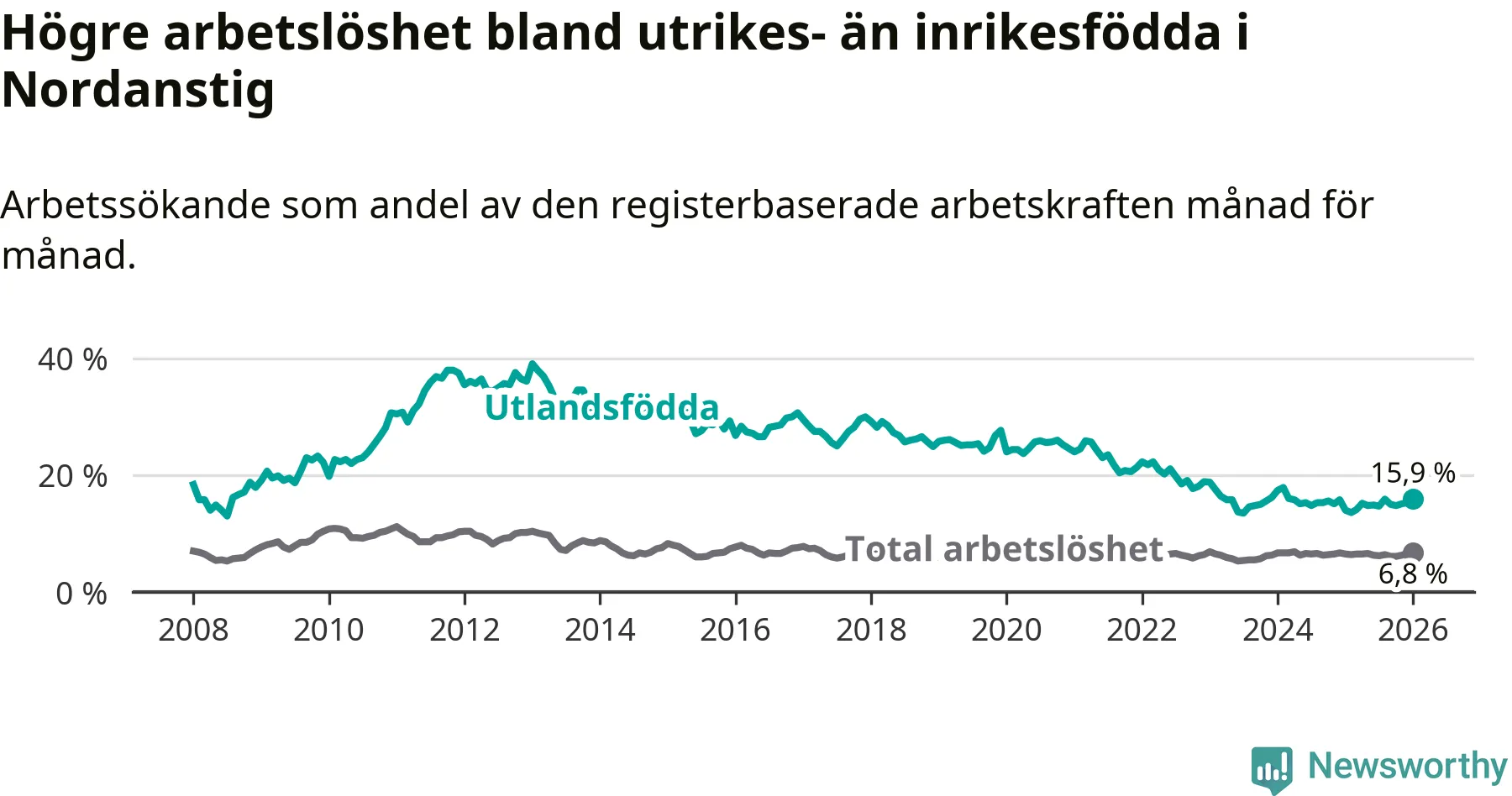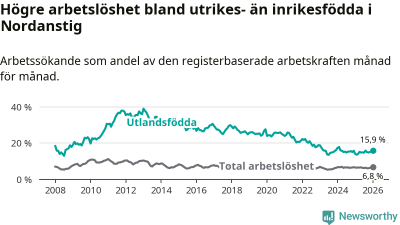 Arbetslösheten bland utlandsfödda var 15,9 procent i Nordanstig under januari månad, motsvarande 68 av 428 personer. Det är 1,9 procentenheter fler än vid samma tidpunkt i fjol (+7 om man räknar personer). Den senaste månadens uppgång innebär ett trendbrott. Under de ett föregående månaderna hade arbetslösheten bland utlandsfödda varit lägre än motsvarande tidpunkt året innan.