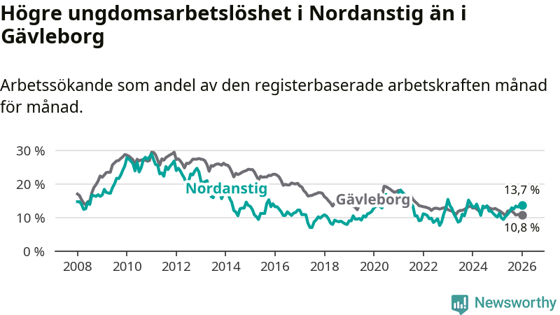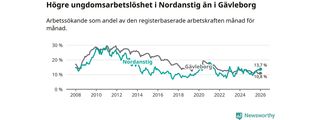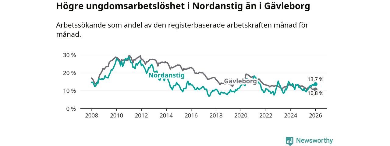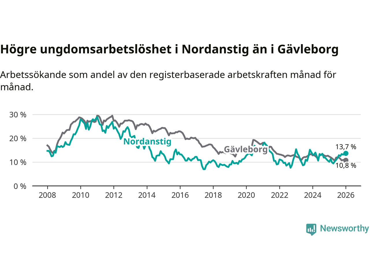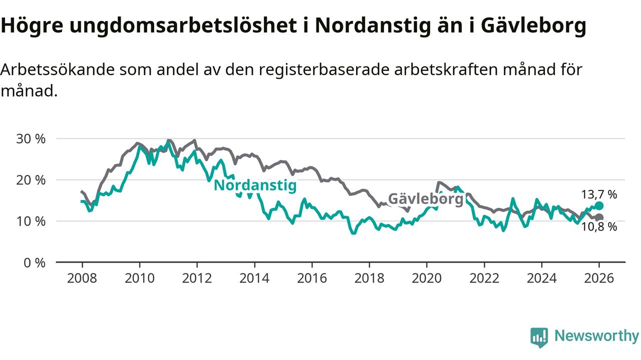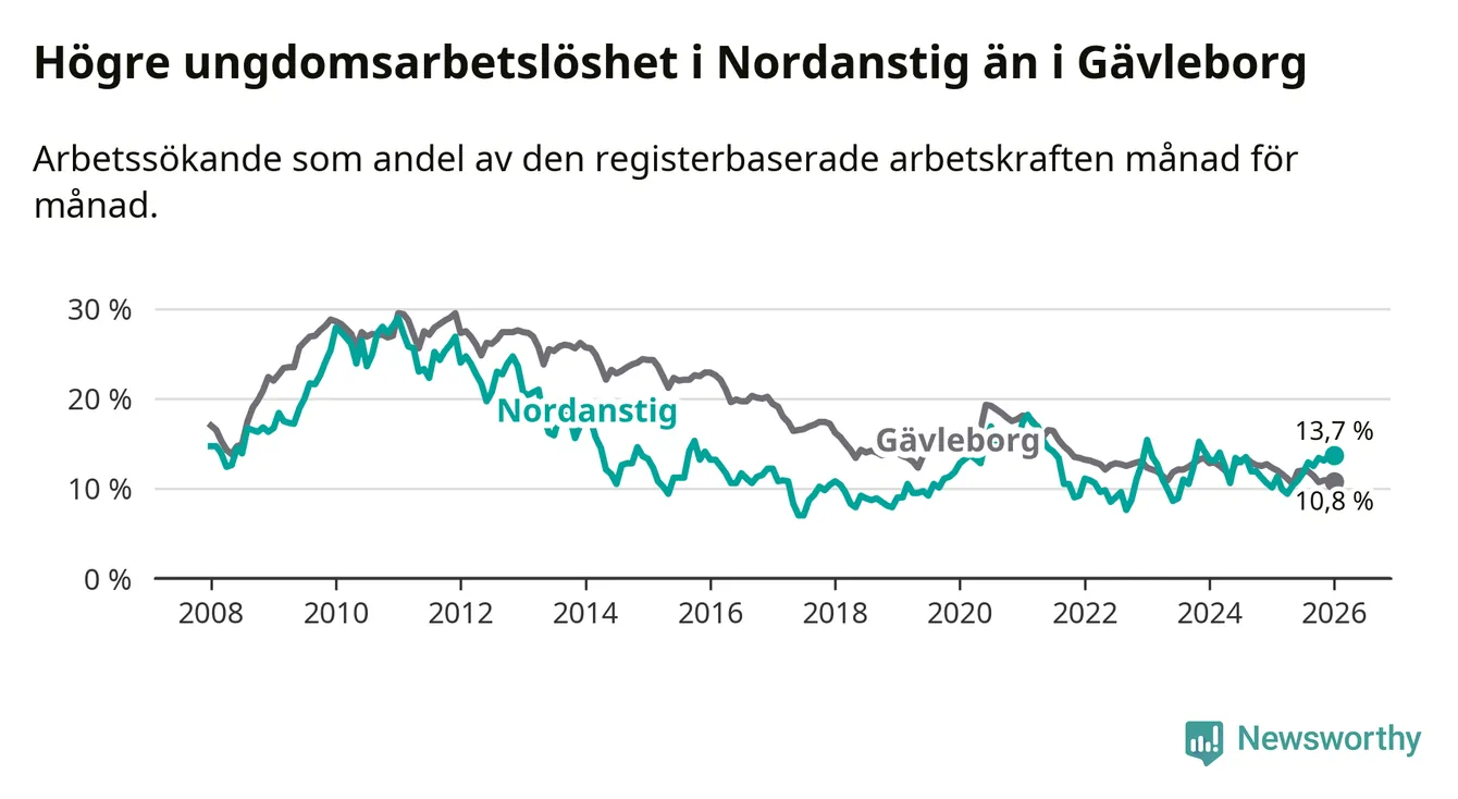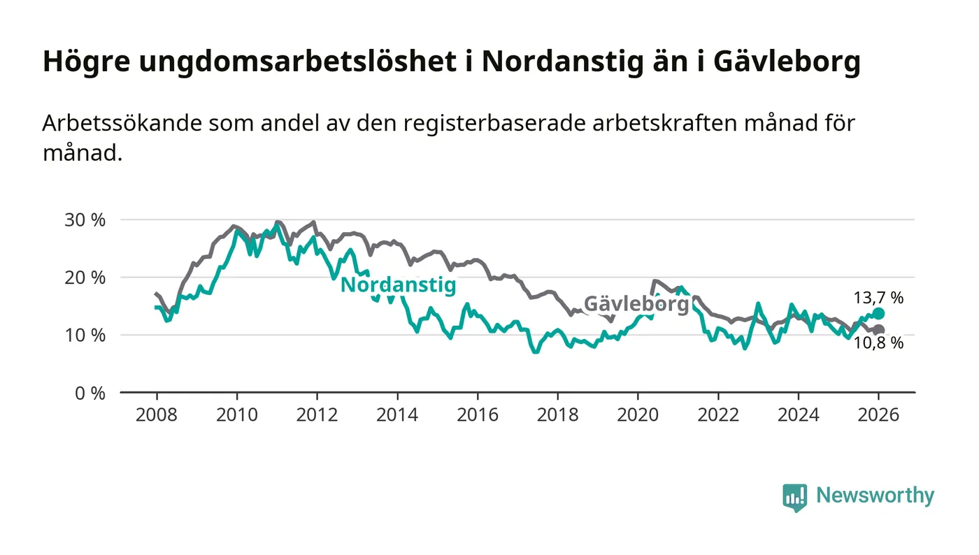 Medan Nordanstig har lägre total arbetslöshet än Gävleborg, ligger ungdomsarbetslösheten 2,9 procentenheter högre i Nordanstig.